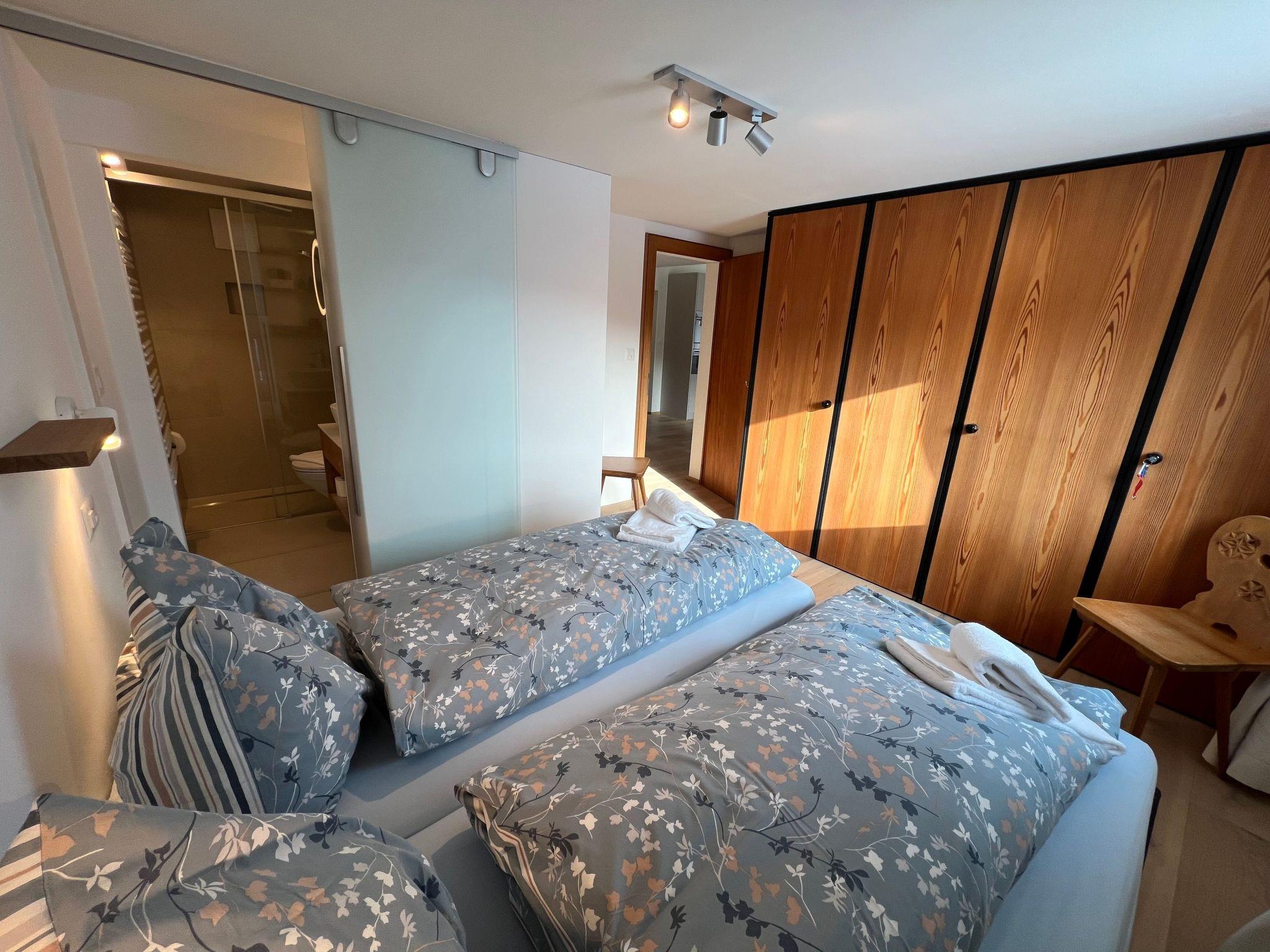 Inside, the flat offers an open, fully equipped kitchen with oven, fridge, Nespresso coffee machine, kettle, fondue and raclette set, toaster, which leaves nothing to be desired for culinary flights of fancy. The cosy living room is furnished with a sofa, dining table and TV, while the two bedrooms each have two single beds. The bathroom has a toilet, bathtub, shelf for towels, a washbasin with mirror and a hairdryer.