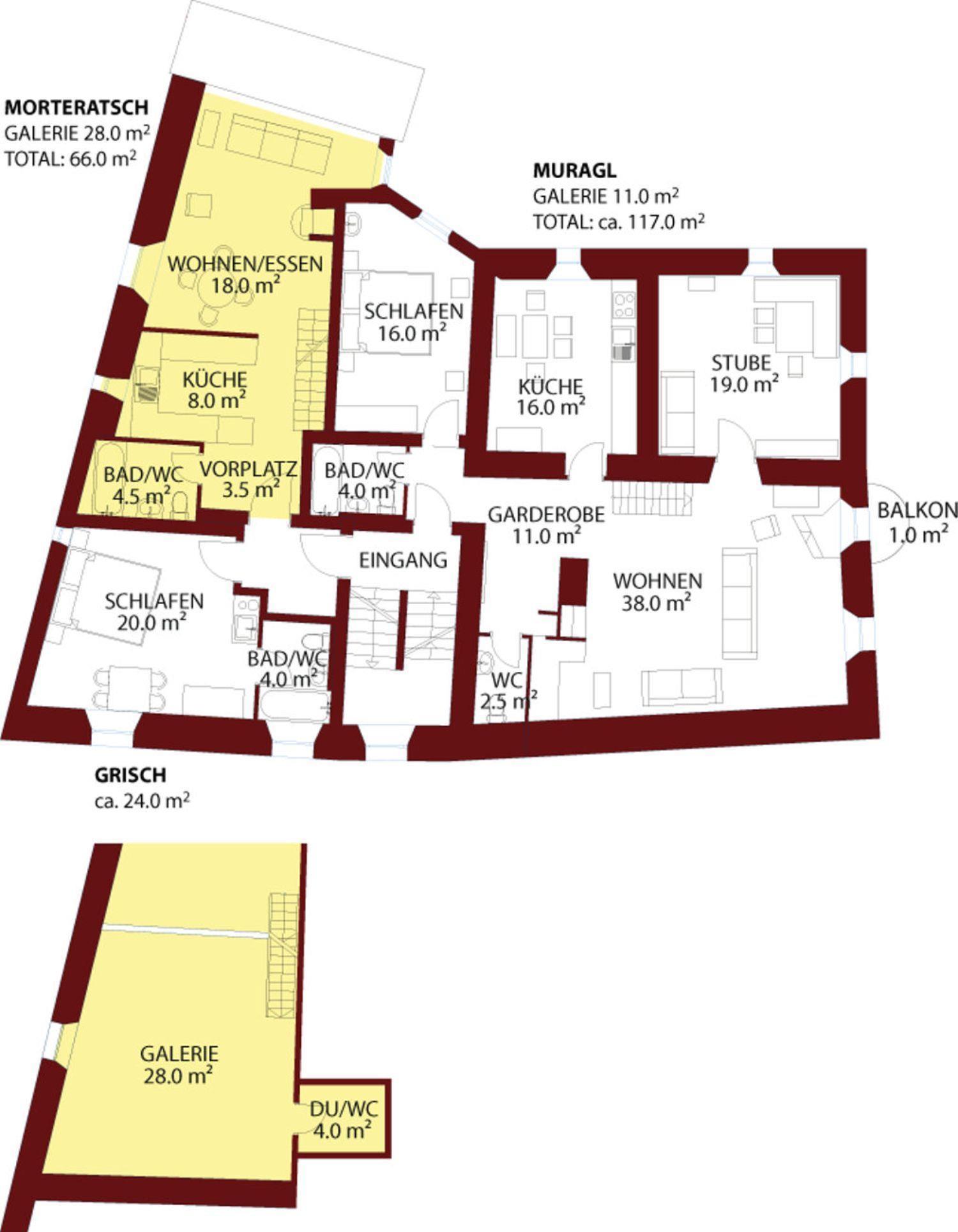 The Morteratsch flat enchants with its open-plan living and dining area, a fully equipped kitchen including a large fridge, oven, dishwasher and Nespresso machine, as well as a cosy Swedish stove. A staircase leads to the spacious gallery, which creates a particularly warm atmosphere with its 4 beds and wooden panelling. Two bathrooms - one with bath/shower, the other with shower/WC - emphasise the living comfort. The stylish Studio Grisch, adjacent to the roof maisonette, enriches the offer with its separate bedroom with two beds, a cupboard kitchen, Nespresso machine and its own bathroom with bath/shower and offers additional flexibility and privacy.