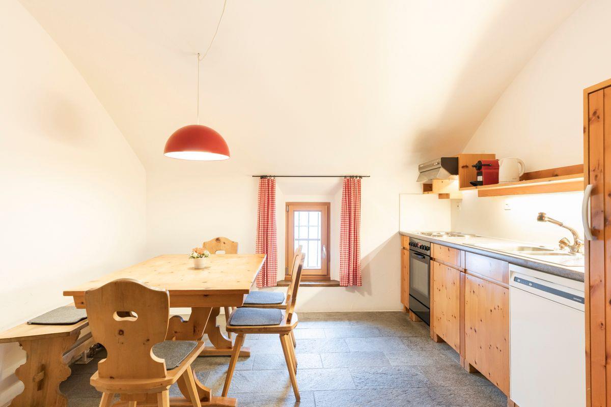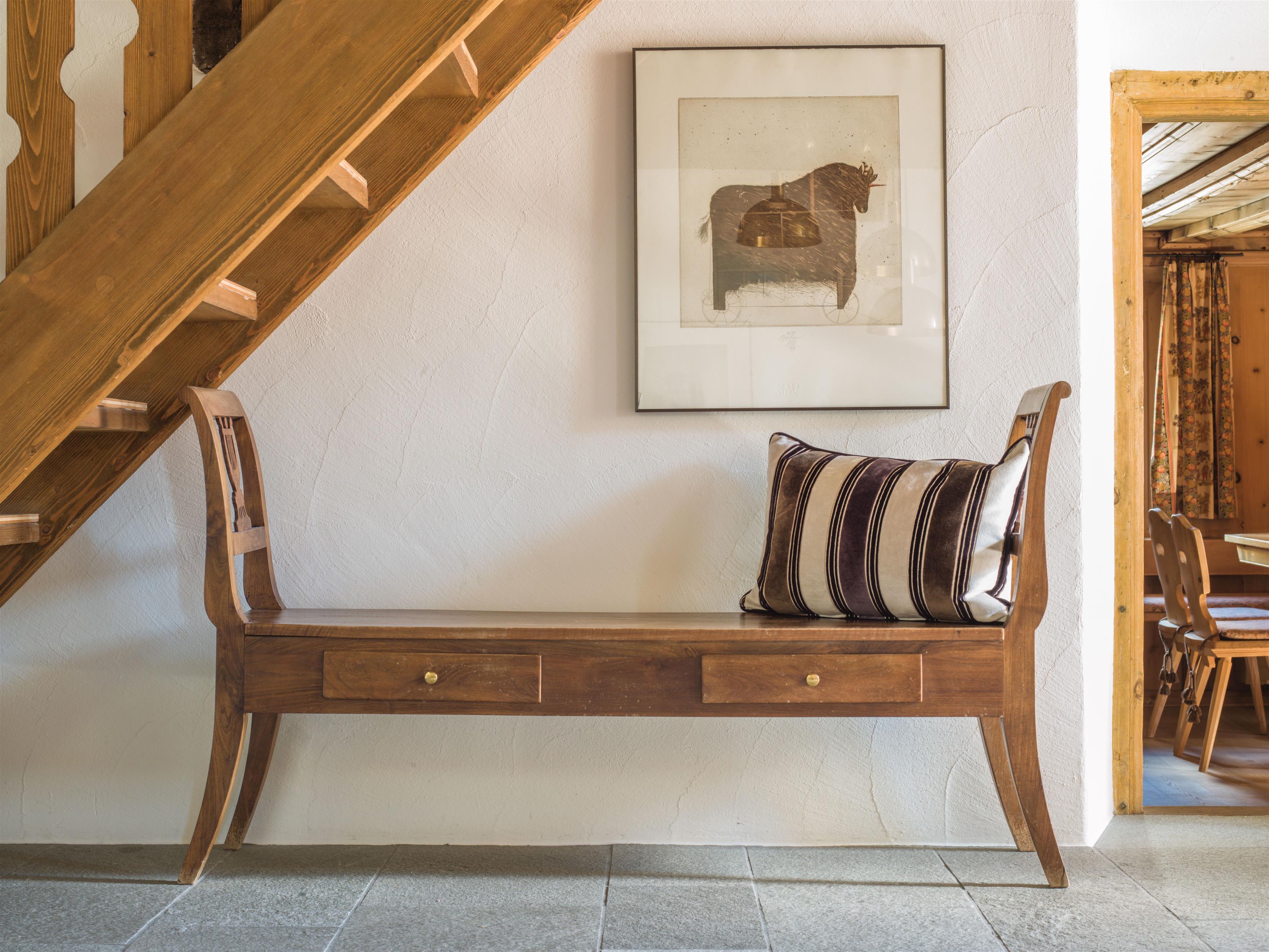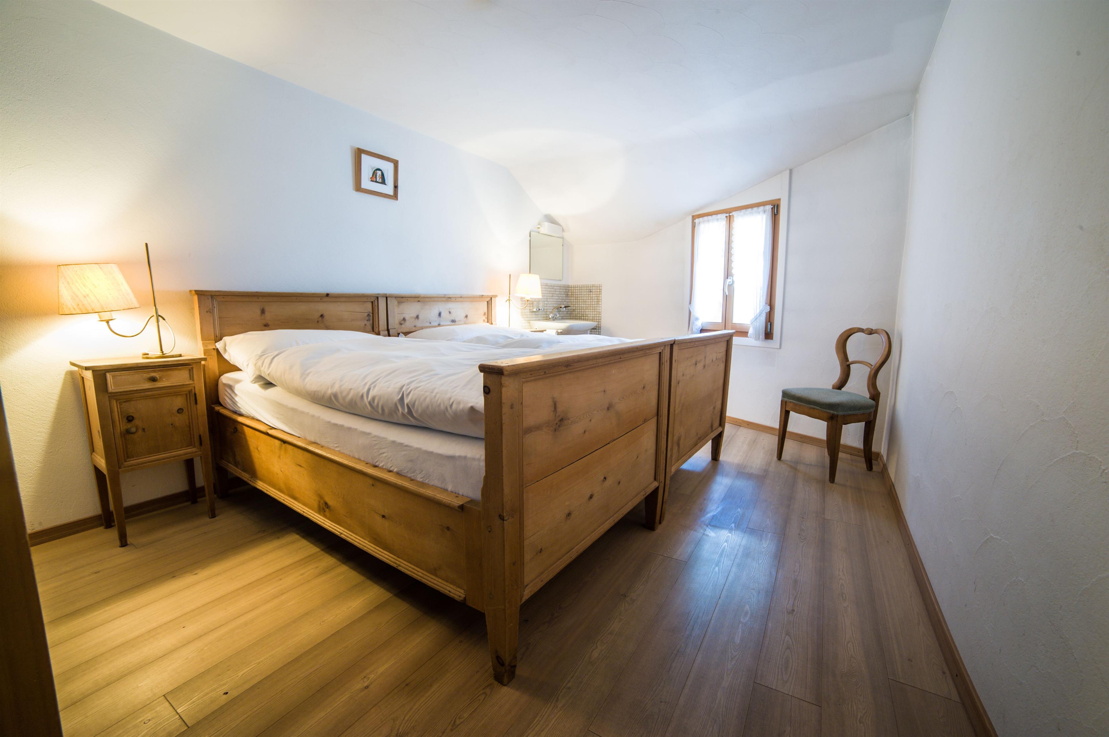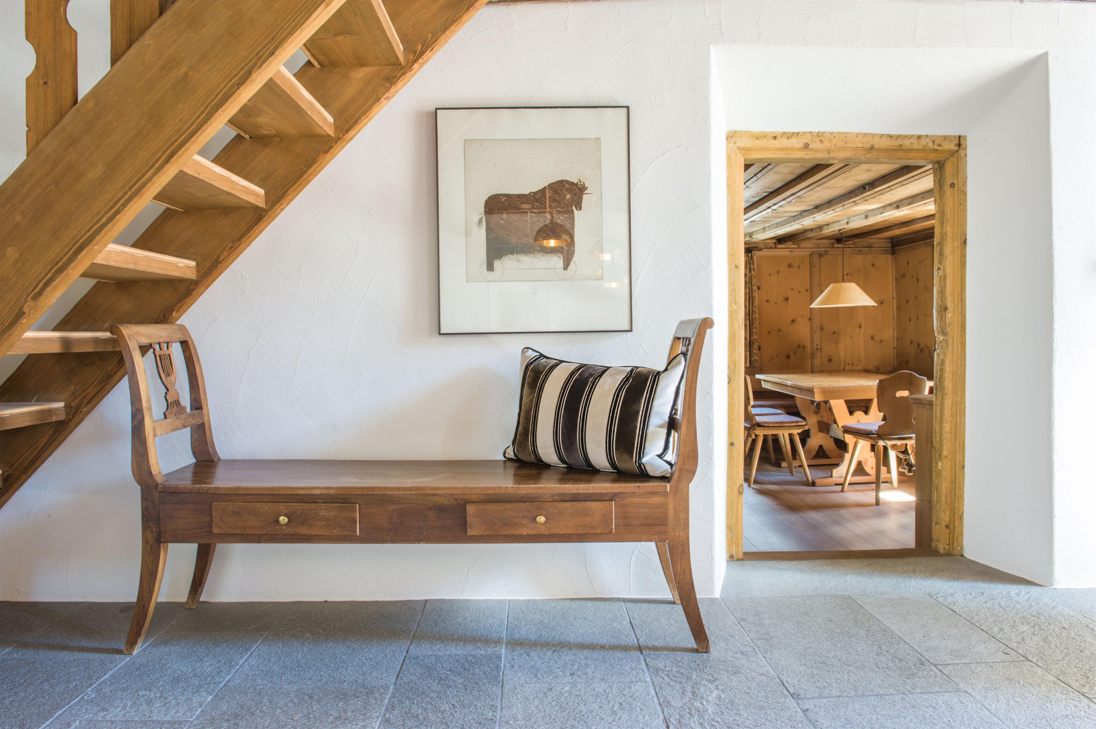 The interior design reflects the perfect symbiosis of traditional Engadine style and modern comfort. Its 117 m² are characterised by natural stone floors and fine parquet flooring with underfloor heating, a high-quality eat-in kitchen fully equipped with all modern amenities and a spacious living room with a breathtaking fireplace. The open gallery under the roof, a spacious bedroom with separate washbasin, an elegant bathroom and an additional separate WC complete the luxurious living ambience.
