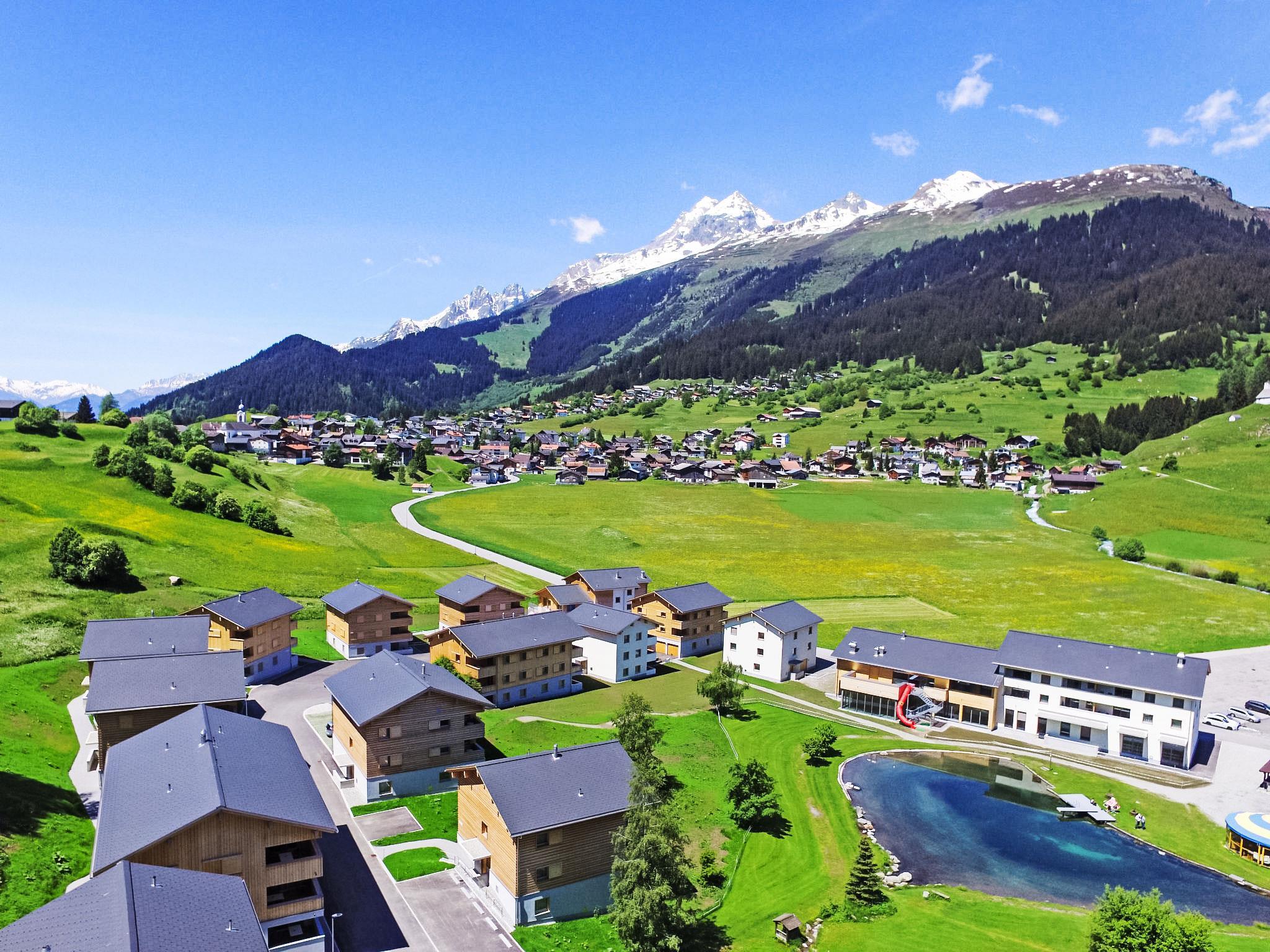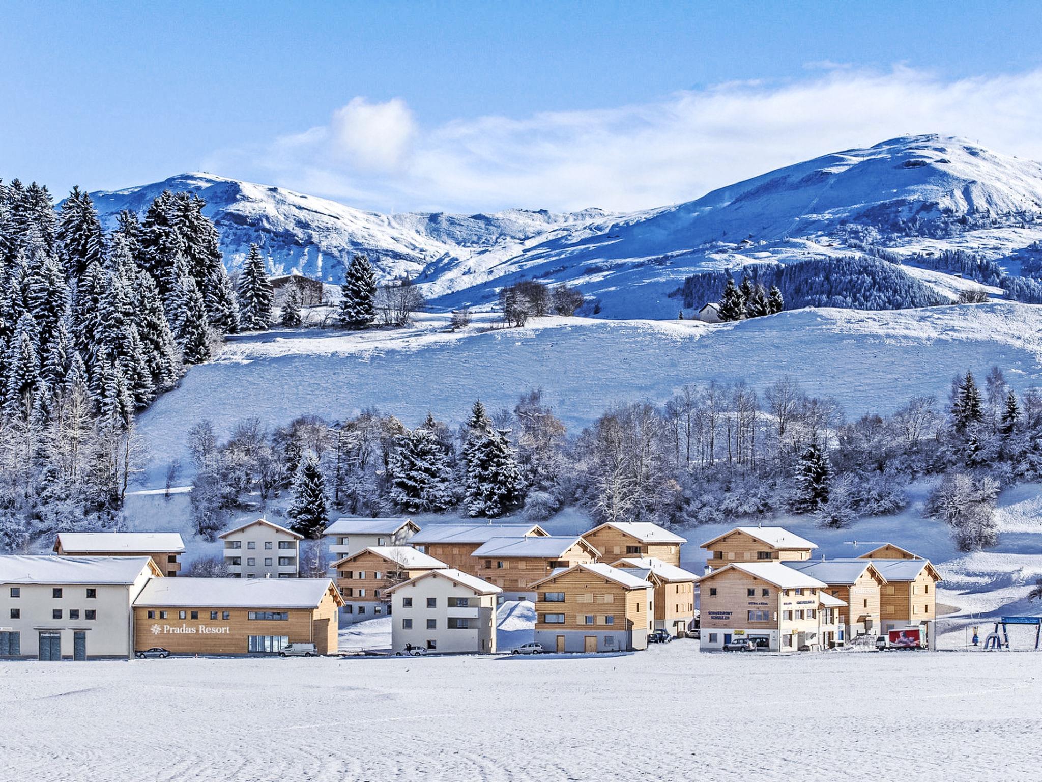 Child friendly, comfortable resort "Pradas Resort Brigels", 1'280 m a.s.l., built in 2015, surrounded by meadows. 16 houses in the resort. On the outskirts, 400 m from the centre, in a quiet, sunny position, 50 m from the lake, 100 m from the skiing area. For shared use: property, park, lawn for sunbathing, indoor pool heated (16 x 8 m). Shower/WC in the pool area, children's pool, slide, outdoor shower, nat. Swimm. Pond, tennis (extra), table tennis, volleyball court, fireplace, children's playground (slide). In the complex: reception, WiFi, sauna, massage (extra). Hot tub, relaxation room, playroom, table football, storage room for bicycles, storage room for skis, central heating system, washing machine, tumble dryer (for shared use), ski boot dryer, bicycles available (extra). Available: sledges (extra). Linen change daily (suppl. charge extra). Towel change daily (suppl. charge extra). Room cleaning on request (extra). Bread roll service (extra). Storeroom available. Motor access to the house (mountain road). In Winter: please take snow chains, 4x4 car recommended in winter. Parking at the house. Grocery 500 m, restaurant 100 m, bakery 400 m, bicycle rental 10 m, bus stop 300 m, bathing lake 50 m. Golf course (9 hole) 600 m, tennis 300 m, minigolf, walking paths from the house 10 m, chair lift 100 m, skisport facilities 100 m, slopes, ski rental 50 m, ski school 50 m, children's ski school 50 m, ski-kindergarten 50 m, sled run 100 m, cross country ski track, ice rink 50 m, children's playground 200 m. Well-known ski regions can easily be reached: Brigels-Waltensburg-Andiast. Please note: suitable for families, baby equipment on request. In case of good snow conditions, the house is accessible on skis. The photo is just an example. Included in the price: Kids Club Prada (unlimited entry, unaccompanied), Oase Prada (Spa of 500m2, with indoor pool, hot tub, children's pool, sauna, hammam), free use of the cable car in summer and autumn, than other offers in the area and other discounts.