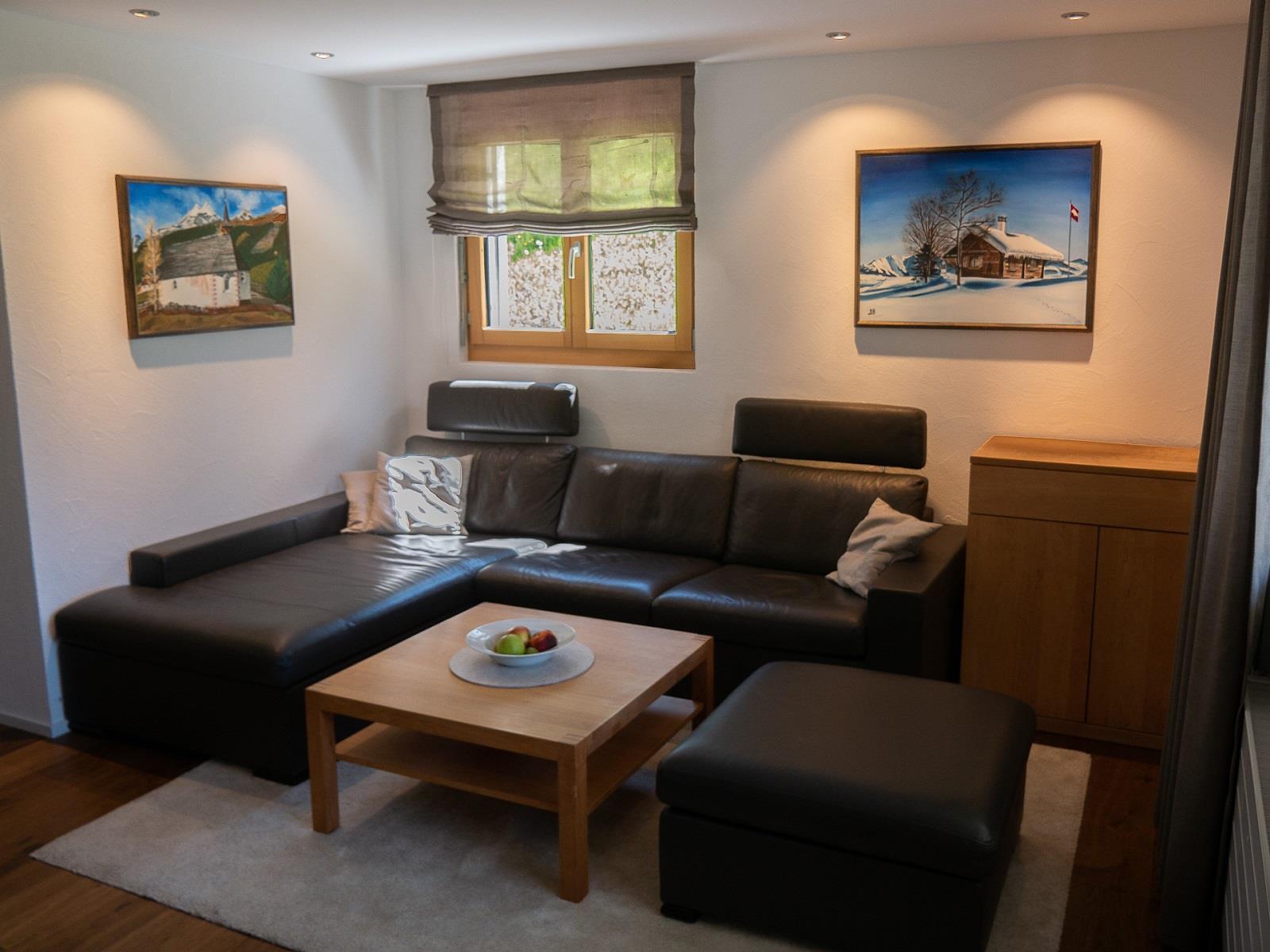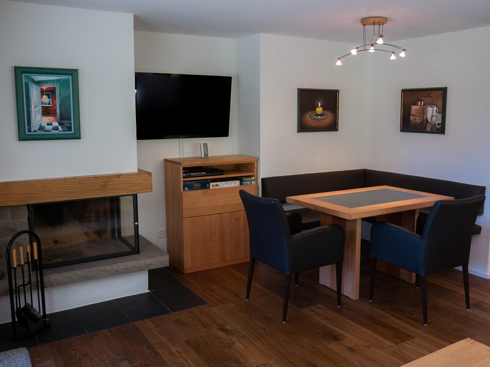 Wohnstube mit geschlossenem Kamin, großem Ledersofa mit Couchtisch sowie gemütlichem Essplatz mit Leder-Eckbank. Großer Flachbildschirm (108 cm Diagonale) mit digitalem SAT-TV (auch Schweizer Sender verfügbar), BluRay-Player, AppleTV. Kostenloser WLAN. Küche: