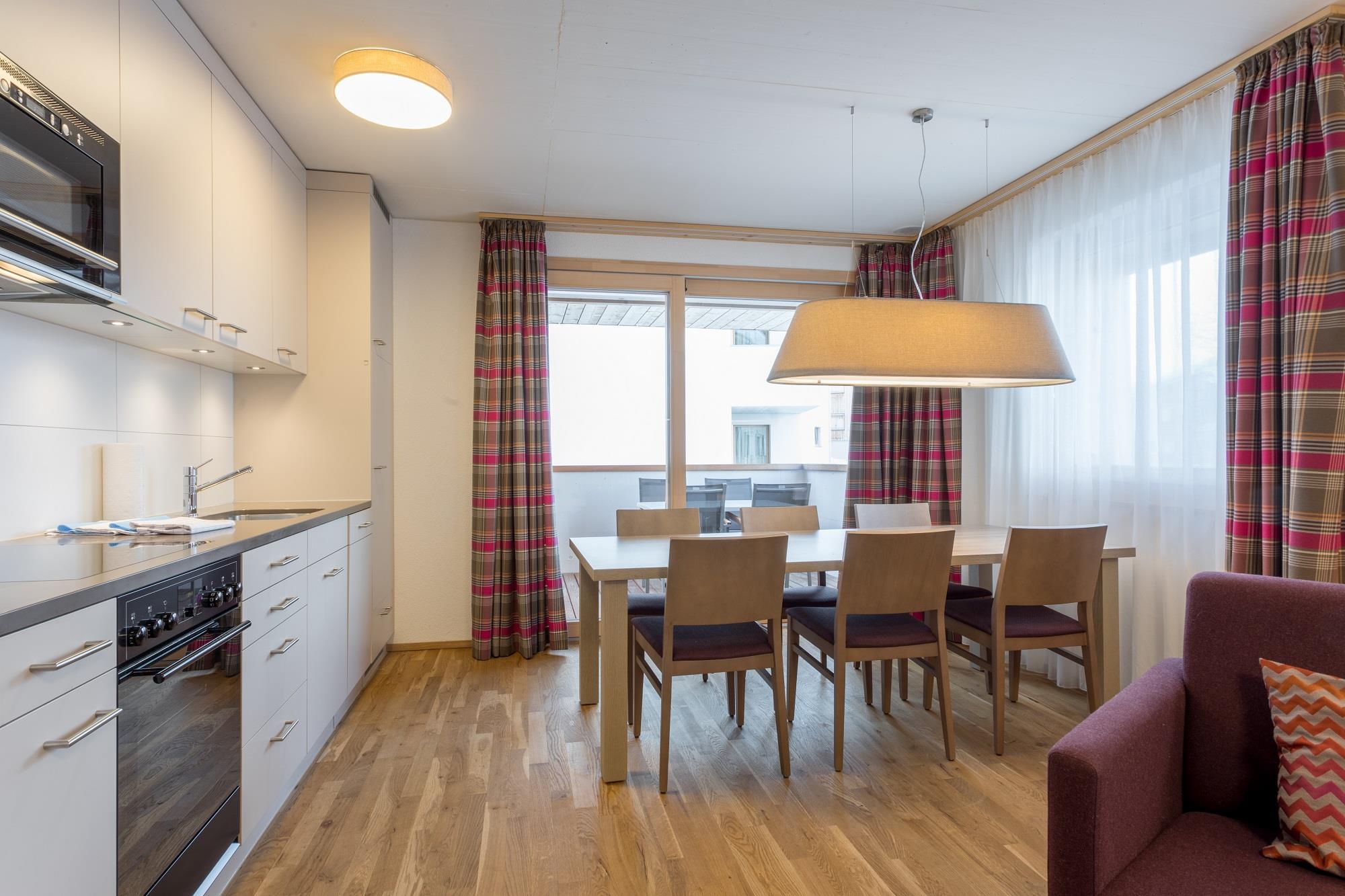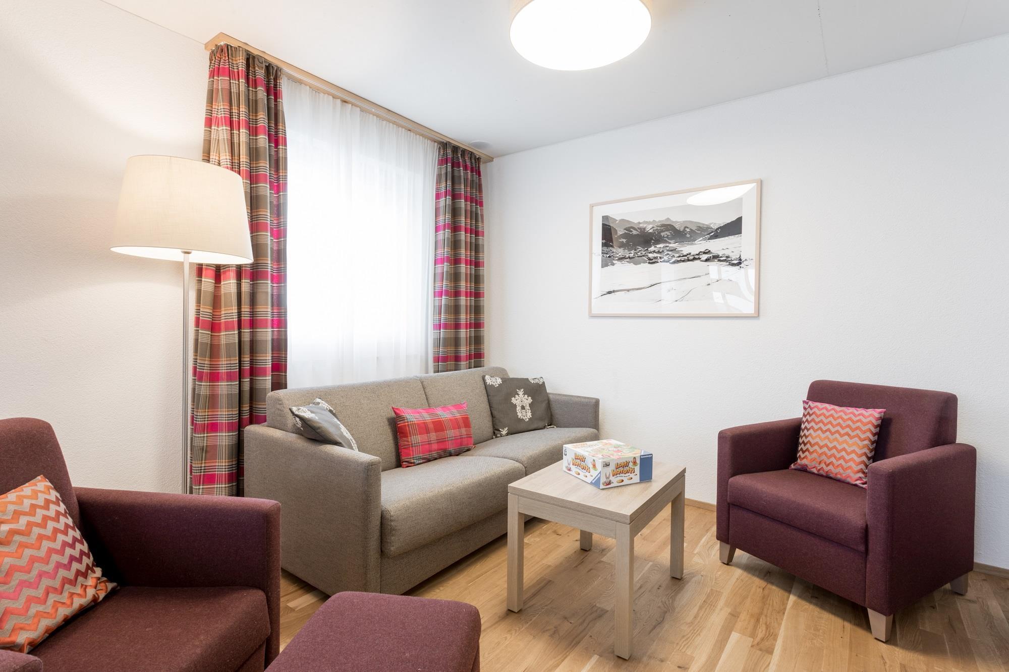 The contemporary designed apartments at the resort with alps Pradas send Interior sashes have a great view of the impressive mountains of the Brigelser horns. All have a balcony or patio.
