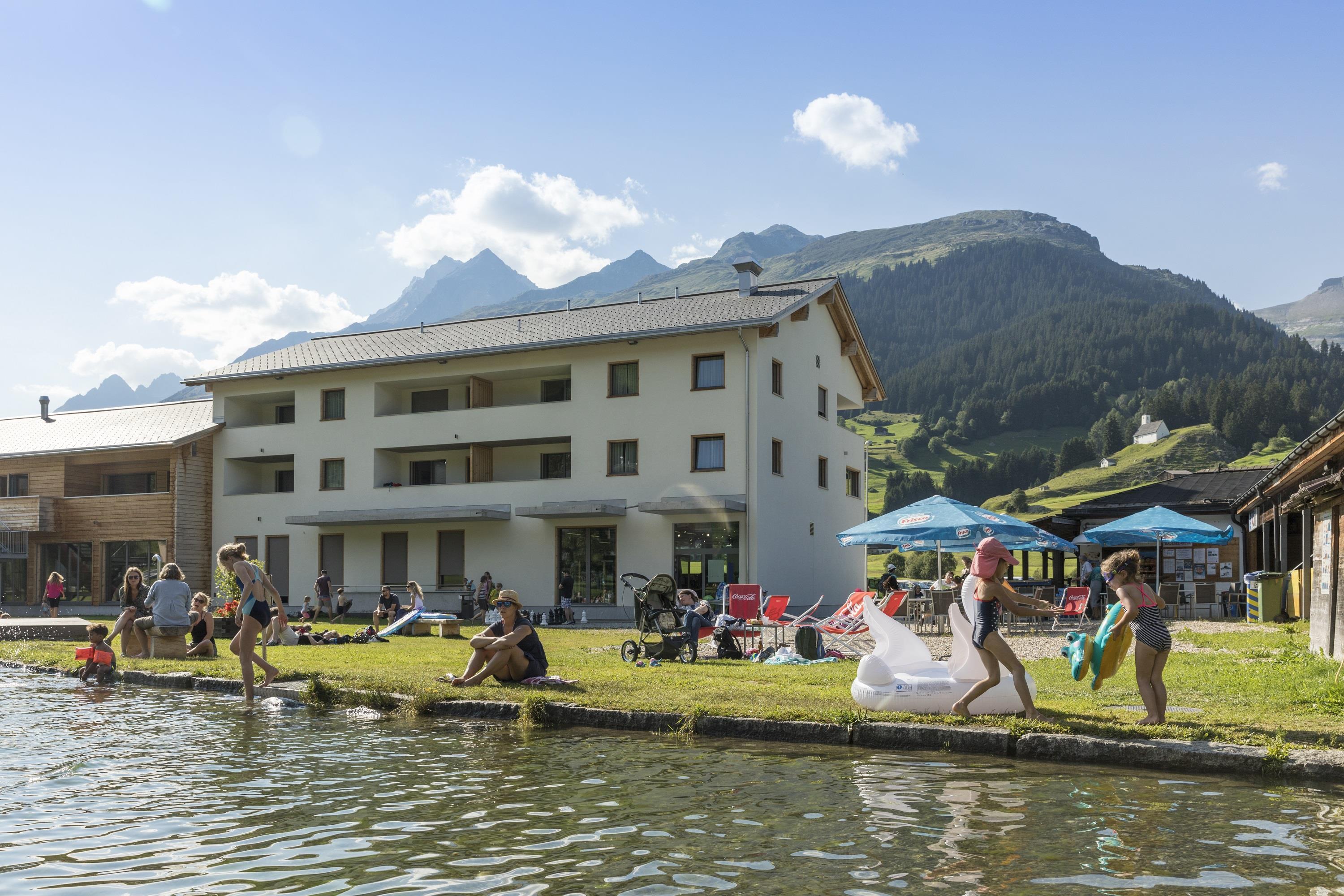 The Holiday Resort Pradas in Brigels (1280 m above sea level. M.) includes 16 cottages with 83 apartments from 1½ to 4½-room and a main building with a reception desk, an indoor swimming pool with whirlpool and children's wading pool (400m2), a sauna area (135m2), a Kids World, a shop and an Intersport sports shop. The architectural style blends architecturally with its surroundings of the Grisons mountain village Brigels. Thanks to ecological construction in Minergie standard, the resort Pradas guarantees an economical energy balance and a high level of comfort (comfort, air quality).