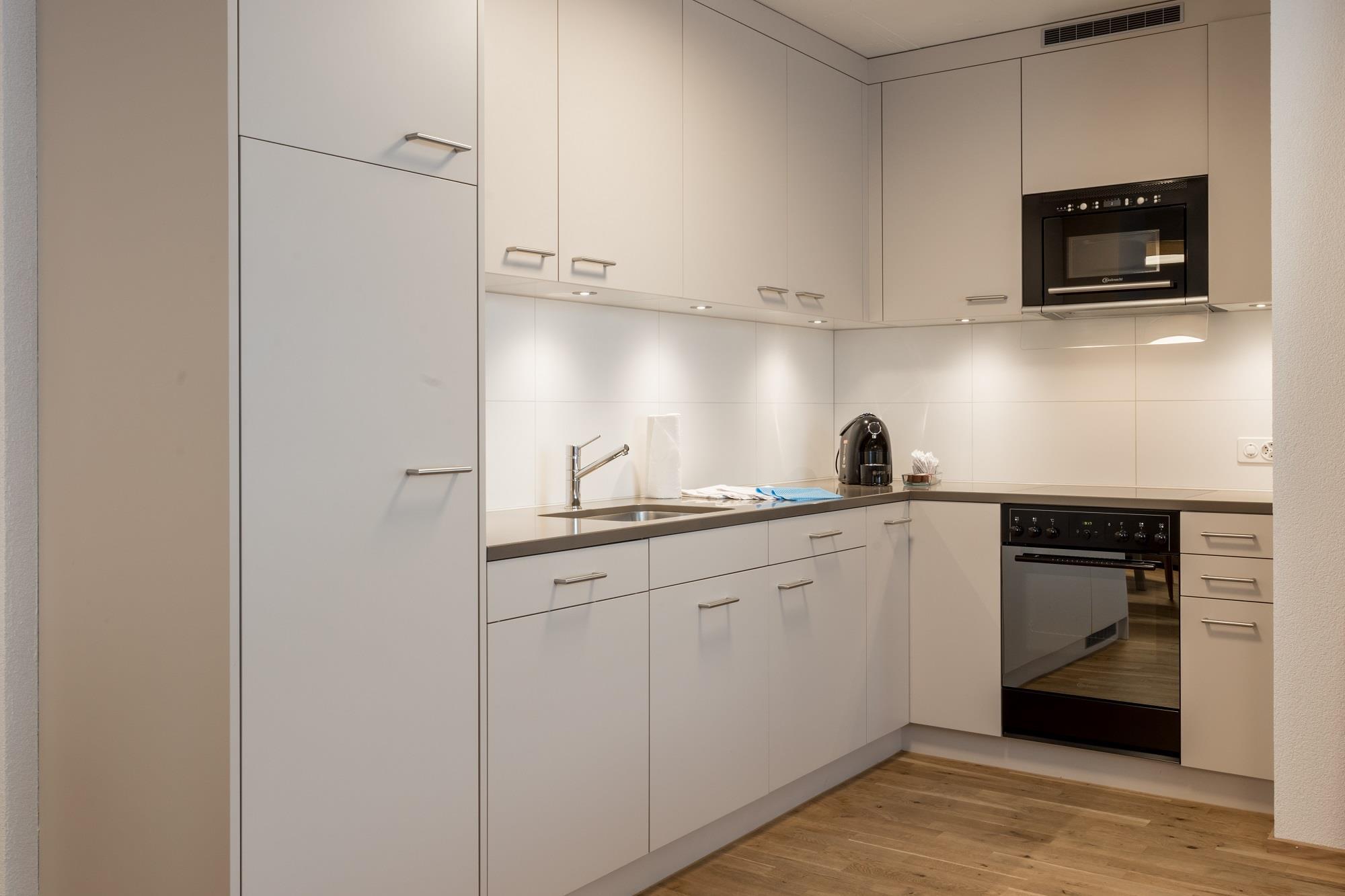 All 4 ½-room apartments are equipped with 8 high-quality beds (2 bedrooms with a double bed 180x200 cm with 2 mattresses, 1 bedroom with 2 single beds 90x200 cm, 1 divan bed bed 180x200 cm for 2 people in the living / dining room), 2 flat screen TV (cable with more than 80 digital TV channels and 100 digital radio stations), an open modern, top-equipped kitchen (with 4 ceramic plates and extractor fan, microwave, fridge freezer, dishwasher, oven, capsule coffee) including complete and high-quality kitchen equipment (glasses, plates, cutlery, pans, cooking accessories sämtliches etc.) and balcony (furnished) or patio (ground floor) and 2 bathrooms (1x modern glass shower / WC, 1x bath / WC). All floors are equipped with oak parquet. In the apartments wireless internet is available for free. 1 parking space per apartment is included.