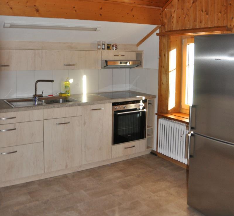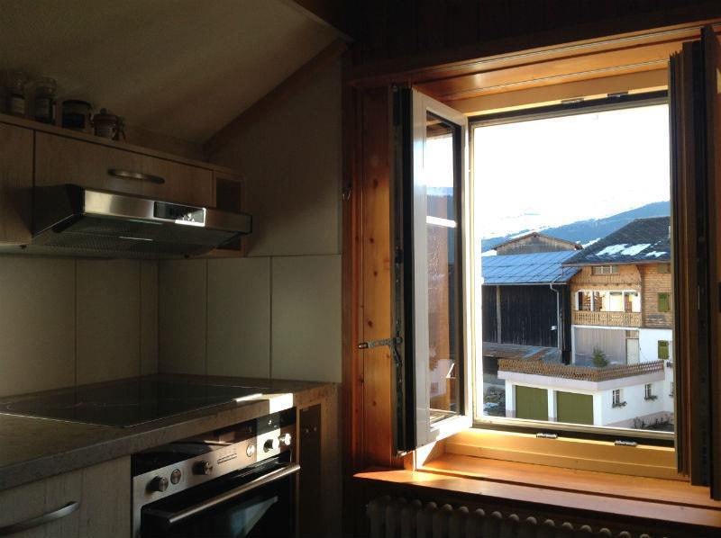 Der offene Wohn-/Küchenbereich hat einen grossen, antiken Holztisch mit sechs Stühlen, eine bequeme Designer-Polstergruppe, einen Flachbildschirm-Fernseher und eine wunderbare Aussicht über die Brigelser Dächer in die Bergwelt. WLAN ist in der ganzen Wohnung (kostenlos) vorhanden. Küche: