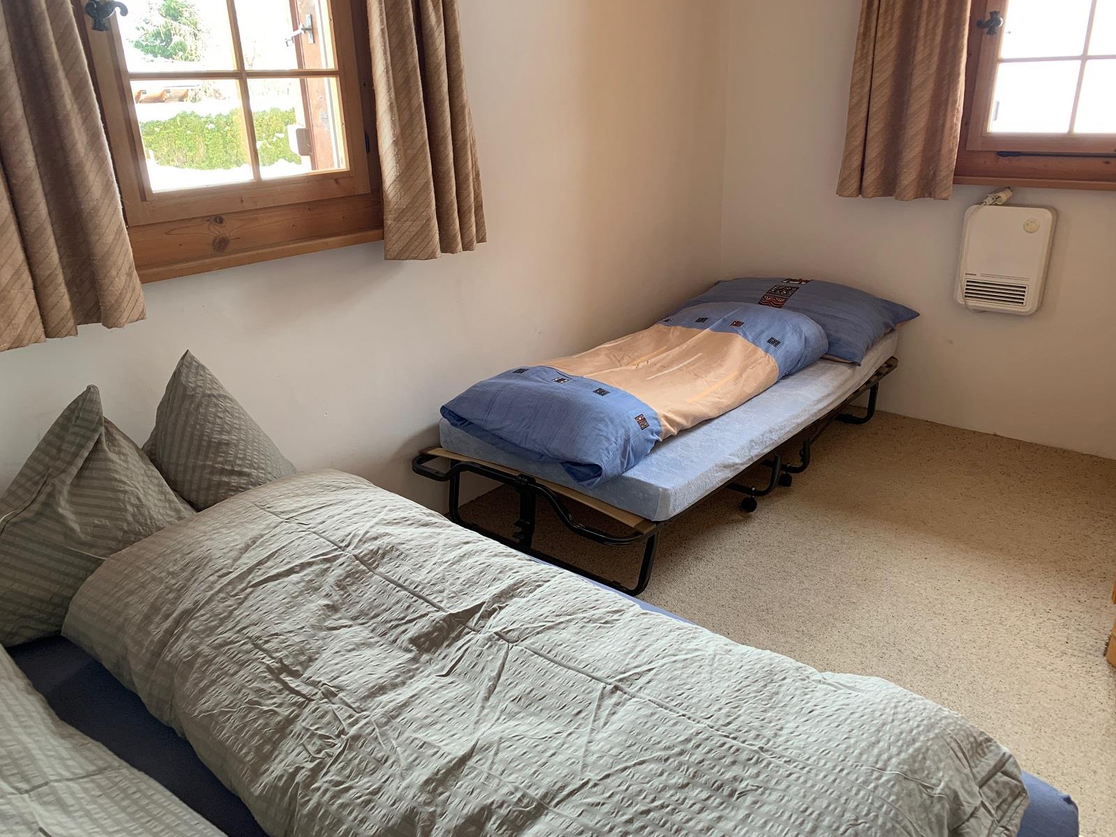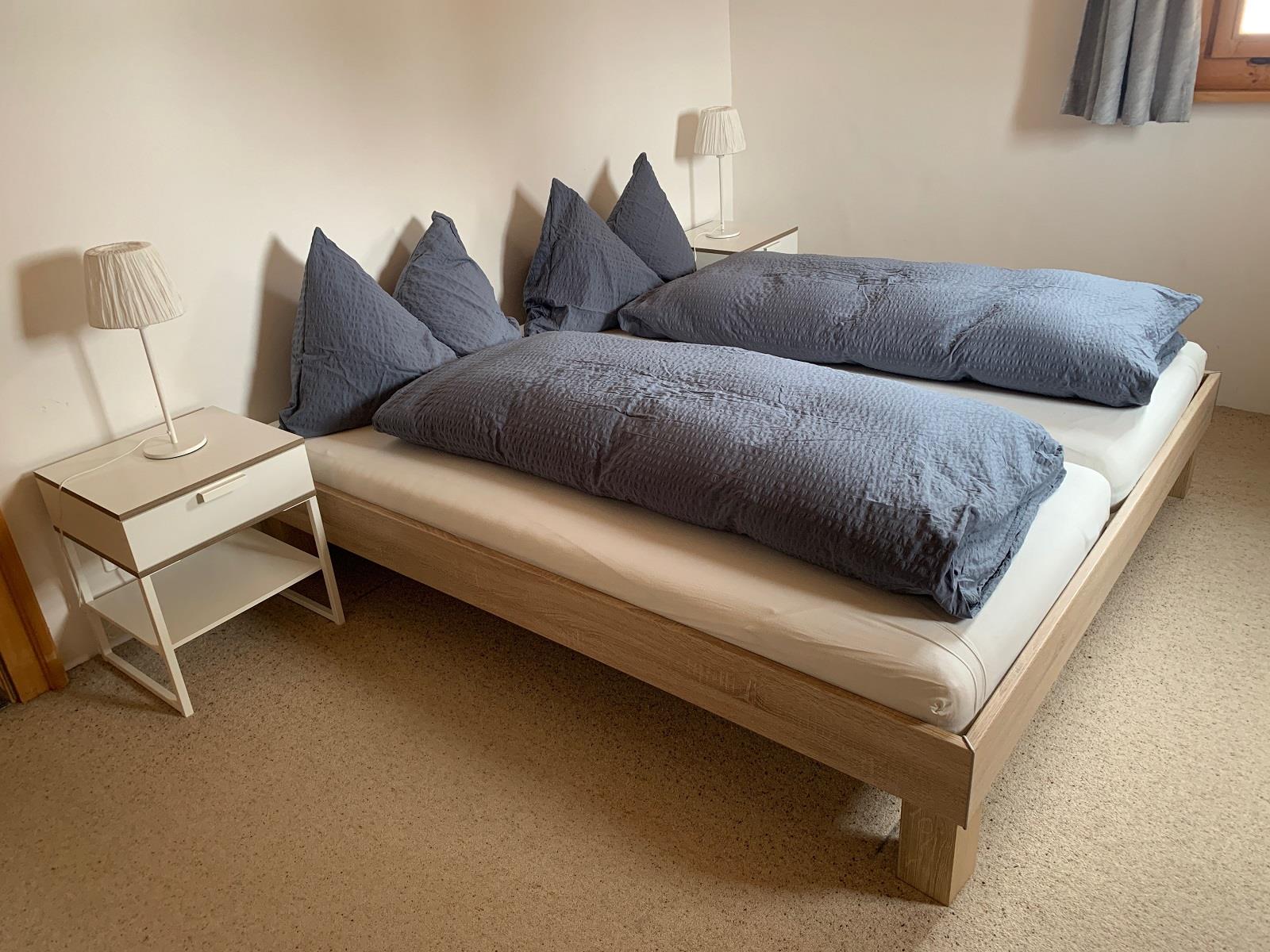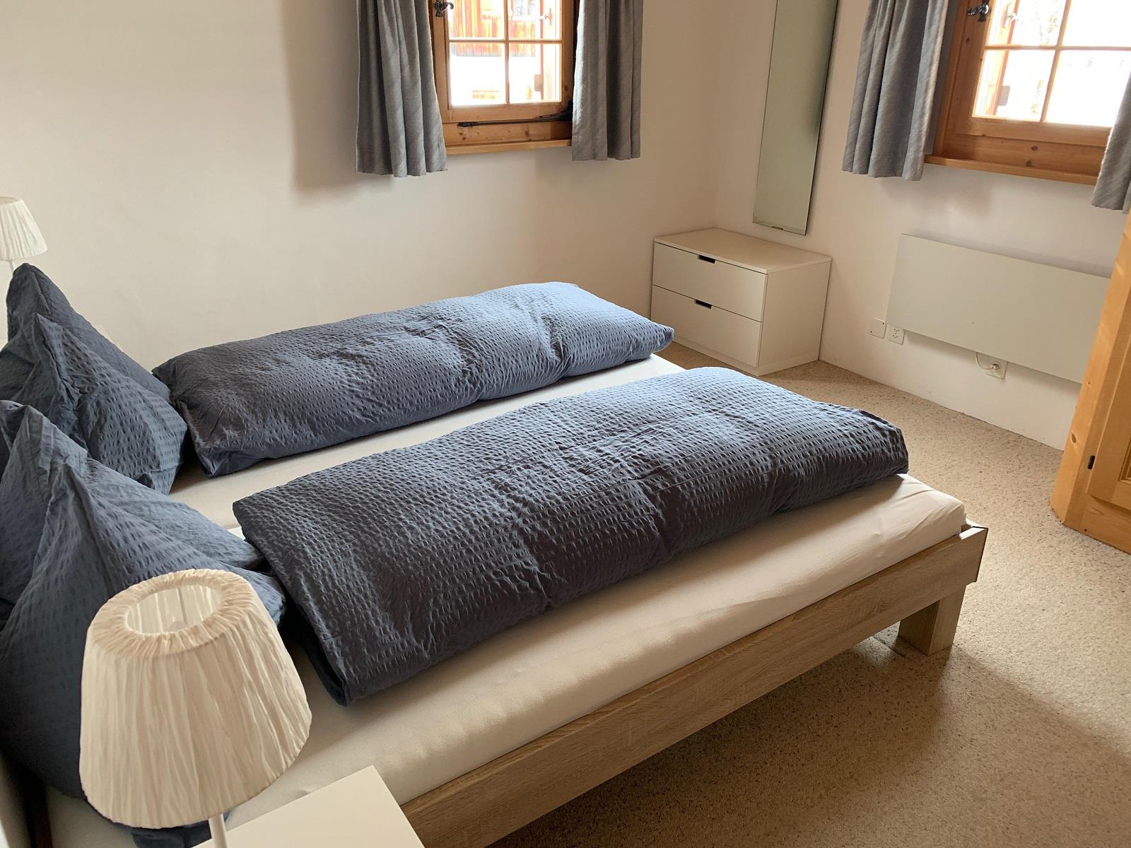 2 Schlafzimmer: Ein geräumiges Schlafzimmer mit grossem Doppelbett und ein kleineres Schlafzimmer mit einem Doppelbett sowie einem Zustellbett. Beide Schlafzimmer verfügen über Kleiderschränke. Die Bettwäsche ist im Preis inbegriffen. Wohnzimmer: