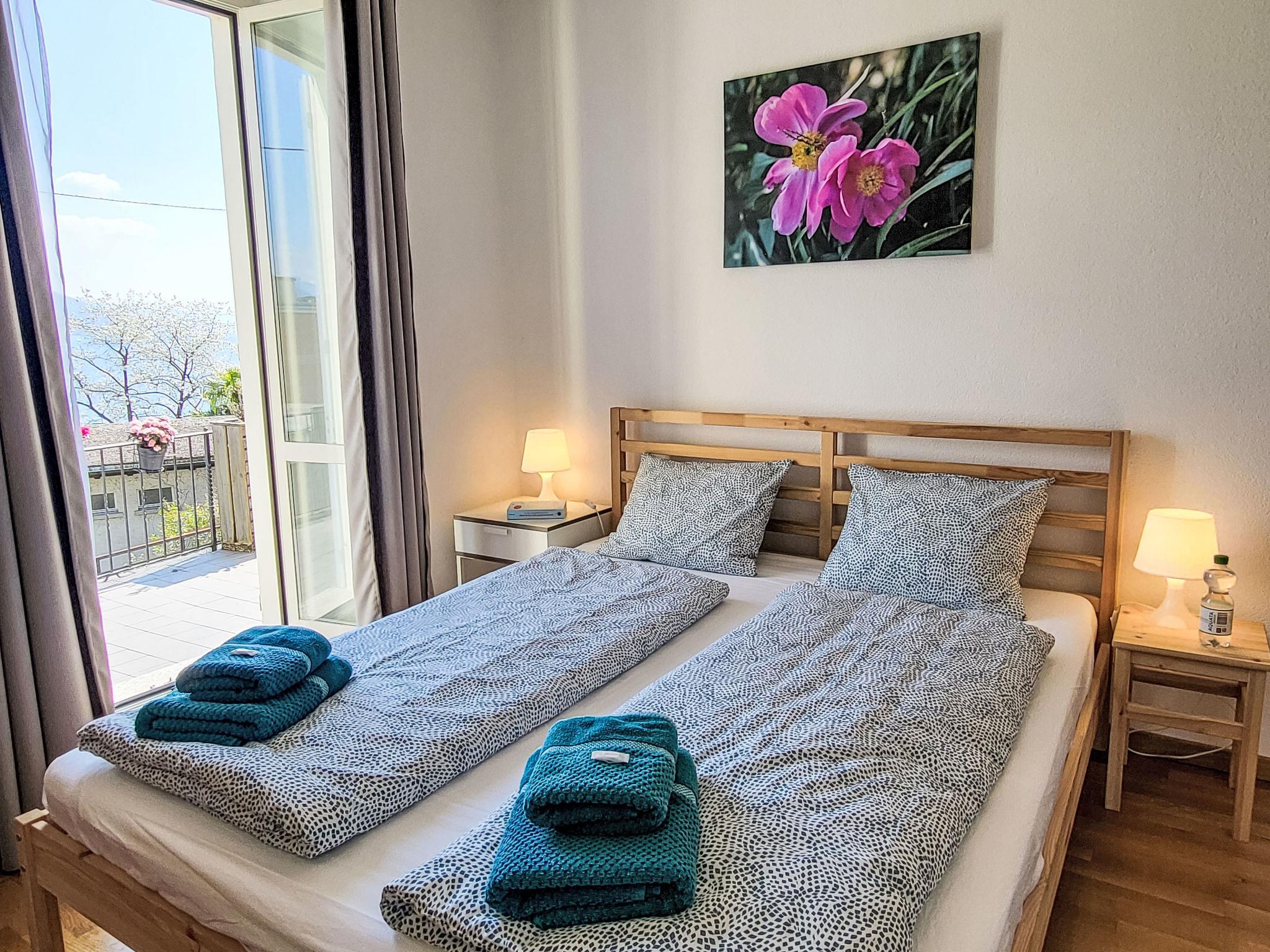 "Casa Stella App. 1", 2-room apartment 50 m2, on the ground floor, south-east facing position. Object suitable for 2 adults + 1 child. Spacious and bright, partly renovated in 2021, beautiful and modern furnishings: open living/dining room with 1 sofabed (140 cm, length 190 cm), dining table, cable TV and international TV channels (flat screen), radio. Exit to the terrace, south-east facing position. 1 double bedroom with 1 double bed (160 cm, length 200 cm). Exit to the terrace. Open kitchen (oven, dishwasher, 4 ceramic glass hob hotplates, electric coffee machine, Capsules for coffee machine (Tassimo) extra). Shower/WC. Parquet floors. Terrace partly roofed, south-east facing position. Terrace furniture. Beautiful panoramic view of the lake, the mountains and the countryside. Facilities: hair dryer. Internet (WiFi, free). Parking space n 1 at the house. Please note: apartment street side. Non-smokers only. NL-00003316