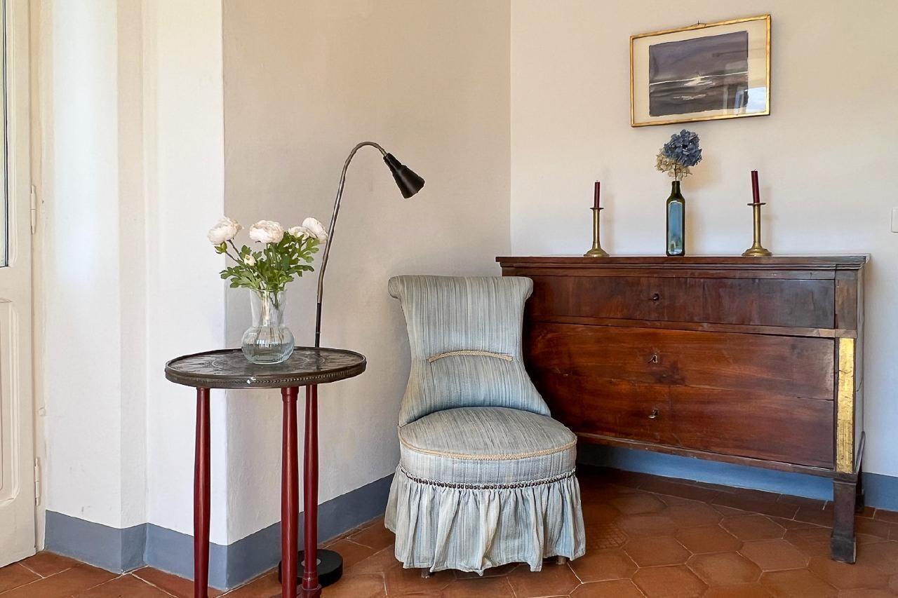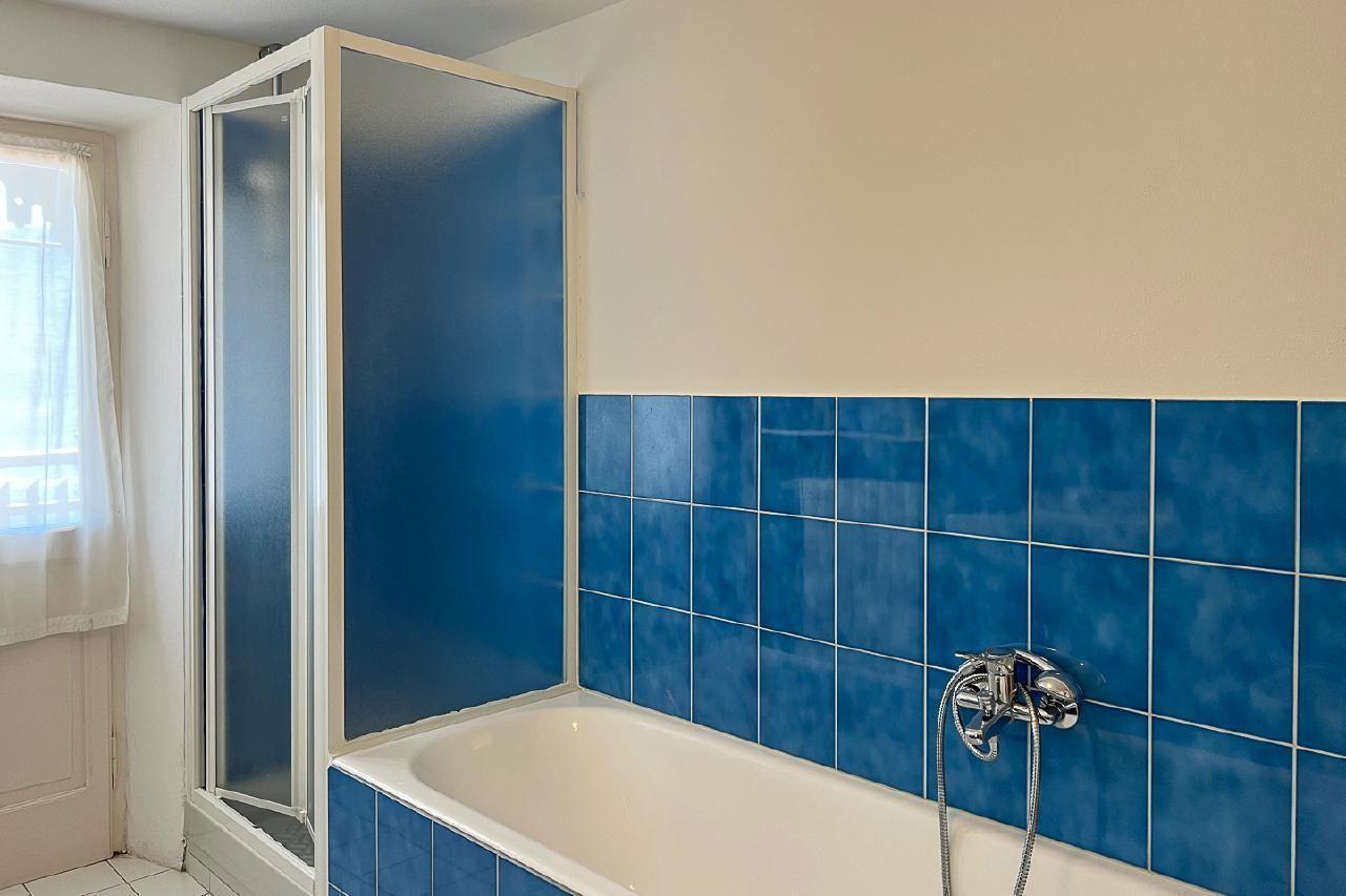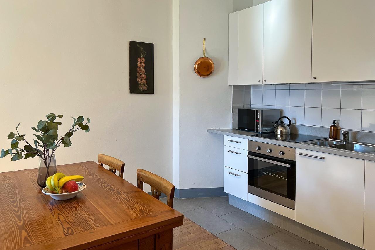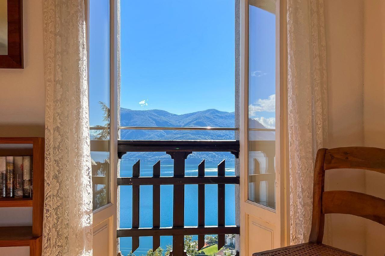 On the top floor of the house, the panorama is breathtaking: Lake Maggiore lies at your feet and on a clear day, the view stretches as far as Italy. Historical drawings, antique furniture and an azure blue bathroom with ceramic tiles reflecting the light of the lake give the flat its special atmosphere.