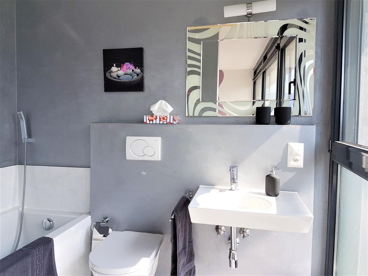 The flat is very bright thanks to its floor-to-ceiling windows and boasts spacious, modern rooms. It has one bedroom with en-suite bathroom (bath) and another bedroom with a separate bathroom (shower). The open-plan living and dining area is tastefully furnished and invites you to relax with a comfortable seating area and a flat-screen TV. The functional kitchen is equipped with a dishwasher, coffee machine and all other amenities to make your stay even more enjoyable.