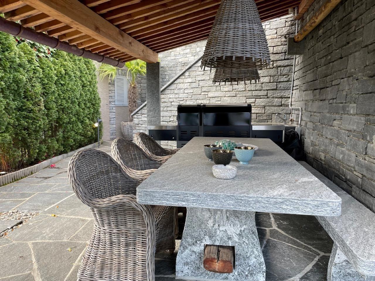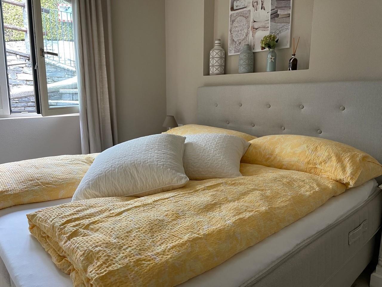 The interior leaves nothing to be desired: A spacious, bright living area with an open-plan kitchen in conservatory style, equipped with glass fronts that can be opened and a direct exit to the terrace. A Ticino-style fireplace ensures cosiness whatever the weather. In addition, all three bedrooms have comfortable box-spring beds, each with its own bathroom and direct access, which emphasises privacy. A guest toilet and a laundry room with washing machine and tumble dryer in the entrance area round off the offer.