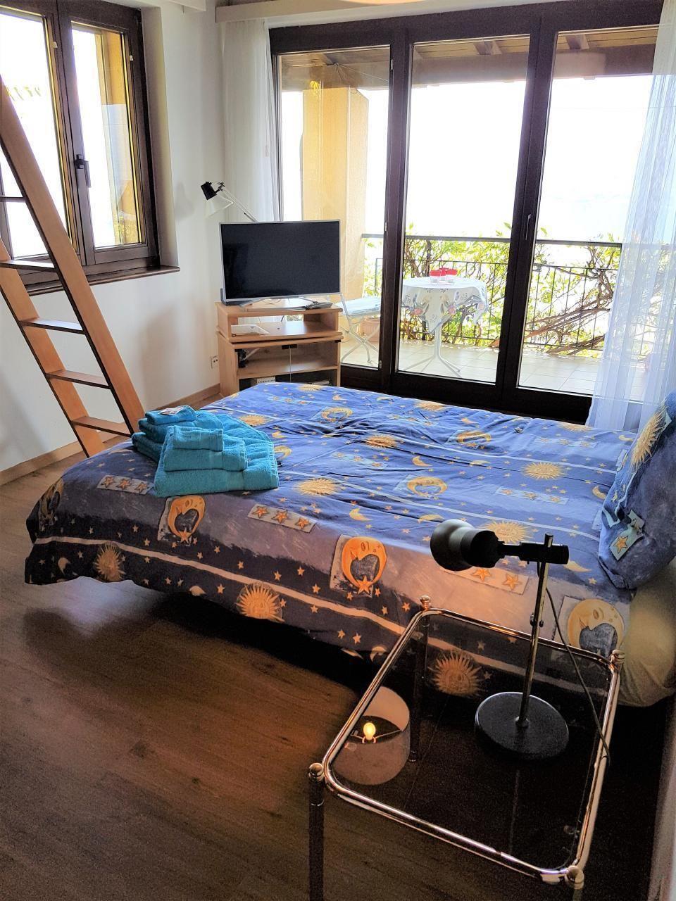 It doesn't get any more beautiful than this! The spacious and bright 4.5-room villa above Brissago spoils you with a breathtaking 180° view of Lake Maggiore. The panoramic view extends from the Swiss Alps with the lakeside towns of Locarno and Ascona to the Italian lake basin. You can also see the landing stage and the castles of Bellinzona, illuminated at night. Whether on the terrace, balcony, in the garden or at home, you will always have the beautiful lake in front of you. If you want to spend a relaxing holiday in a picturesque setting, the 'Villetta Vista Bellissima' welcomes you and offers comfortable space for up to 4 people. The cottage is part of a charming and well-kept estate with four flats and is located at the end of a quiet private road bordered by a forest and palm groves. Although we have advertised this property as a flat, you can enjoy your own 'cottage' as it offers great privacy. The wonderful thing about the Villetta is that you can live either indoors or outdoors, depending on your mood and the time of year. Outside, in addition to the large pergola and balcony on the first floor, there is a romantic garden seating area with an open fireplace and another secluded, slightly elevated seating area where you can enjoy a cosy evening with an aperitif. If it gets a little chilly, just move inside. On the ground floor, a comfortable living-dining area with an open, well-equipped kitchen awaits you. The whole is crowned by a spectacular view of the lake. A guest toilet is directly adjacent. On the upper floor is the bathroom with double washbasin, bathtub/shower and WC, as well as three bedrooms, all with lake views: - One bedroom with double bed and direct access to the balcony. - The second bedroom, also with access to the balcony, offers a pull-out sofa bed and three mattresses on the attic loft, which can be reached via an open staircase. Great fun, not only for the kids! - The third room is equipped with two single beds. If you feel the need to dive into the cool water after a heavenly quiet night, you have a short walk of about 7 minutes ahead of you. At your disposal is a shared 11 x 5.5-metre swimming pool with sunbathing lawn and outdoor shower. Tip: The months of December to February are those with the fewest rainy days of the year, which means that there are already a few hours of warm sunshine to spend outdoors. Those in need of peace and quiet will really appreciate these months. Important note: There is direct access to the house, but not to the flat. Access is via several stairs (84 steps in total).