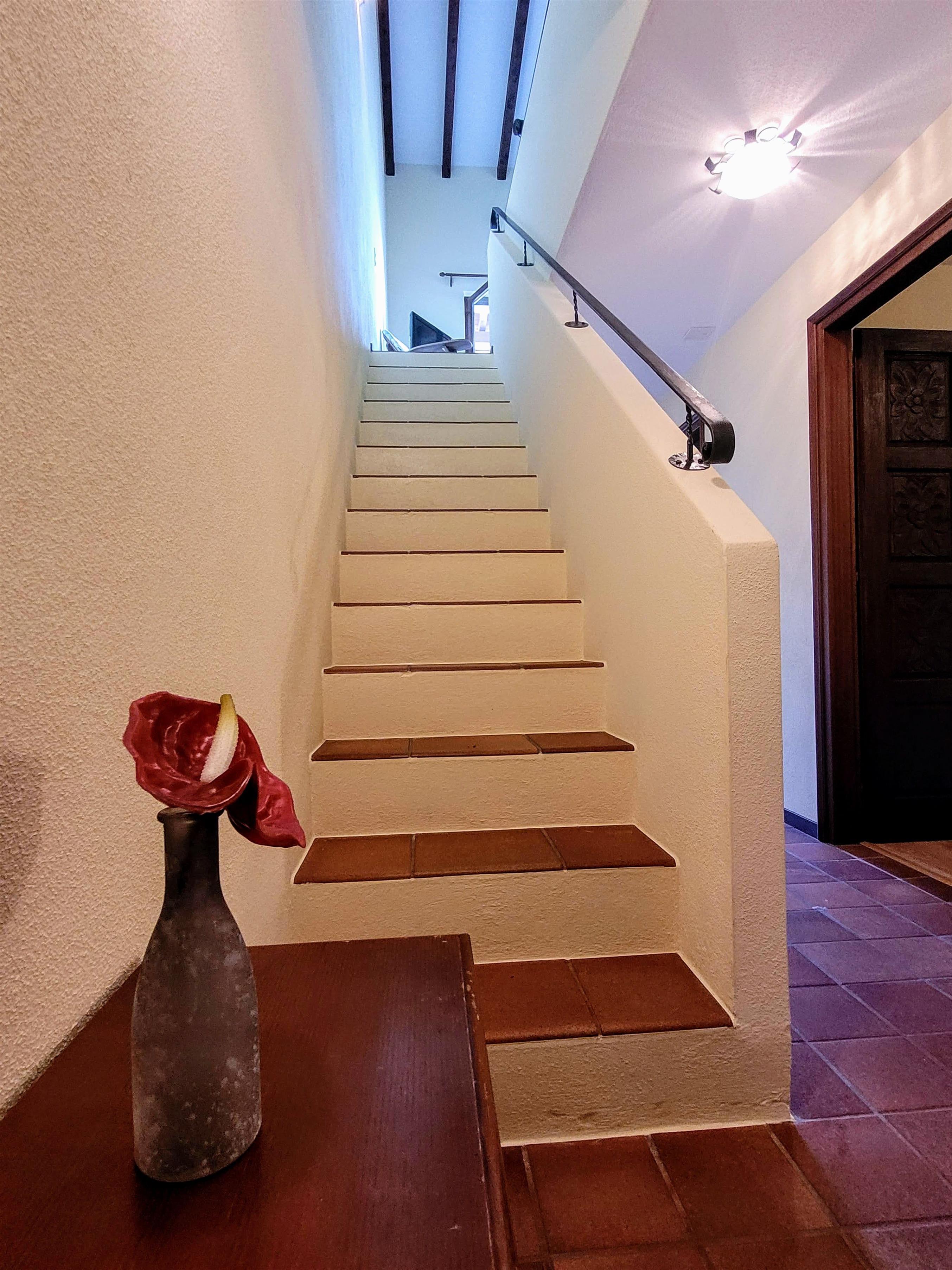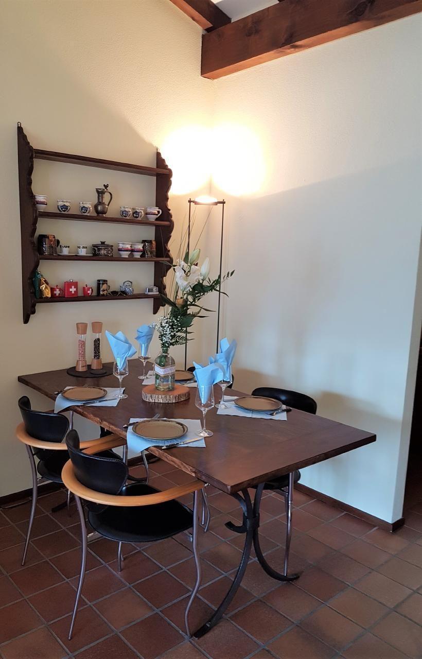 A few steps lead up to the upper floor, where there is a well-furnished living room with dining area, a well-equipped kitchen and a modern guest WC. The generous living room enchants with its Ticino charm, thanks to the high ceiling with wooden beams and an open fireplace.