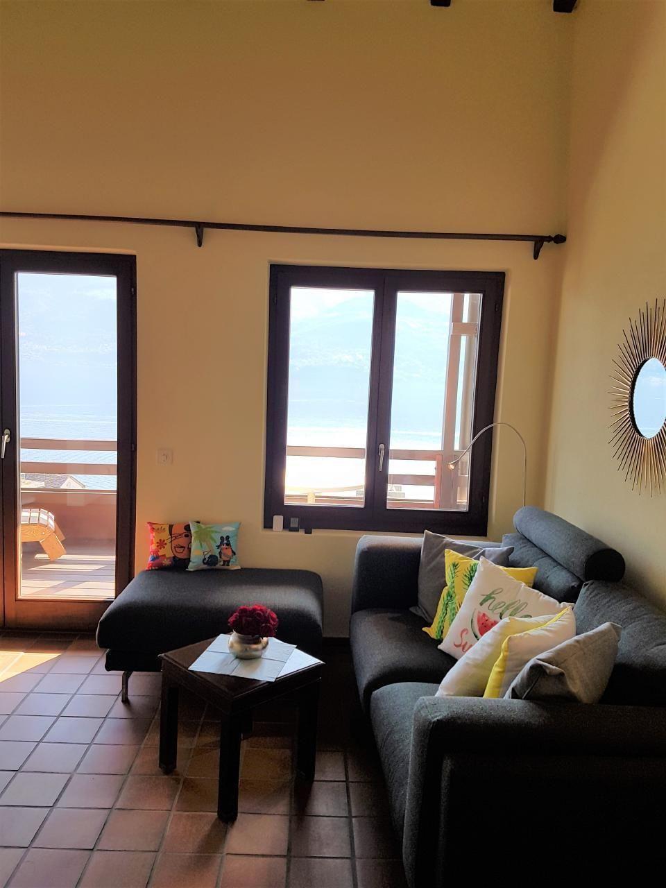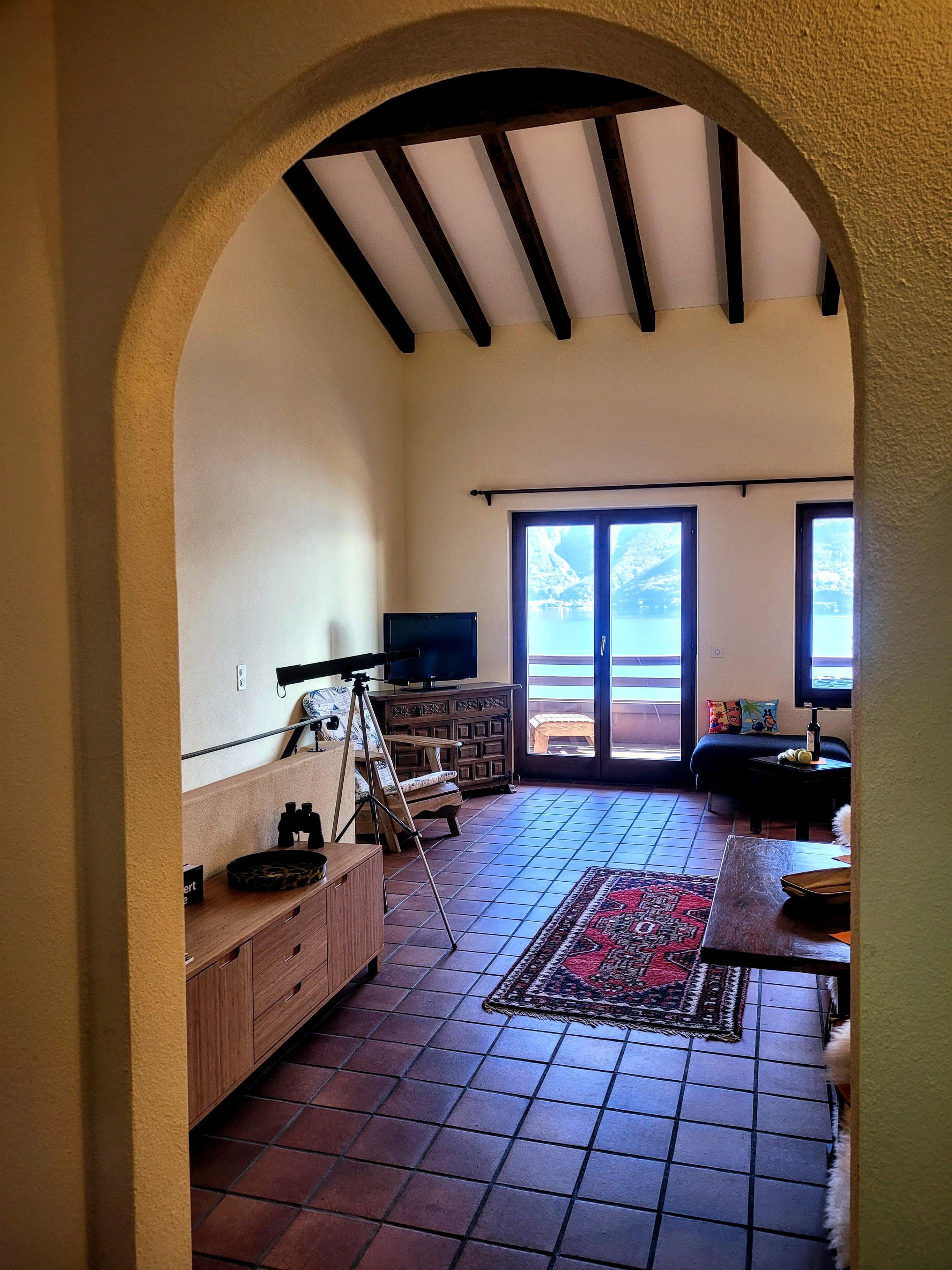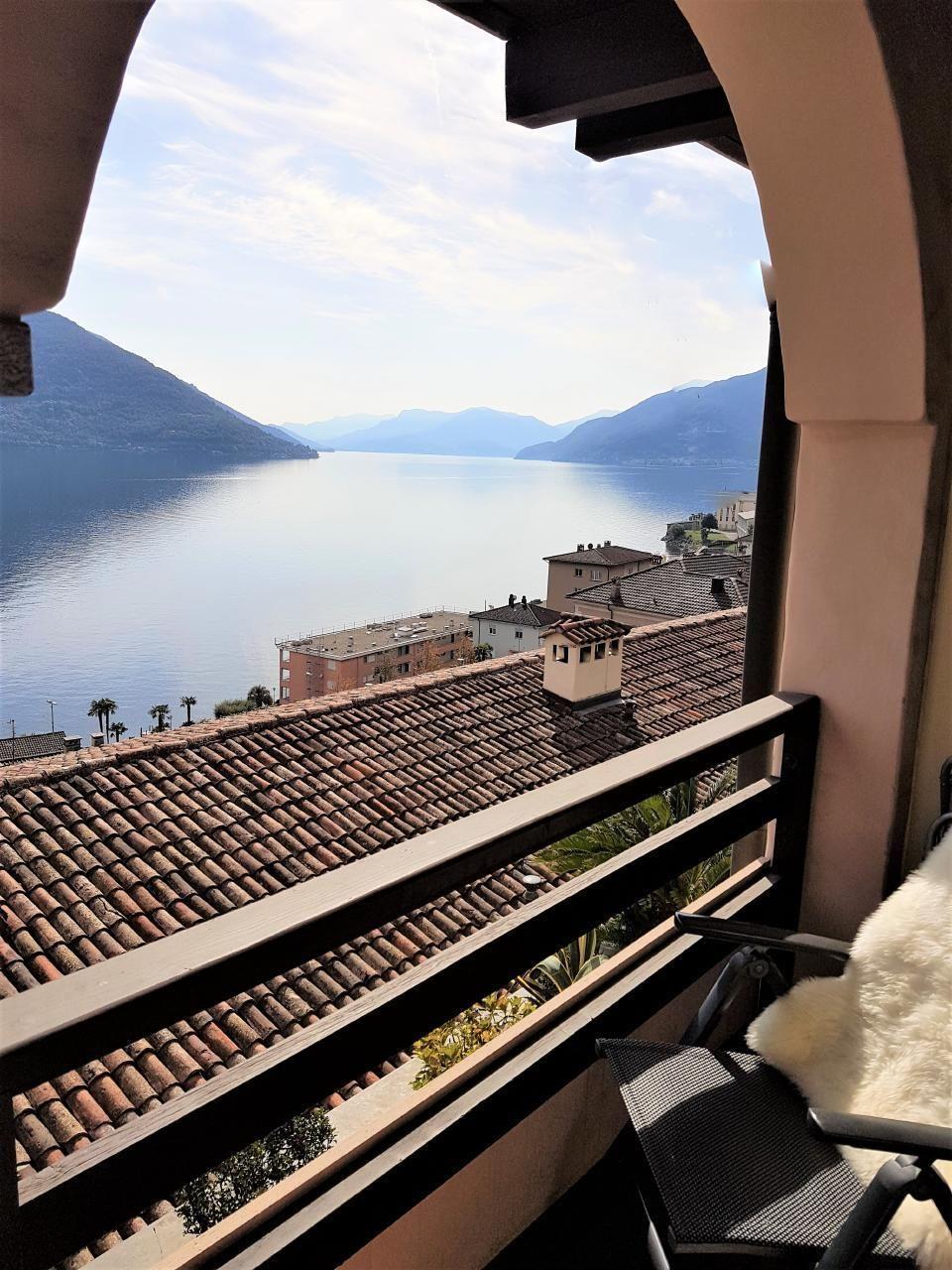 The two-storey flat, with two terraces and a wonderful view over Lake Maggiore towards Italy and the Swiss Alps, is just a few steps away from the beautiful lakeside promenade. Thanks to the privileged location on the 5th floor of a building on a hill about 100 metres from the lakefront road, you can enjoy the tranquillity and relative distance from the bustling city life.