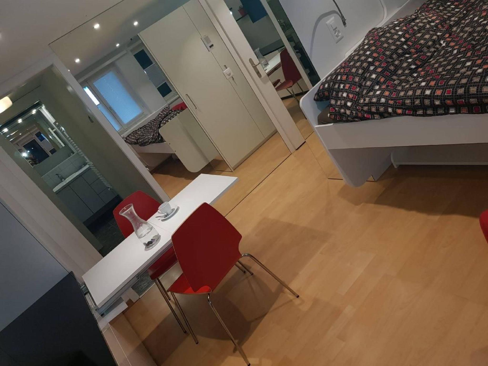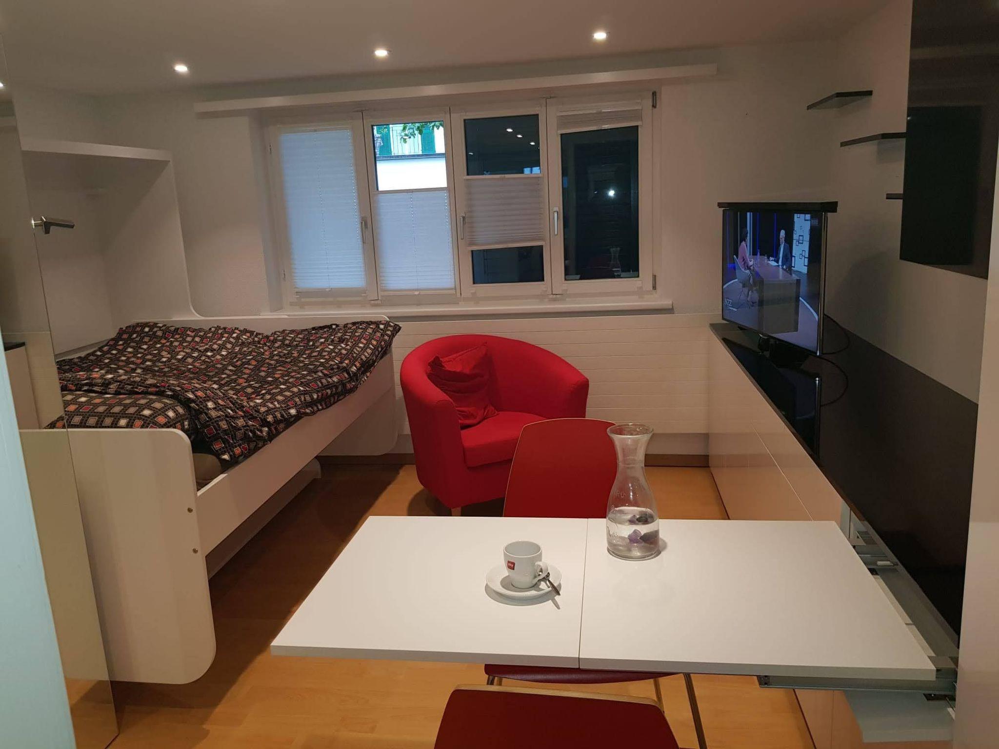 In our 3 family house we rent a nice 1 room flat for 1 - 2 persons on the ground floor. The bedroom is equipped with a modern folding bed 140x200cm, can be used as a desk during the day, folding dining table with 2 chairs, TV with satellite reception and various cupboards. The small kitchen is separated by a sliding door. It is equipped with 2 hotplates, microwave, fridge, coffee machine and crockery. The bathroom with shower and WC is separate. Our garden can be shared and invites you to linger. The house is located near 2 flowing waters (Bächlein and Leewasser), where ducks and swans visit us. The SBB railway line is behind the house, covered by noise barriers. Vis à vis, the lorries are cleaned with high pressure, which can lead to noise emissions.