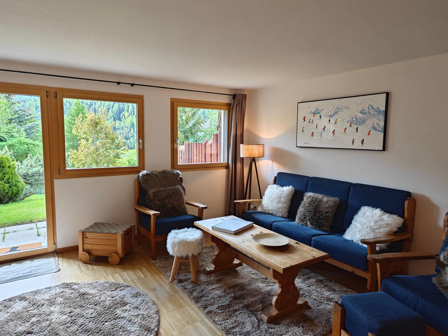 Diese gut eingerichtete 3.5-Zimmer-Wohnung befindet sich an einer ruhigen, sonnigen und aussichtsreichen Lage. Die Wohnung wurde mit viel einheimischen Möbeln aus Arvenholz eingerichtet und bietet somit einen authentischen Charme. Das gemütliche und grosszügige Wohnzimmer bietet viel Platz zum Entspannen. Ein besonderes Highlight ist der Gartensitzplatz, der mit einer atemberaubenden Aussicht beeindruckt und mit Tisch, Stühlen sowie einem Sonnenschirm ausgestattet ist.. Die zwei Schlafzimmer sind jeweils mit einem Doppelbett ausgestattet und bieten angenehmen Komfort. Im Badezimmer befinden sich eine Dusche und ein WC. Die Küche ist zweckmässig und komplett eingerichtet. Ein Garagenparkplatz, ein Skiraum und eine Waschküche stehen ebenfalls zur Verfügung. Diese Wohnung bietet alles, was Sie für einen komfortablen und erholsamen Aufenthalt benötigen.