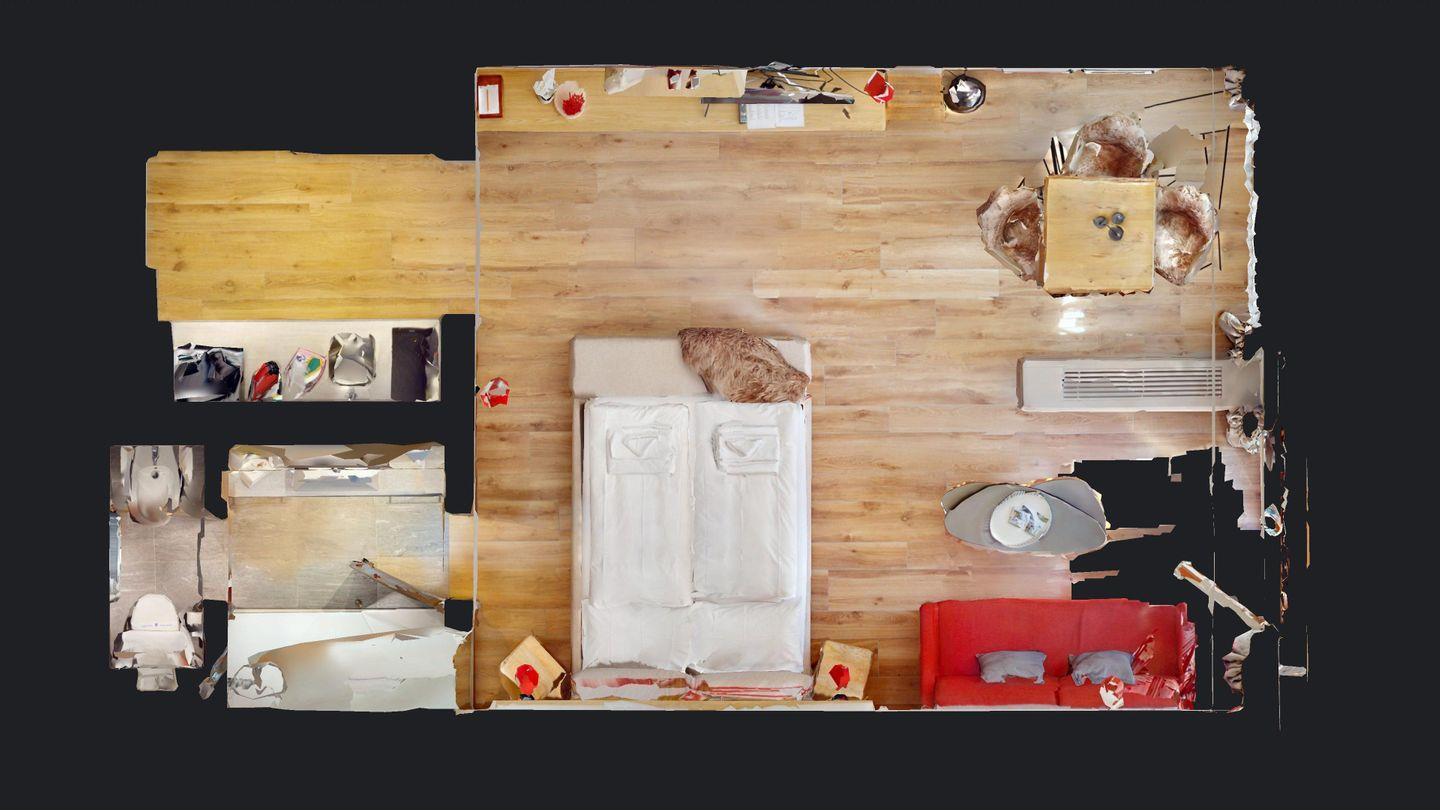 Studio im 2. Stock, mit Balkon, ca. 43 m². Südostlage. Eingang mit grossen Einbauschränken und Kochnische, Herd mit zwei Platten (kein Ofen) Lavabo und kleinem Kühlschrank. Grosse Dusche/WC/Waschbecken/Bidet. Wohn-/Schlafzimmer mit Doppelbett, Esstisch und TV. Bergsicht. Aussenparkplatz. Haustiere sind nicht erlaubt. Keine Waschmaschine.