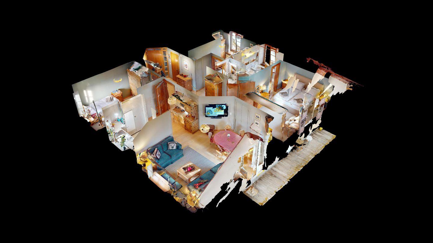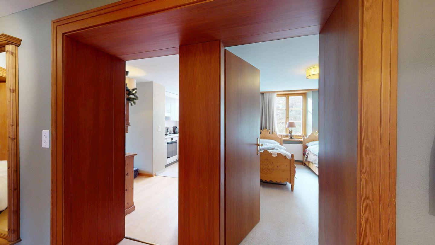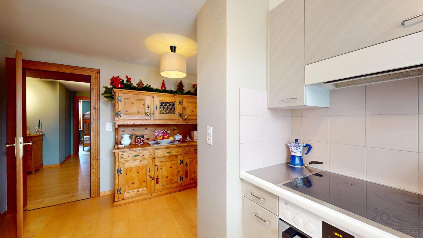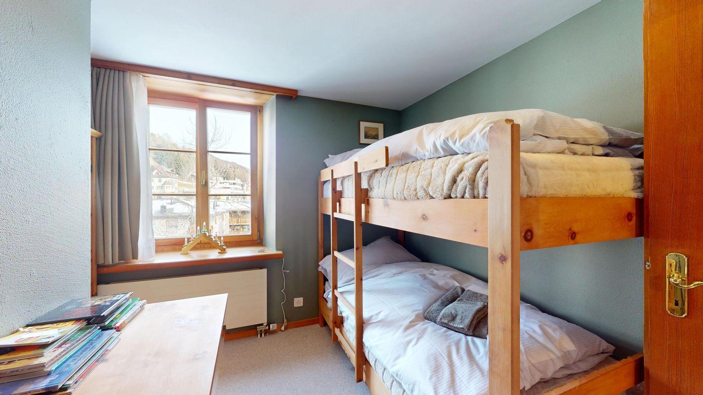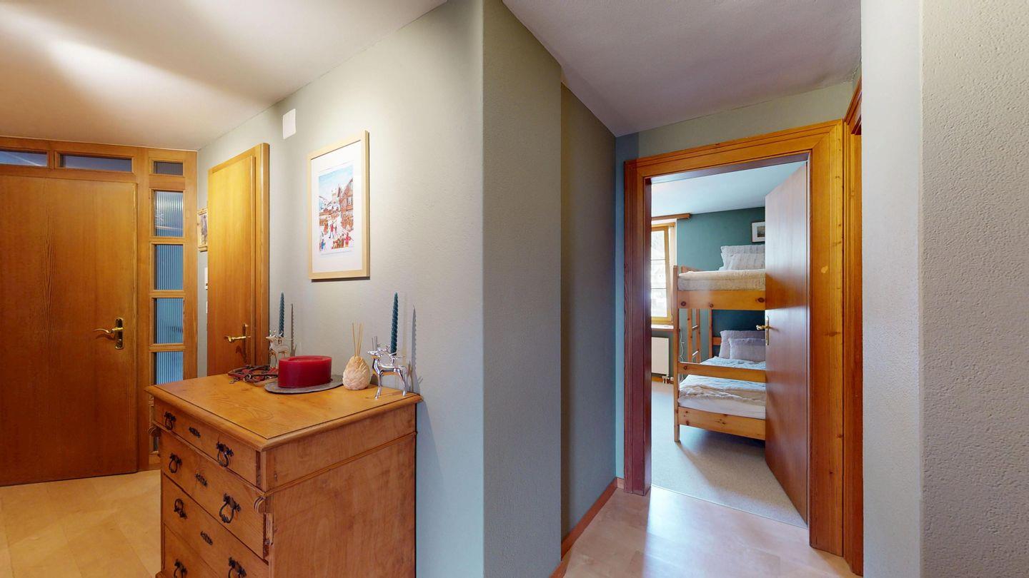 Grosszügige 4-Zimmerwohnung im 2. Stock. Eingang mit Garderobe. Wohn-/Esszimmer mit Balkon. Offene Küche mit Fenster, Backofen, Geschirrspüler und Kühlschrank. Doppelzimmer mit eigenem Badezimmer mit Badewanne/WC/Doppelwaschbecken. Ein Schlafzimmer mit zwei Einzelbetten und ein Schlafzimmer mit Etagenbett. Badezimmer mit Dusche/WC/Lavabo. Ein Aussenparkplatz. Haustiere sind nicht erlaubt.