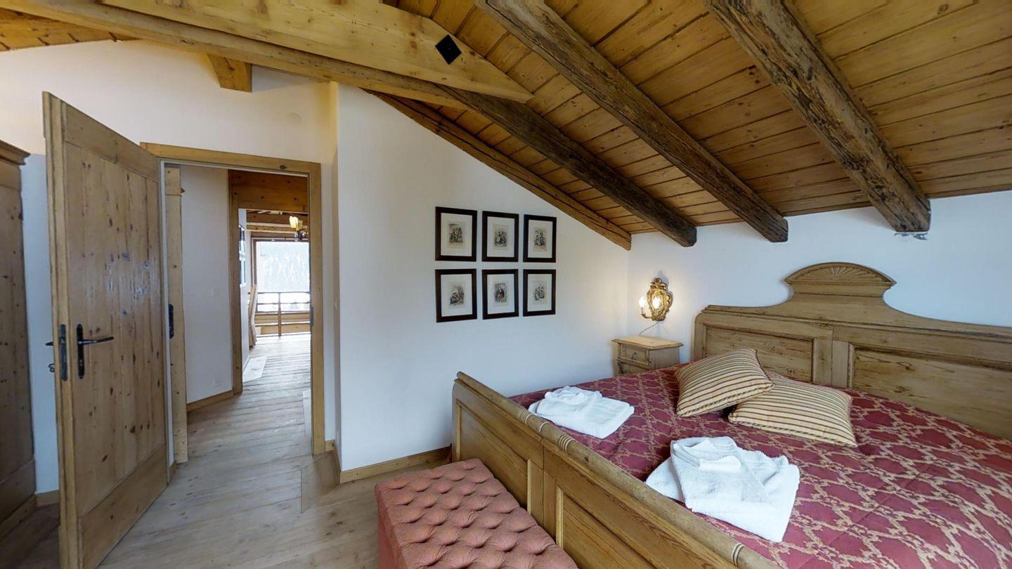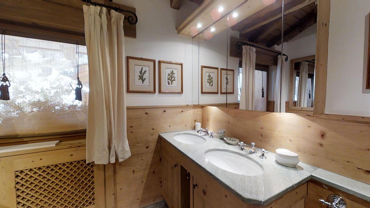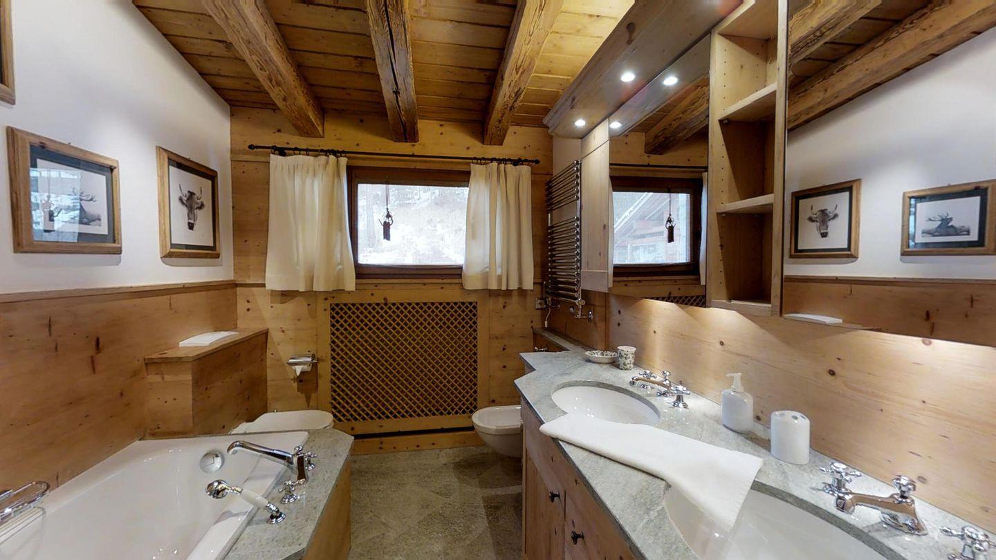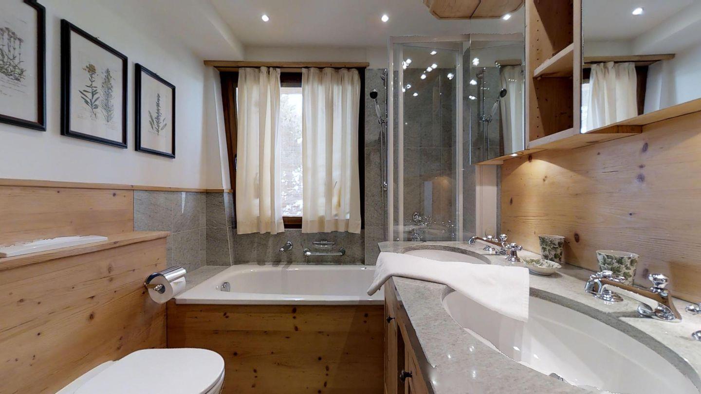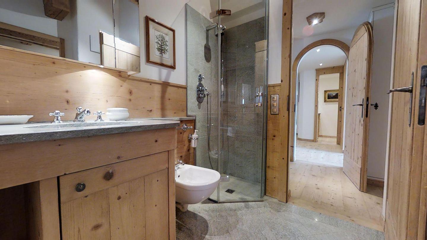 Weiters befinden sich im gleichen Geschoss auf der linken Wohnungshälfte eines der Schlafzimmer (2 Betten) mit eigenem Badezimmer mit Badewanne/WC/Doppelwaschbecken