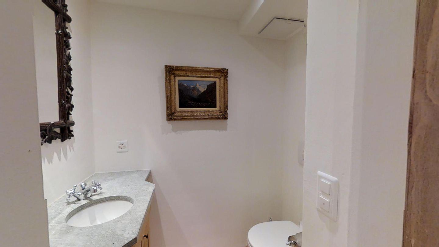 Im unteren Geschoss befindet sich der weitläufige Wohnbereich mit grossem Esstisch, gemütlicher offener Kaminecke sowie abgetrenntem Sitzbereich und TV-Ecke.