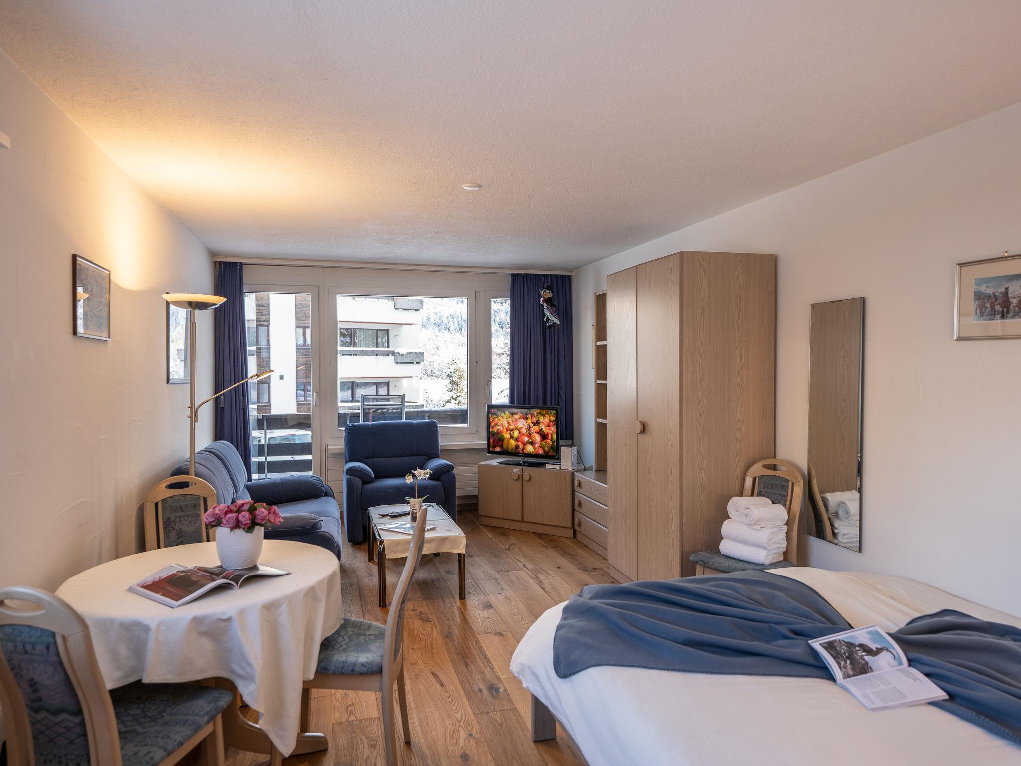 "Chesa Corvatsch 111 - Champfer", 1-room apartment 30 m2 on 1st floor. Object suitable for 2 adults. Bright, beautiful and cosy furnishings: living/sleeping room with dining table and TV (flat screen) with 1 french bed (1 x 160 cm, length 200 cm). Small kitchenette in the entrance (2 ceramic glass hob hotplates, toaster, kettle, microwave, electric coffee machine, Capsules for coffee machine (Nespresso) extra). Bath/WC. Heating. Balcony furniture. Beautiful view of the mountains and the resort. Facilities: Internet (WiFi, free). Parking space n 111 (1 car). Please note: apartment courtyard side. Non-smokers only, non-smoking house.
