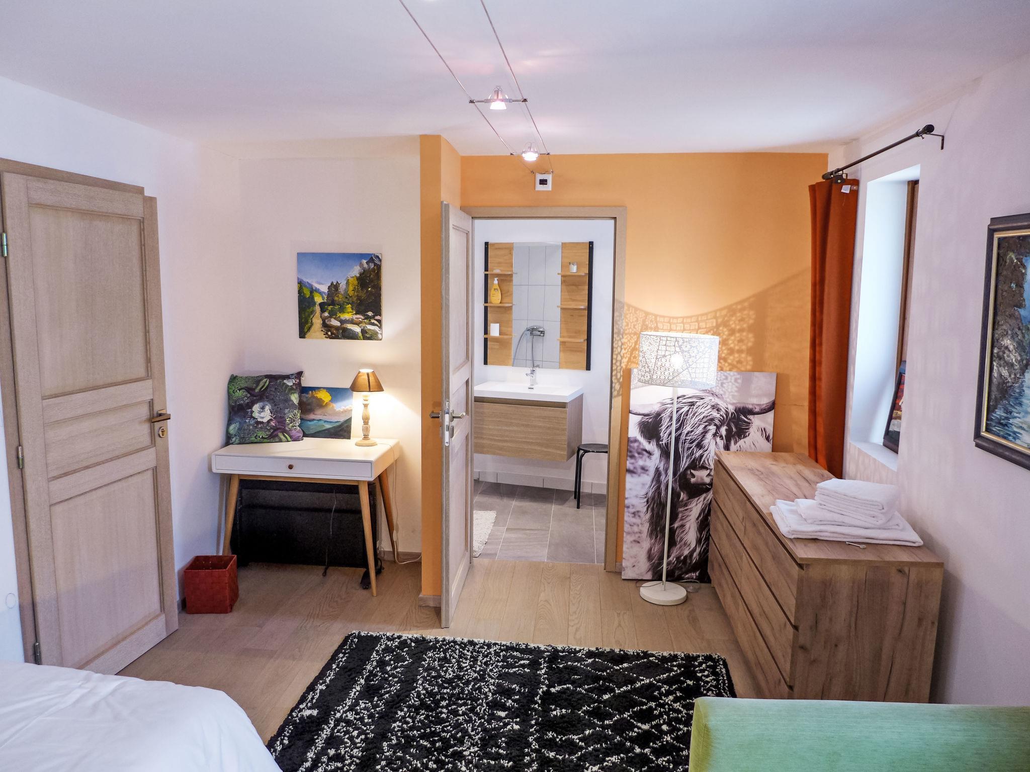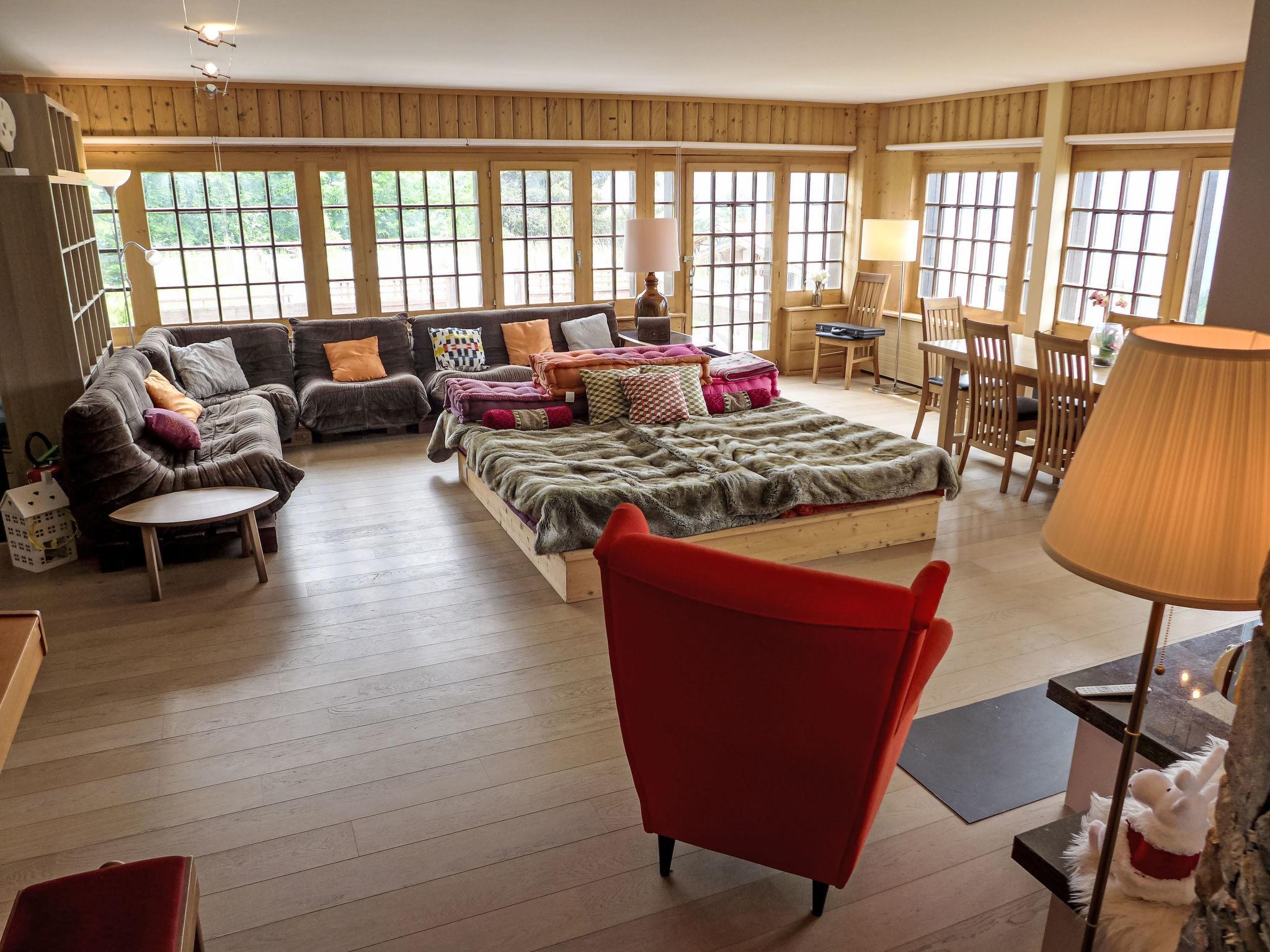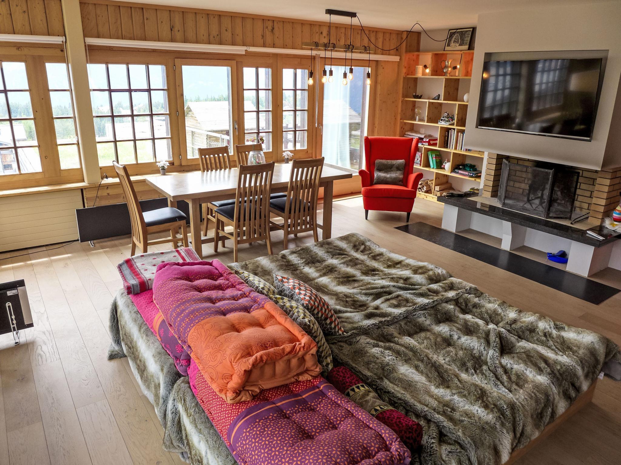 "Jeanne D'Arc LOFT Lac", 4-room apartment 150 m2 on 2 levels on 3rd floor, south facing position. Comfortable and cosy furnishings: large living/dining room with open-hearth fireplace and cable TV. Exit to the terrace. 1 room with 2 beds and shower. 1 room with 1 french bed, bath/WC and double hand-basin. 1 room with 1 french bed and shower/WC. Exit to the terrace. Open kitchen (oven, dishwasher, 4 induction hot plates, toaster, kettle, microwave, freezer, electric coffee machine, Capsules for coffee machine (Nespresso) extra, fondue Set (chinoise)) with bar. On the lower ground floor: entrance hall with separate WC. Terrace, south facing position, large terrace, south facing position and, east facing position. Terrace furniture, barbecue (portable). Marvellous panoramic view of the lake, the mountains, the valley and the countryside. Facilities: hair dryer. Internet (WiFi, free). Please note: suitable for families. Non-smokers only. Private entrance, no lift. Connecting door to flat CH3962.180.16 sleeping 6. Electric stairlift available.