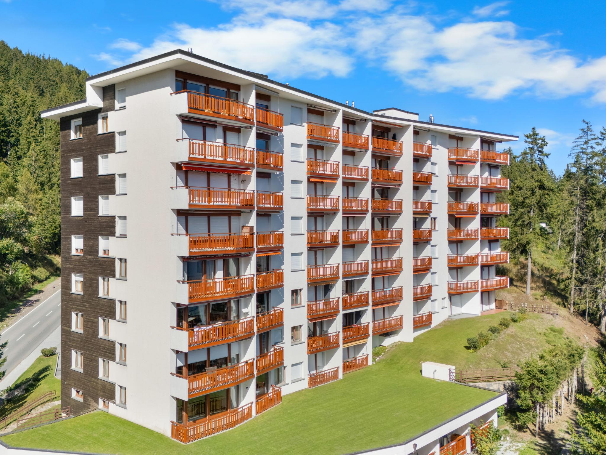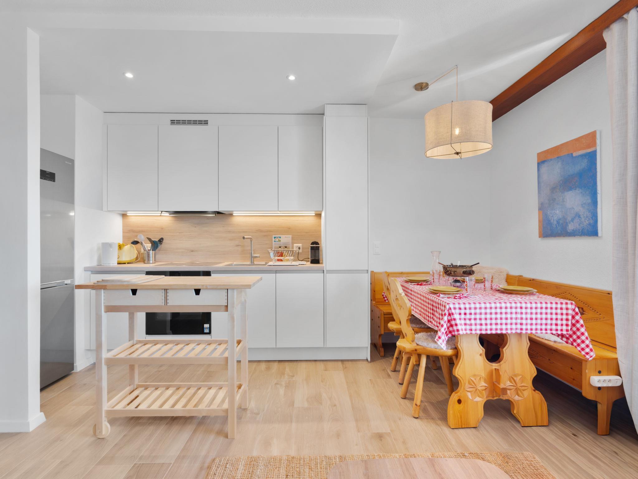 "La Forêt ouest C120", 3-room apartment 53 m2 on 3rd floor. Bright, renovated in 2025, comfortable and cosy furnishings: living/dining room with separate WC and cable TV. Exit to the balcony. 1 room with 1 french bed (140 cm, length 200 cm). Exit to the balcony. 1 room with 1 french bed (160 cm, length 200 cm). Exit to the balcony. Small, open kitchen (oven, dishwasher, 4 induction hot plates, toaster, kettle, freezer, electric coffee machine, Capsules for coffee machine (Nespresso) extra, raclette grill, fondue Set (chinoise, cheese)). Shower/bidet/WC. 2 balconies, south facing position. Balcony furniture. Very beautiful view of the mountains, the countryside and the resort. Facilities: washing machine, iron, hair dryer. Internet (WiFi, free). Please note: non-smokers only.