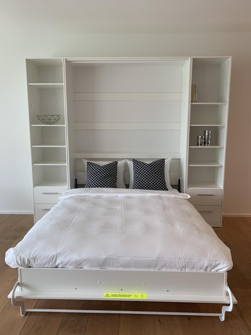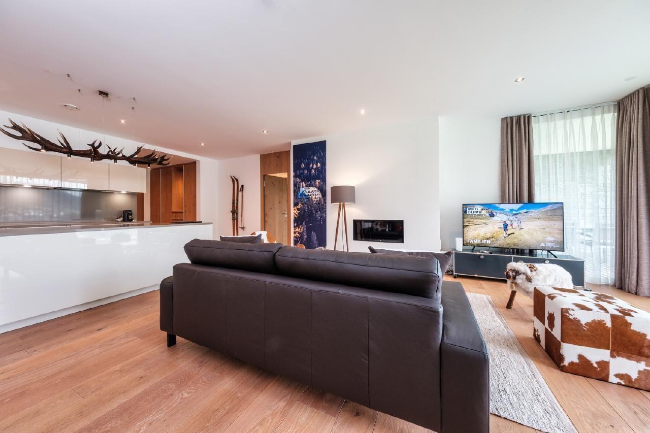 The interior design of our flat reflects the luxury and spaciousness you expect from a 5-star holiday. At 115 square metres, it offers enough space for 4 people. Experience culinary delights in a state-of-the-art Poggenpohl kitchen with V-ZUG appliances, from induction hob to dishwasher. The living and dining room, furnished with a leather sofa, designer lounge chairs and a gas fireplace, offers comfort as well as a priceless panoramic view. The bedroom has a comfortable double bed and a spacious wardrobe. There are also two fully equipped bathrooms with high-quality bath products.
