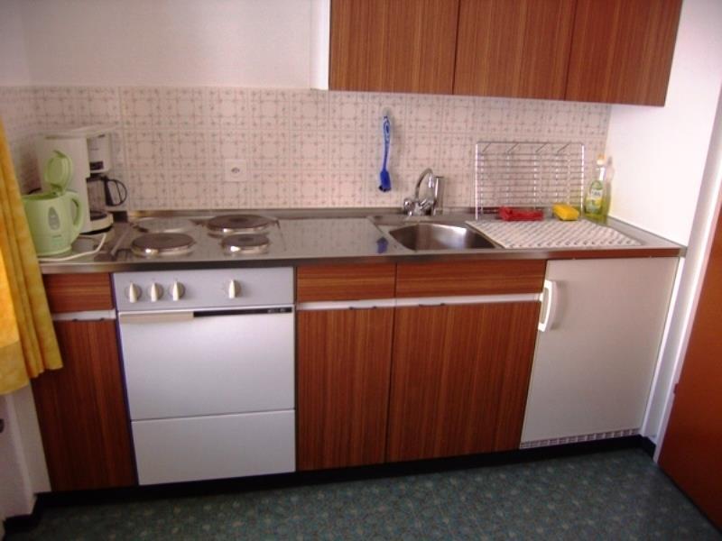 Einfache, aber zweckmässig eingerichtete Küche mit Backofen, Kühlschrank, Wasserkocher und Kaffeemaschine. Badezimmer: