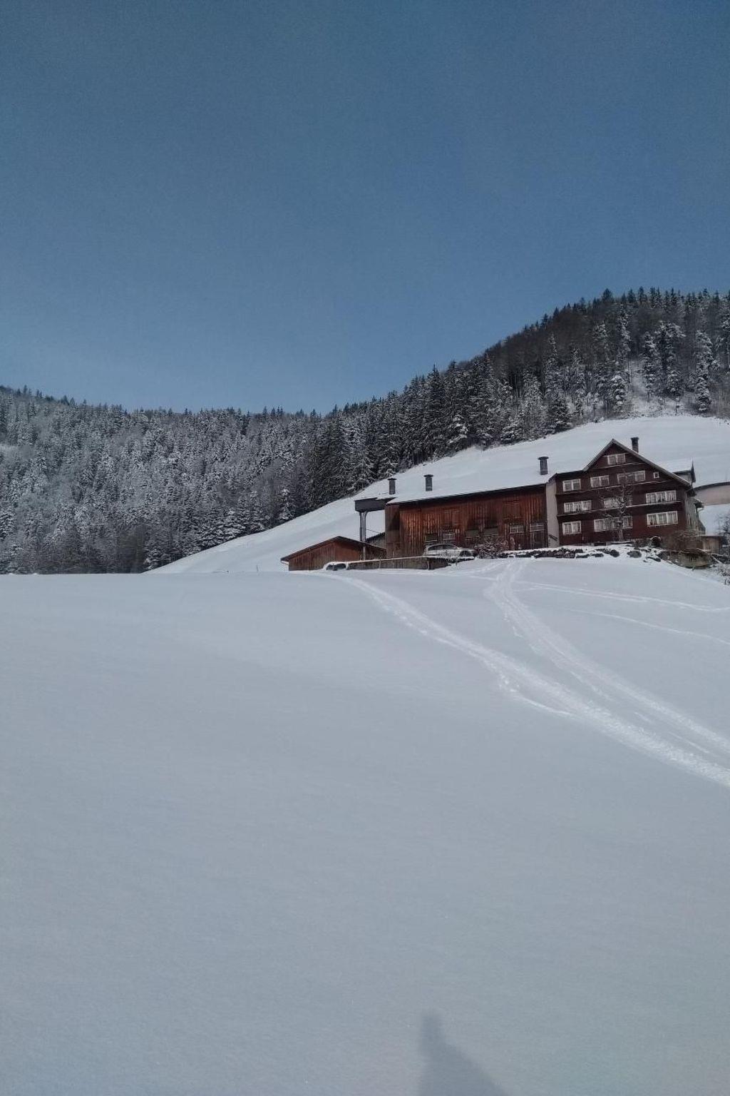 Our farm is located above the village of Dicken in the Necker Valley with a marvellous view of the mountains. We also have a farm shop with jams, syrup, preserves and gift articles. To recover from everyday life, enjoy the peace and quiet here with us. Ideal starting point for excursions to Toggenburg and Appenzellerland. Our 5-room flat is on the 3rd floor with its own entrance; kitchen with dining room, living room, 2 double bedrooms, shower/WC. One floor higher: one double room. Room height 1.85 m. For our little guests there are toy tractors, trampoline, sandpit, swing, slide and in summer a small pool. With no through traffic, children can let off steam to the full. We warmly welcome you!