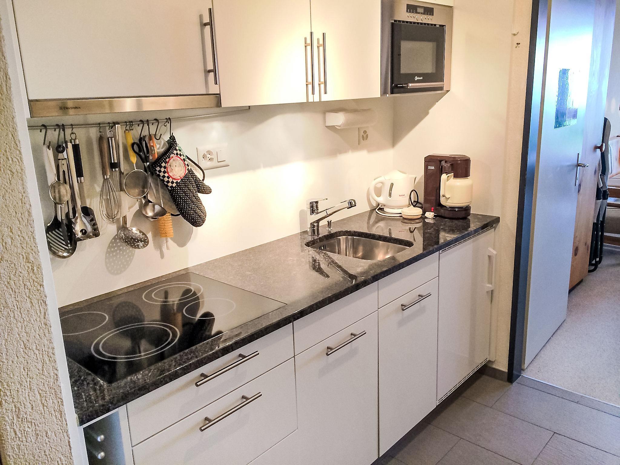 "Apt C 031", 1-room apartment 45 m2 on 3rd floor. Practical and cosy furnishings: living/dining room with 2 fold-away beds and satellite TV (flat screen). Exit to the balcony. Small alcove, without window with 1 x 2 bunk beds. Open kitchen (dishwasher, 4 ceramic glass hob hotplates, kettle, microwave, electric coffee machine). Bath/WC. Balcony, south facing position. Balcony furniture, deck chairs (2). Very beautiful panoramic view of the mountains and the countryside. Facilities: Internet (WiFi, free). Please note: non-smokers only. Instead of an enclosed bedroom, some sleeping areas are located in an open-plan area (gallery, alcove, etc.).