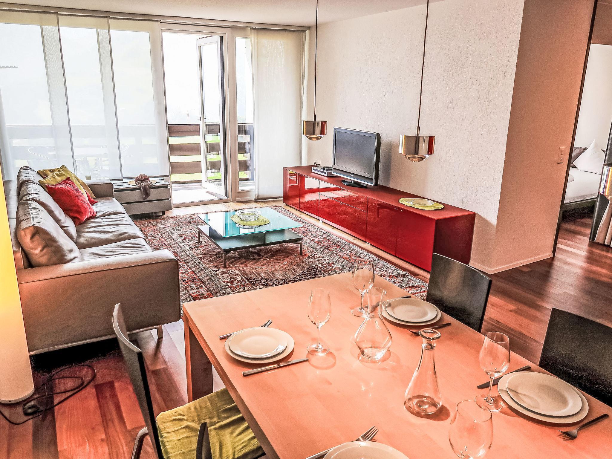 "Apt B 096", 2-room apartment 63 m2 on 9th floor. Comfortable and cosy furnishings: living/dining room with satellite TV (flat screen). Exit to the balcony. 1 room with 1 double bed (160 cm, length 200 cm). Exit to the balcony. Alcove with 2 beds. Open kitchen (oven, dishwasher, 4 induction hot plates, toaster, electric coffee machine, Capsules for coffee machine (Nespresso) extra, combination microwave). Bath/WC. Large balcony, south facing position. Balcony furniture. Beautiful view of the mountains and the countryside. Facilities: hair dryer. Internet (WiFi, free). Please note: non-smokers only. Instead of an enclosed bedroom, some sleeping areas are located in an open-plan area (gallery, alcove, etc.).