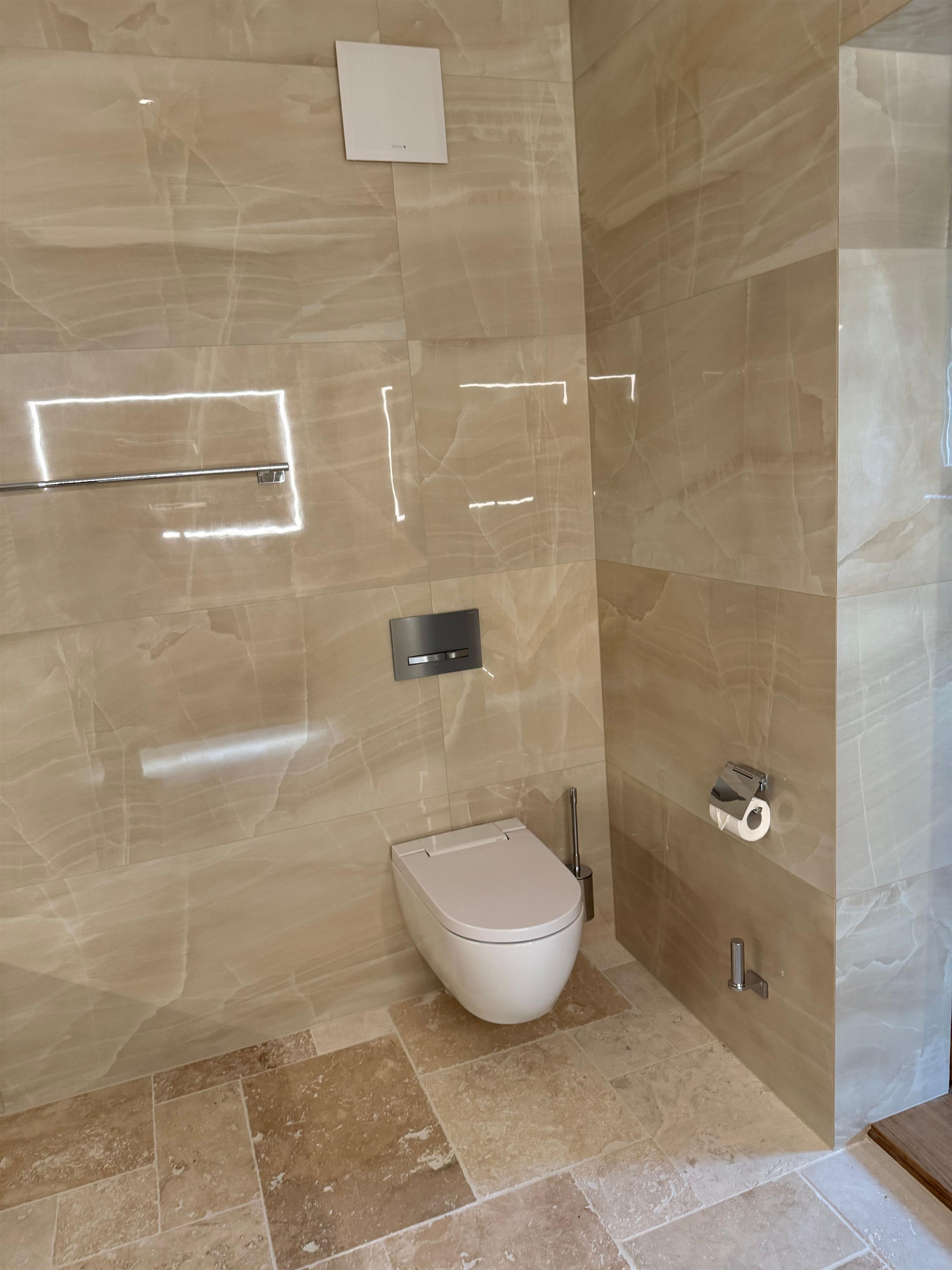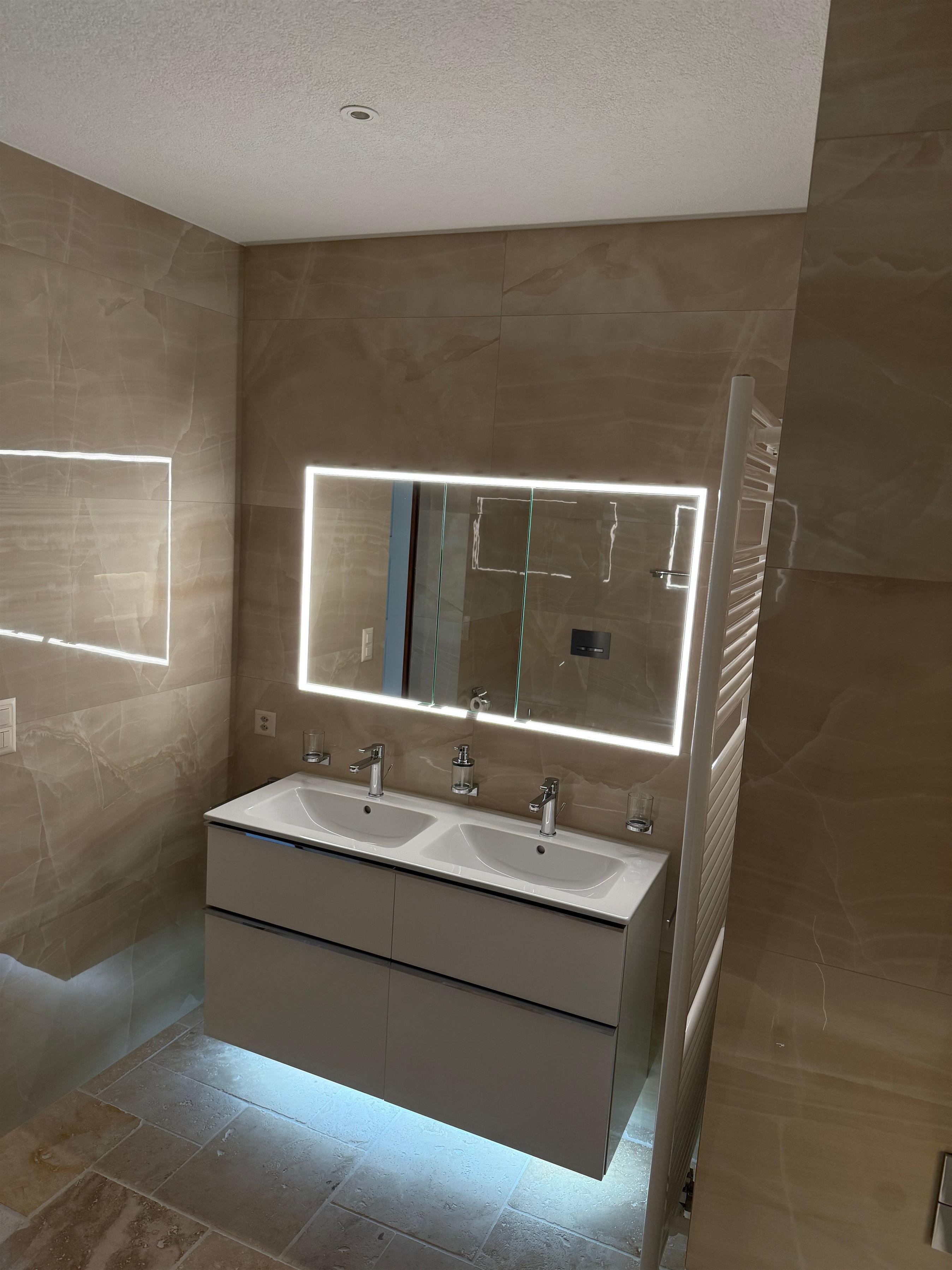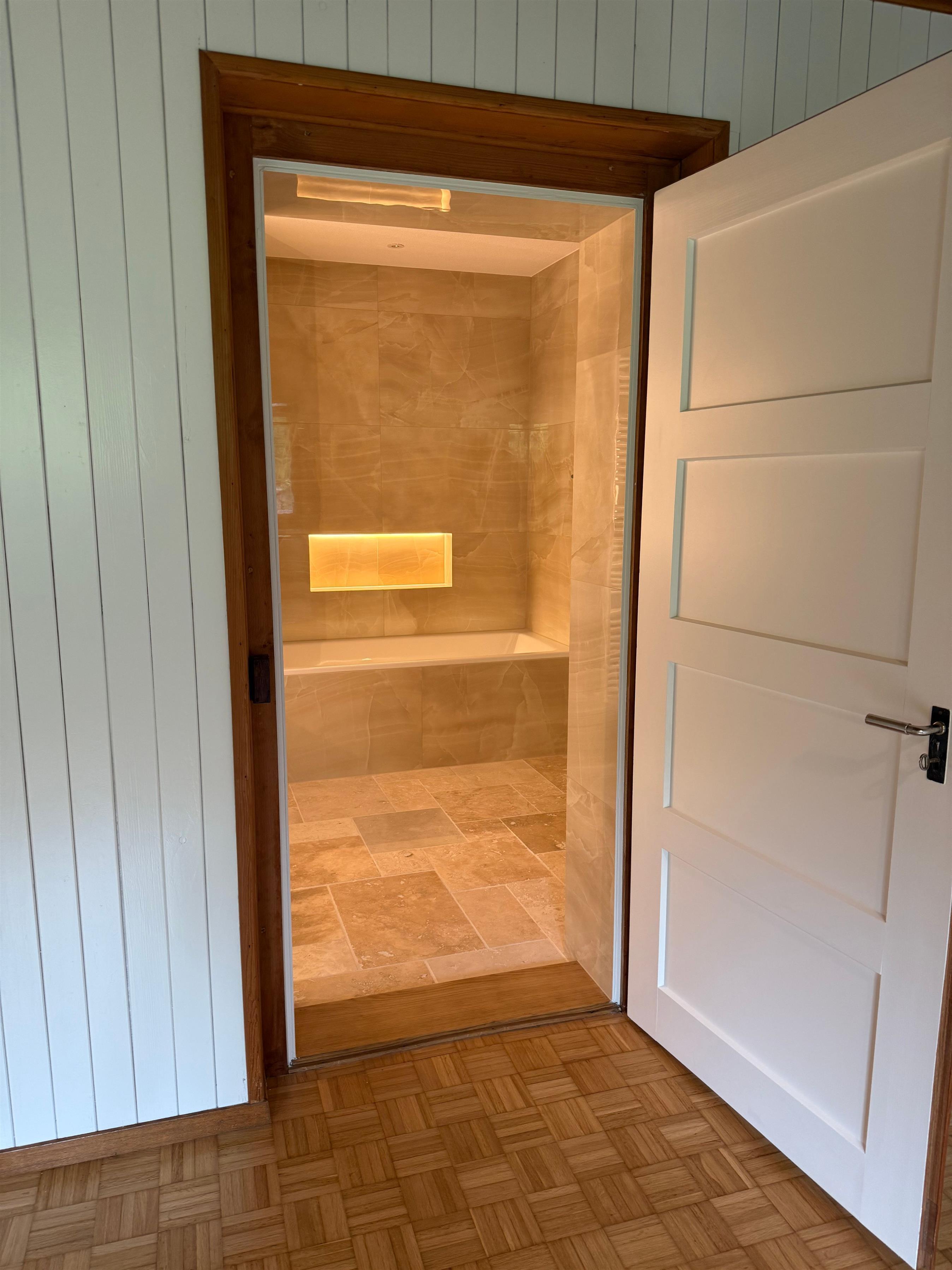 The apartment extends across the first floor on one side and flows into a private garden on the other. With three bedrooms and three toilets, the home offers plenty of room and privacy — ideal for families and groups traveling together. Two bathrooms, featuring both a walk-in shower and a bathtub, provide comfort after a day of activity. A fully equipped kitchen with induction hob, capsule coffee machine, and dishwasher makes cooking easy, while a traditional cheminée in the living room creates a cozy gathering place.