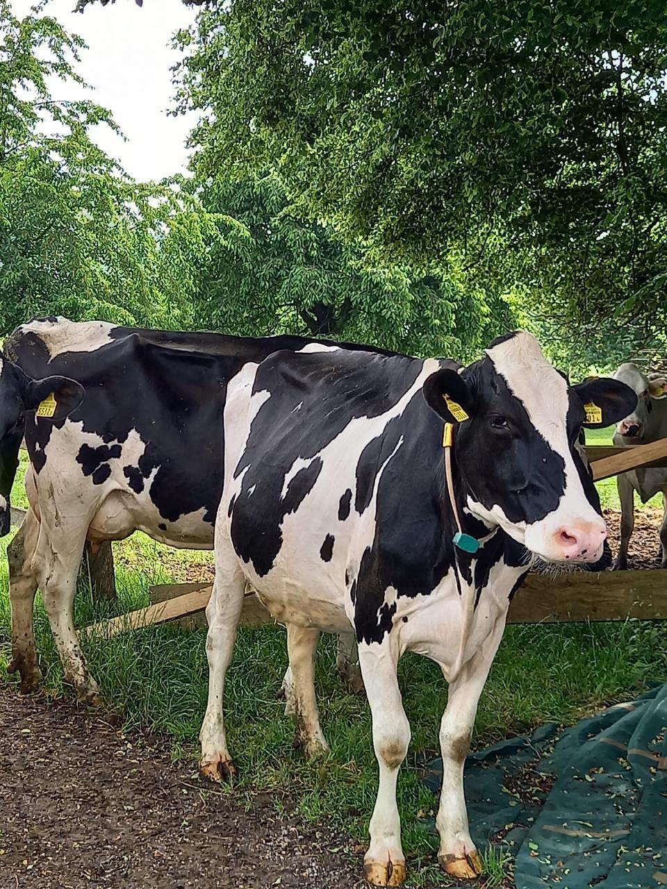 Dairy cows, calves, chickens, pigs and a dog live on our farm.