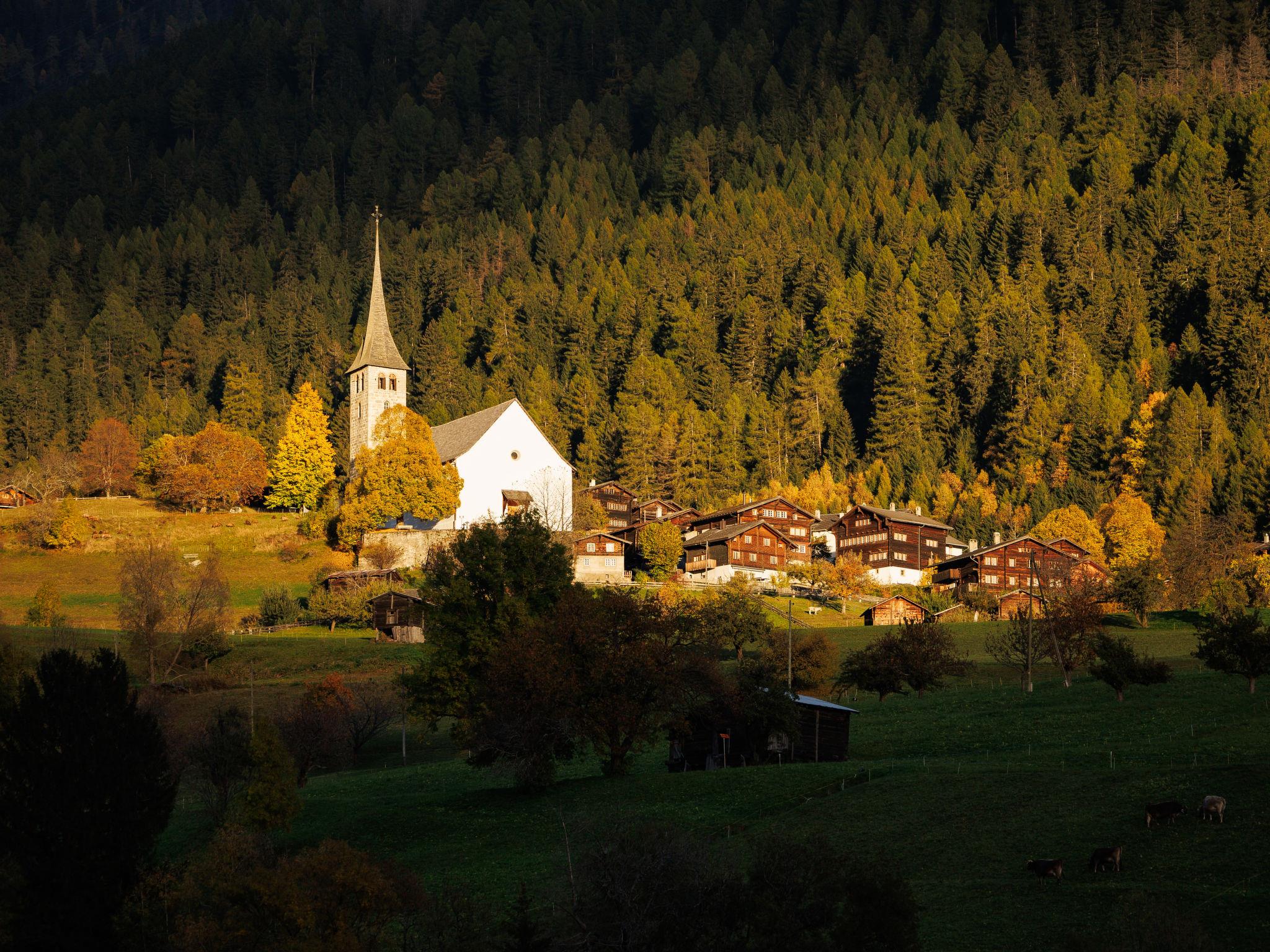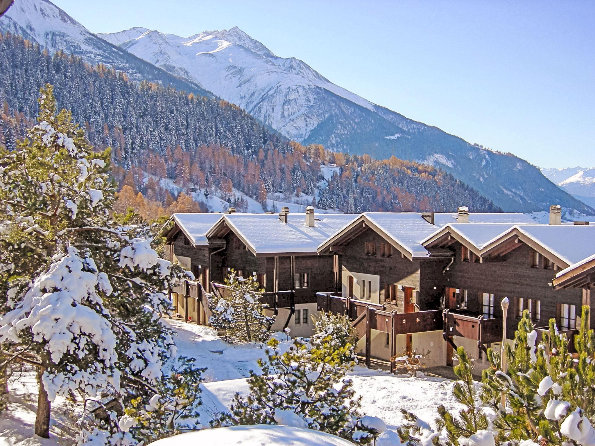 Cosy, rustic holiday village "Aragon", 1'200 m a.s.l.. 21 houses in the resort. On the outskirts, 500 m from the centre of Ernen, in a quiet, sunny position on a slope, 4 km from the skiing area. For shared use: table tennis, barbecue, fireplace, children's playground. In the house: storage room for bicycles, storage room for skis, central heating system, washing machine, tumble dryer (for shared use, extra). Motor access to the grounds (mountain road). In Winter: please take snow chains, 4x4 car recommended in winter. Communal covered parking. Shop 500 m, bus stop 100 m. Golf course (18 hole) 25 km, tennis 4 km, indoor tennis centre 4 km, sports centre 4 km, gondola lift 4 km, skisport facilities 4 km, ski rental 4 km, ski bus stop 100 m, ski school 4 km, cross country ski track 4 km. Well-known ski regions can easily be reached: Aletsch Arena 4 km, Bellwald 12 km. Hiking paths: Landschaftspark Binntal 10 km. The new hanging bridge connects the two hiking estates of Ernen and Bellwald and provides access to the national cycle route nr. 1 (road of the Rhone glacier lake to Lake Geneva). Between Ernen and Mühlebach, the bridge provides direct access to the Matterhorn Gotthard train.