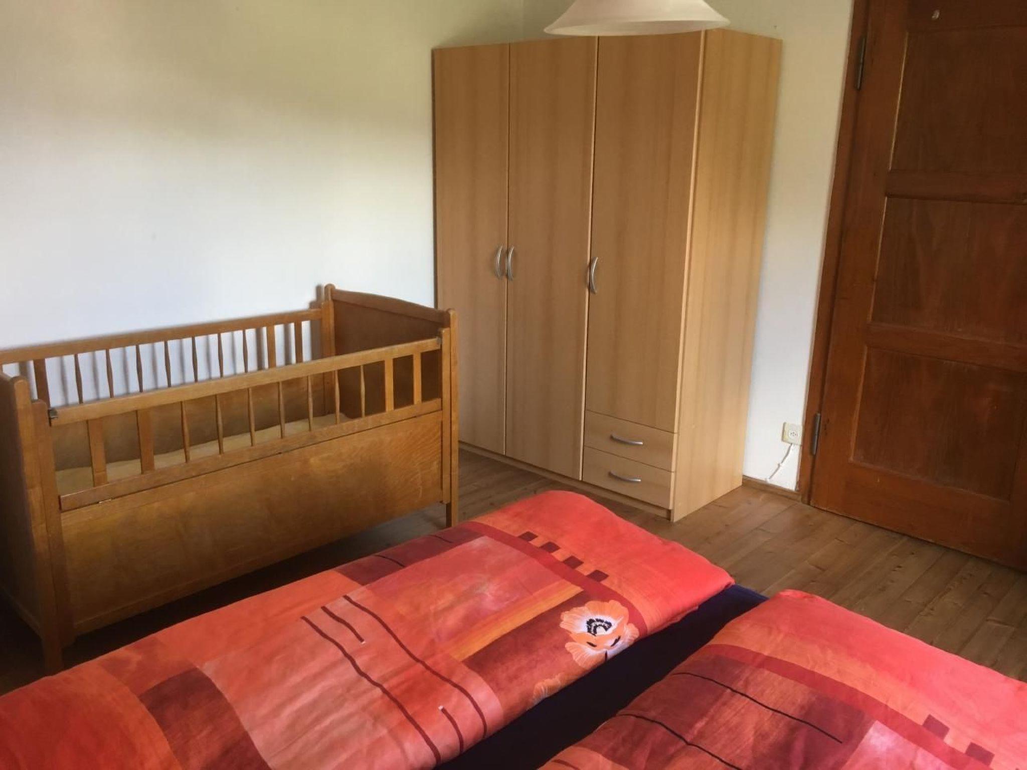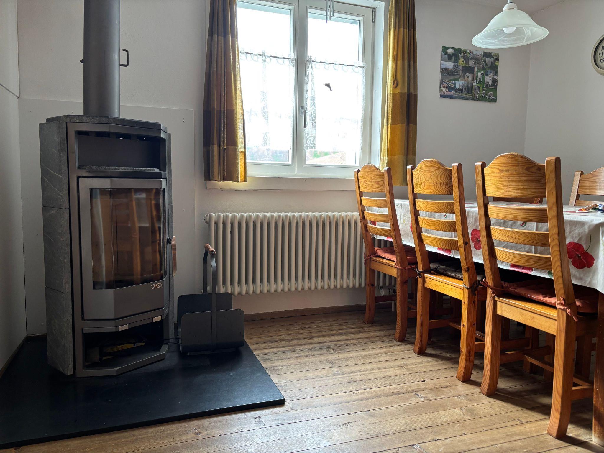 Living room furnishings: 2 sofas, coffee table, TV, radio, chest of drawers, wardrobe, dining table with chairs for 6-8 people, children's high chair, wood-burning stove.