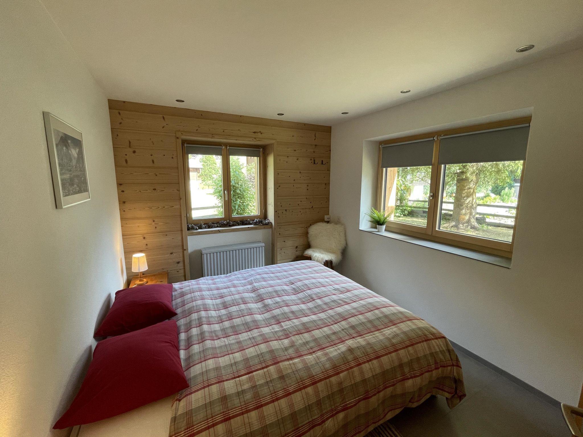 The bright 3-room apartment features an open living kitchen with modern amenities, including an induction stove, oven with microwave function, dishwasher, coffee machine, kettle, toaster and fondue burner. The living area includes a sofa, dining table for four and a television. The master bedroom has a comfortable double bed (1.60 m) with plenty of storage space, while the second bedroom offers a flexible bed for one to two children. A children's bed and high chair are available upon request. The bathroom is equipped with a shower, hairdryer and towels. A separate storage room allows for the secure storage of sports equipment. The garden seating area provides additional space to relax.