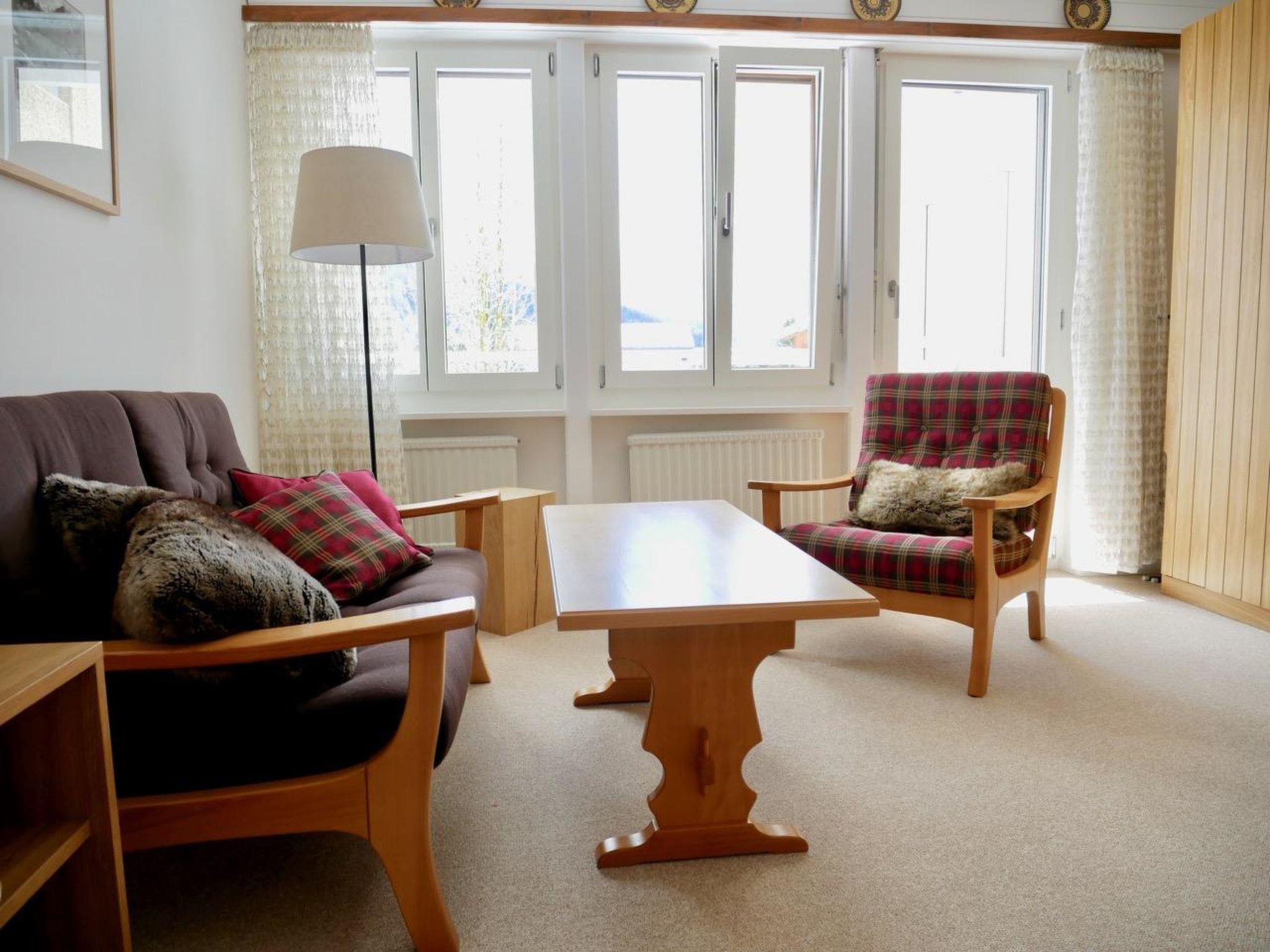 The 25 square meter studio was partially renovated in 2018 and offers a functional equipment in a homely atmosphere. A sunny south-facing balcony provides a beautiful view of the mountains. The combined living and sleeping area is furnished with two fold-out wardrobe beds. The kitchenette was renewed in 2025 and features 2 cooking hobs (plus one additional mobile), an oven, a dishwasher and two coffee machines (Nespresso + drip coffee). Other amenities include a bathroom (completely renovated in 2025), toilet, flat-screen TV and Wi-Fi. The house also has a washing machine, a dryer and storage rooms for skis, bicycles and luggage.