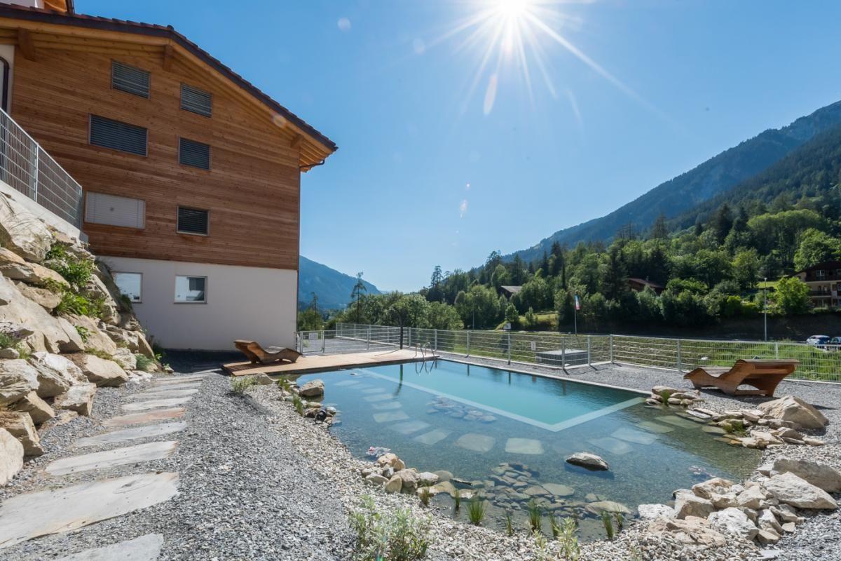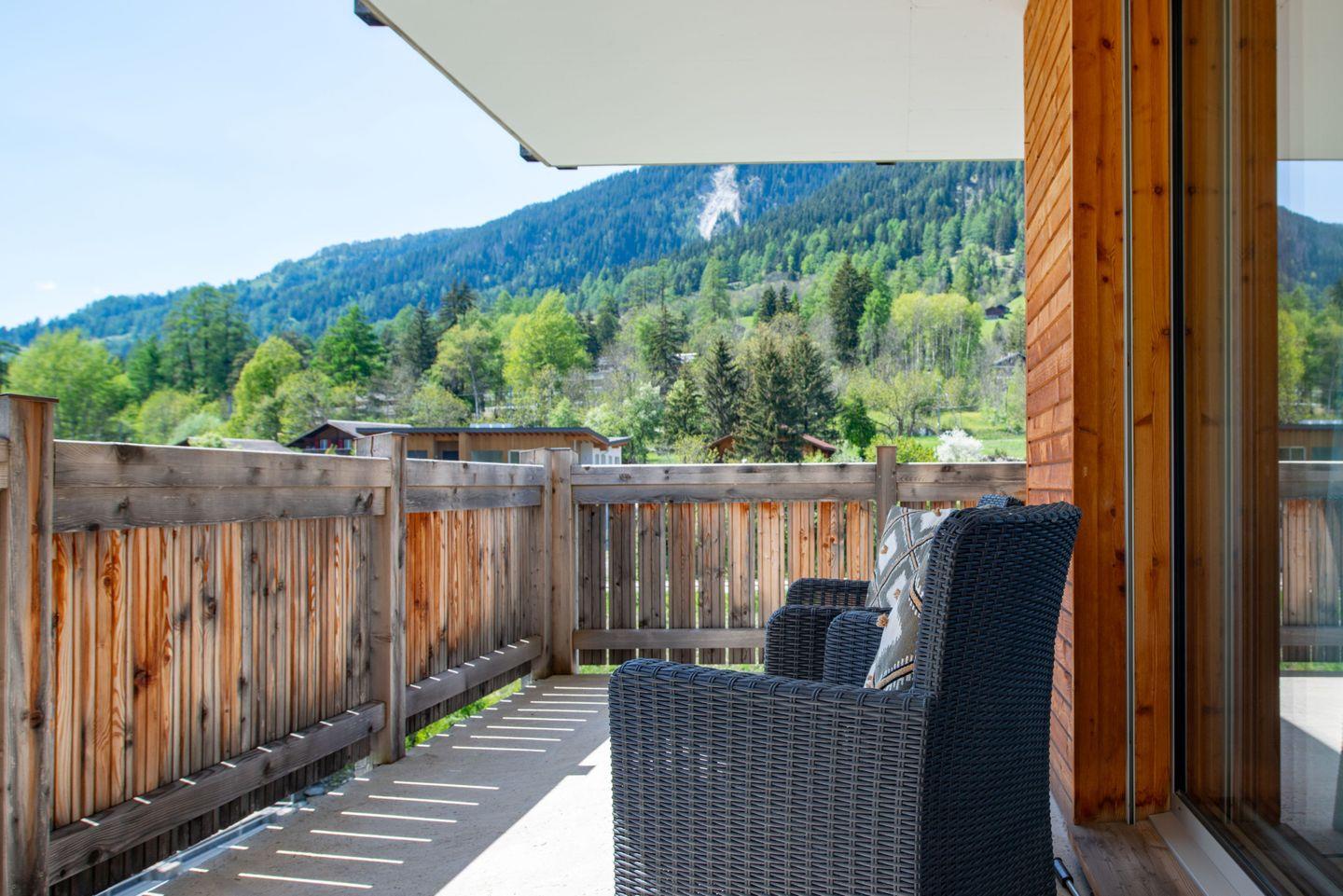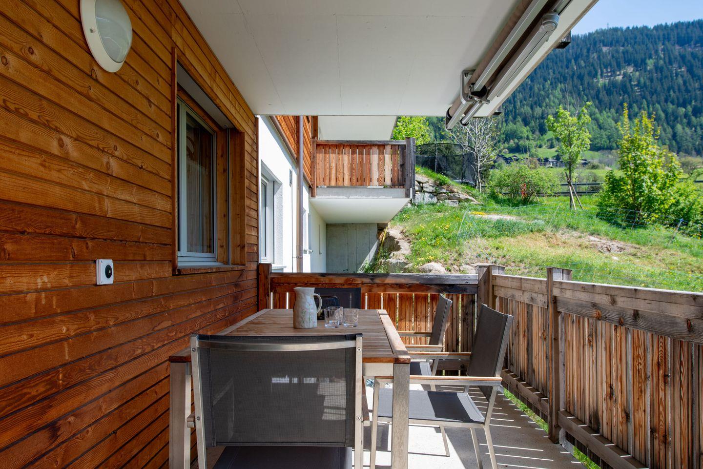 Entspannen Sie in der privaten 4-Personen-Sauna oder erfrischen Sie sich im Gemeinschaftsschwimmteich (im Winter geschlossen). Der großzügige Balkon lädt zum Verweilen ein – mit Grill, Esstisch und Liegemöglichkeiten – perfekt für Sonnenuntergänge mit Blick ins Rhonetal.