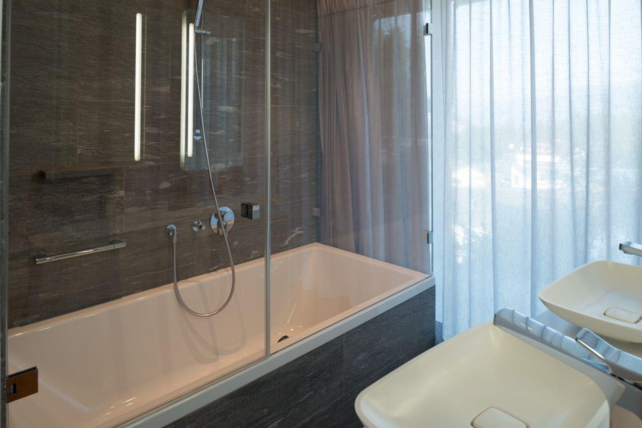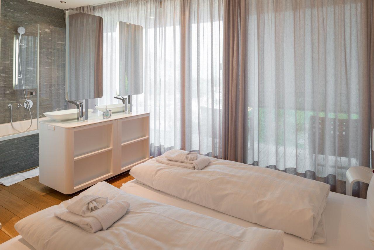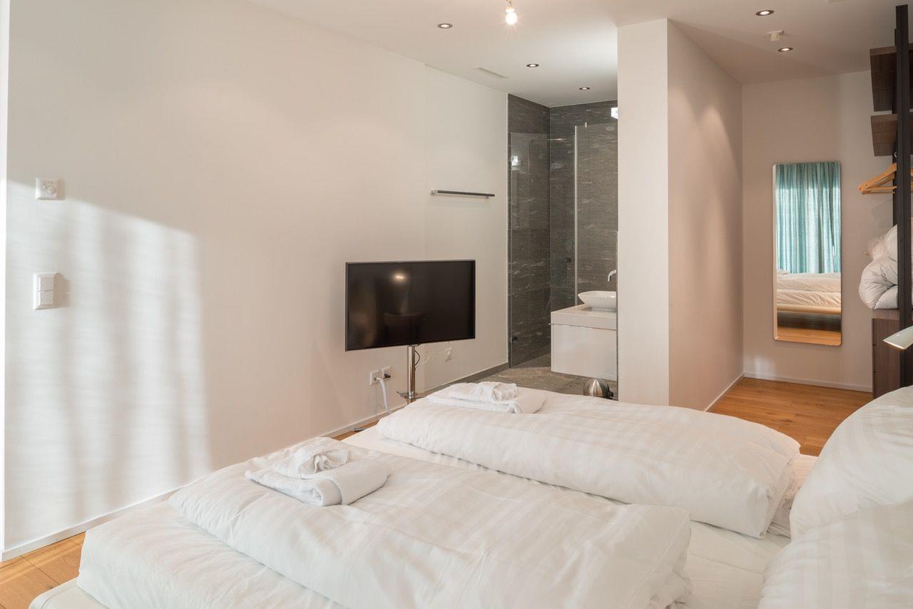 Luxuriöse 4.5 Zimmerwohnung, 3 Schlafzimmer mit TV und jeweils eigenem Badezimmer mit Badewanne (teilweise freistehend im Zimmer) oder Dusche, 240m2 Wohnfläche mit Fussbodenheizung in der Luxus-Ferienwohnungresidenz The Mountain Suites. Nur 10 Gehminuten von der Talstation Flims entfernt. Die Suite ist verfügbar für max. 6 Erwachsene und 2 Kinder. Die Wohnung befindet sich im Hauptteil und liegt im 4. Obergeschoss mit Blickrichtung Nordost und bietet fantastische Aussicht auf die umliegende Bergwelt (Crap Sogn Gion, Tschingelhörner und Flimserstein).
