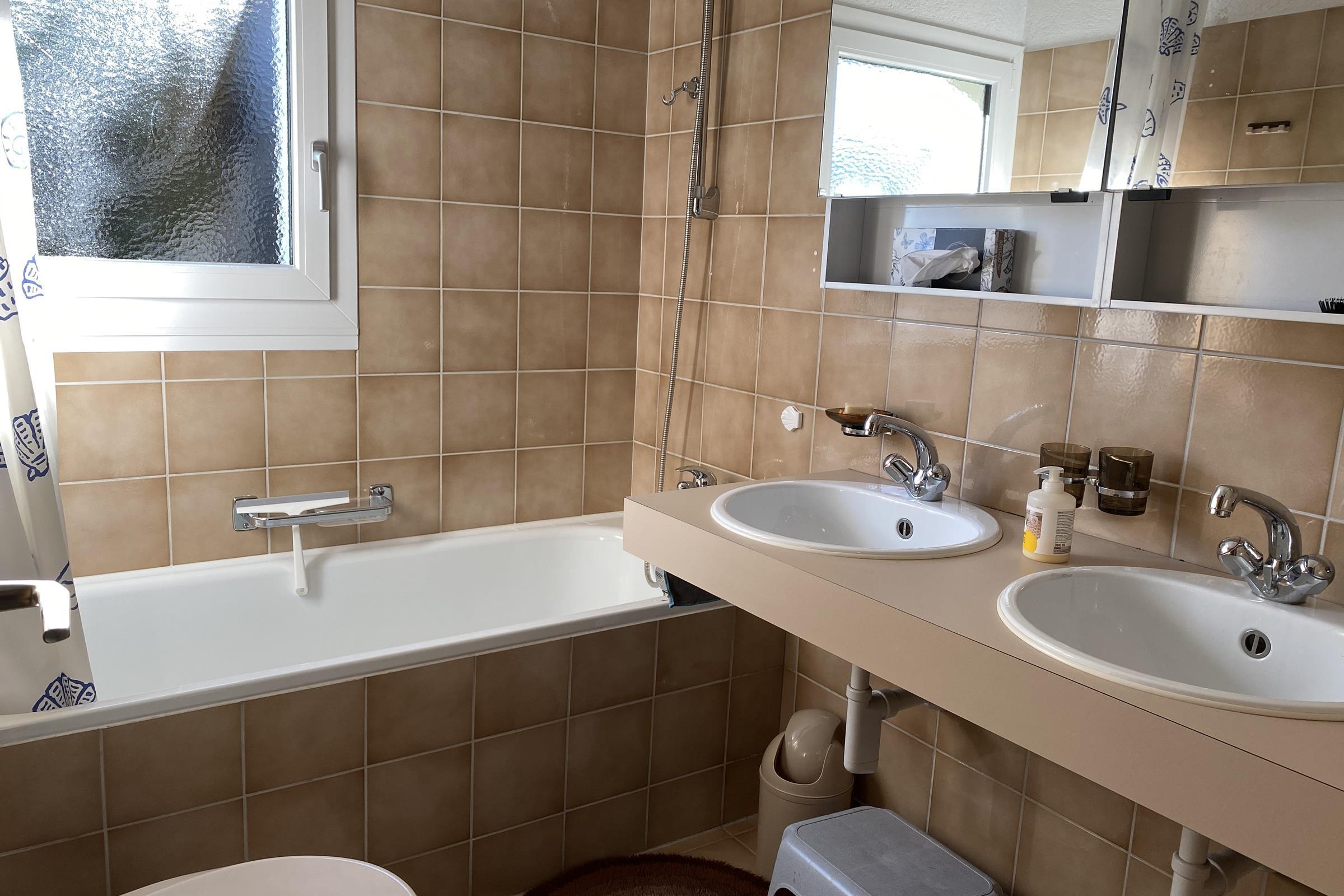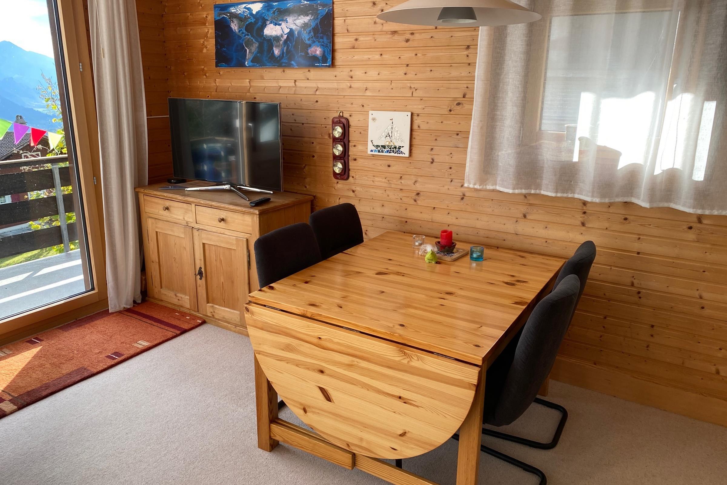 The 3.5-room apartment is comfortably furnished. It has a balcony with a view of the mountain panorama, a parking space and a garage for small to medium vehicles.