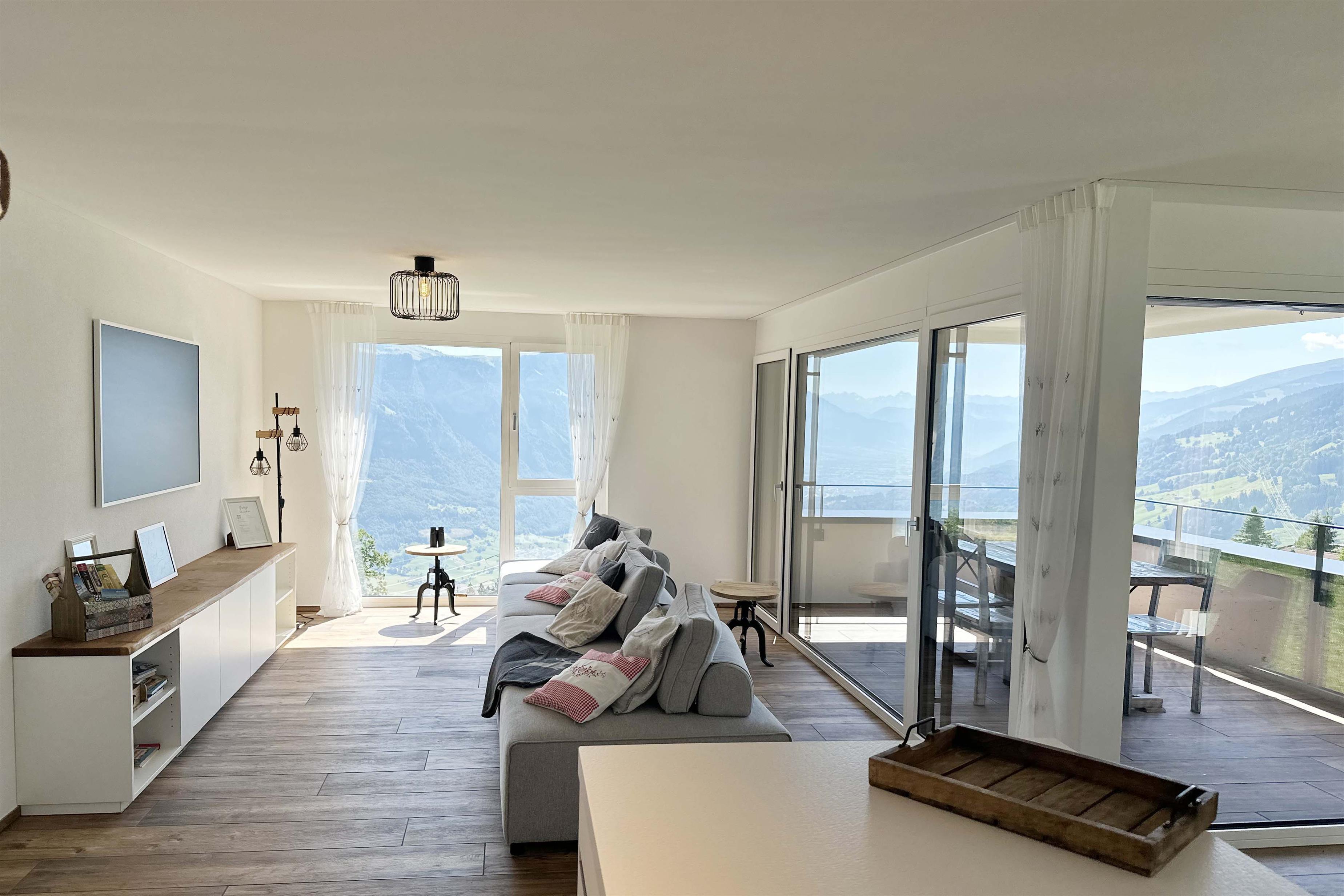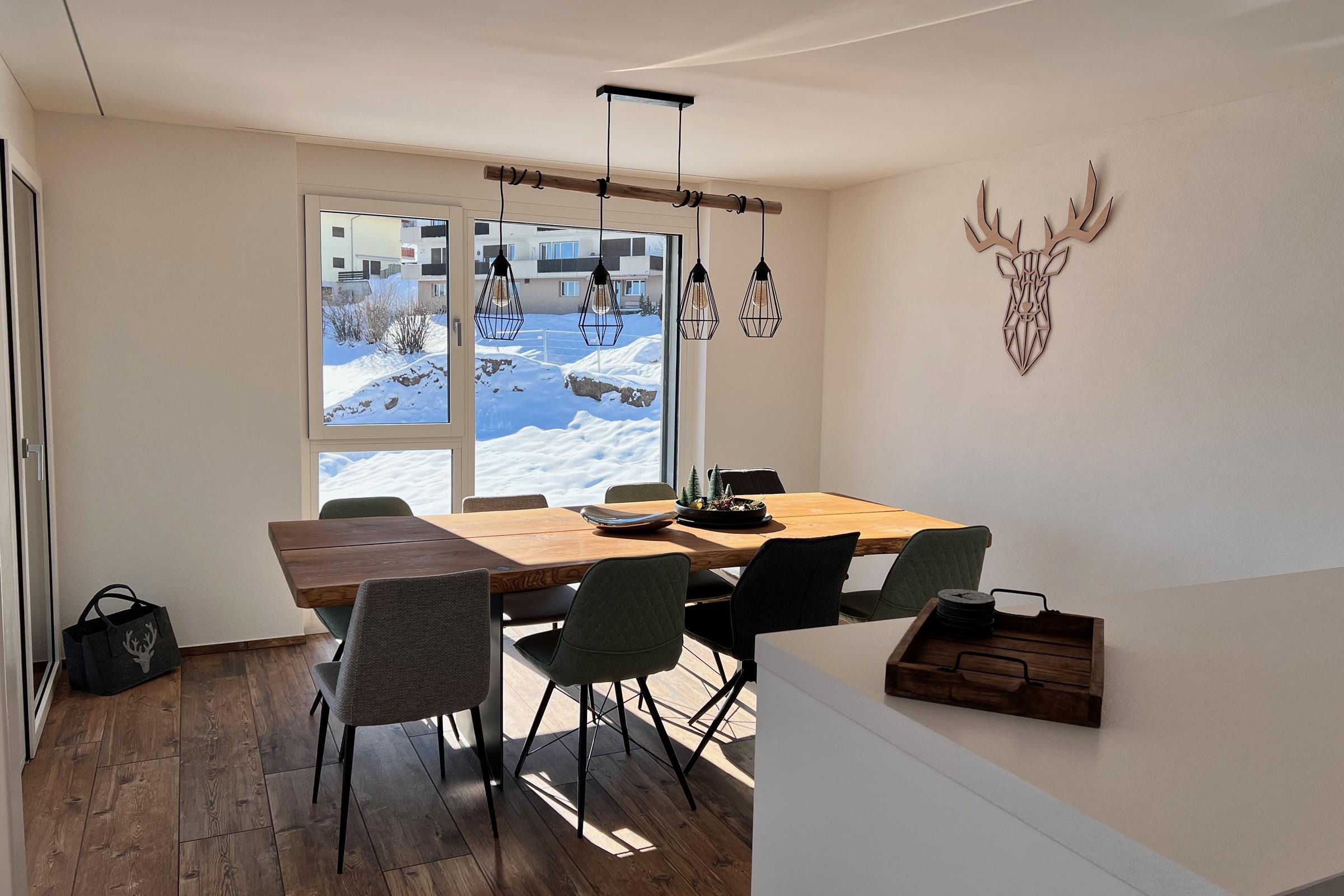 The 4.5-room apartment, located on the 2nd floor, with its floor-to-ceiling windows, offers enough space for 8 people. It has a large balcony with a view of the surrounding mountain panorama, two desks, a washing machine and a tumble dryer. A lockable heated ski room including ski boot dryer is available in the accommodation.