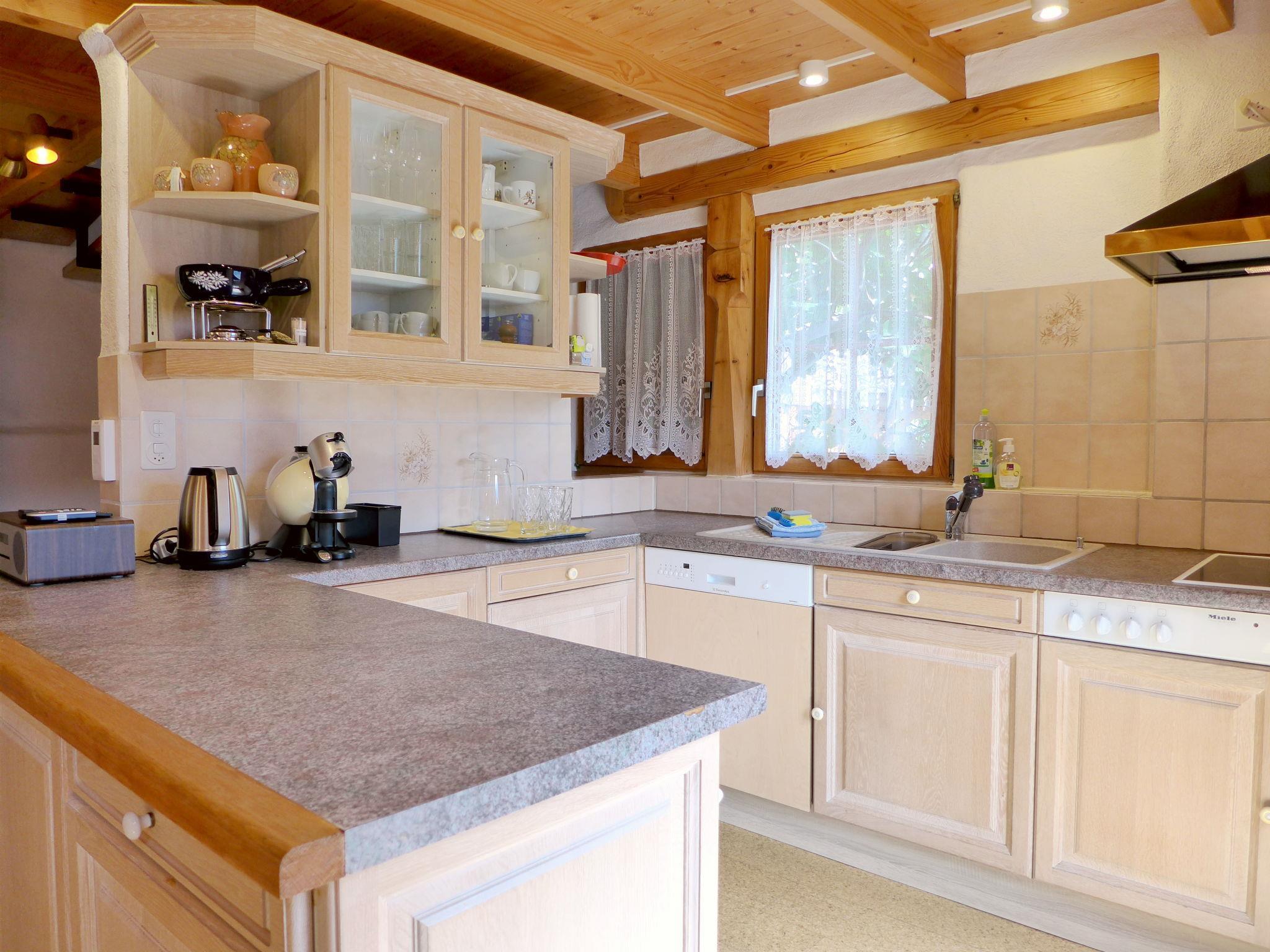 3-room house 95 m2 on 3 levels. Bright, partly with sloping ceilings, comfortable and rustic furnishings: open living/dining room with dining nook, radio and CD-player. Exit to the balcony, to the terrace. Open kitchen (oven, dishwasher, 4 ceramic glass hob hotplates, kettle, electric coffee machine, Capsules for coffee machine (Dolce Gusto) extra, raclette grill, fondue Set (cheese)). On the lower ground floor: shower, sep. WC. Electric heating. Top floor: 1 small double bedroom with 1 french bed (160 cm, length 200 cm). 1 open room with 2 beds (80 cm, length 200 cm). Balcony, terrace, south facing position. Terrace furniture. Marvellous view of the mountains and the countryside. Facilities: hair dryer. Internet (WiFi, free). Please note: fridge without freezer, non-smokers only, no parking. Smoke alarm, fire extinguisher.