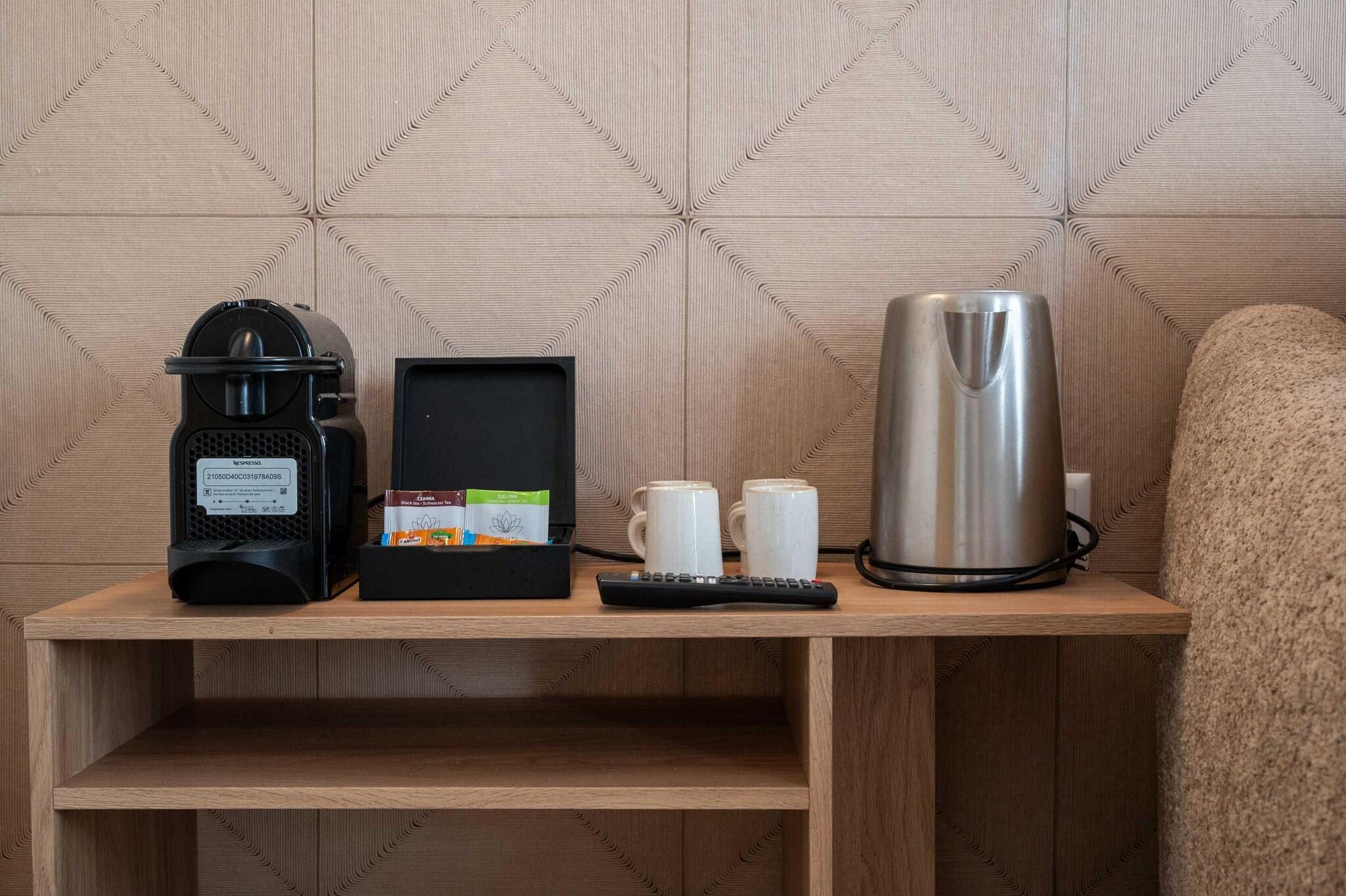 On the 1st floor: (Living room(double sofa bed, TV(flatscreen)), Kitchen(dining table, hob, electric kettle, coffee machine, combination microwave, fridge, electric hot plates, dishes and cutlery, Cooking basics, Wine glasses), bedroom(double bed, TV, heating), bathroom(shower, washbasin, toilet, hairdryer, shampoo, body soap)) air conditioning, iron, hot water, Extra pillows and blankets