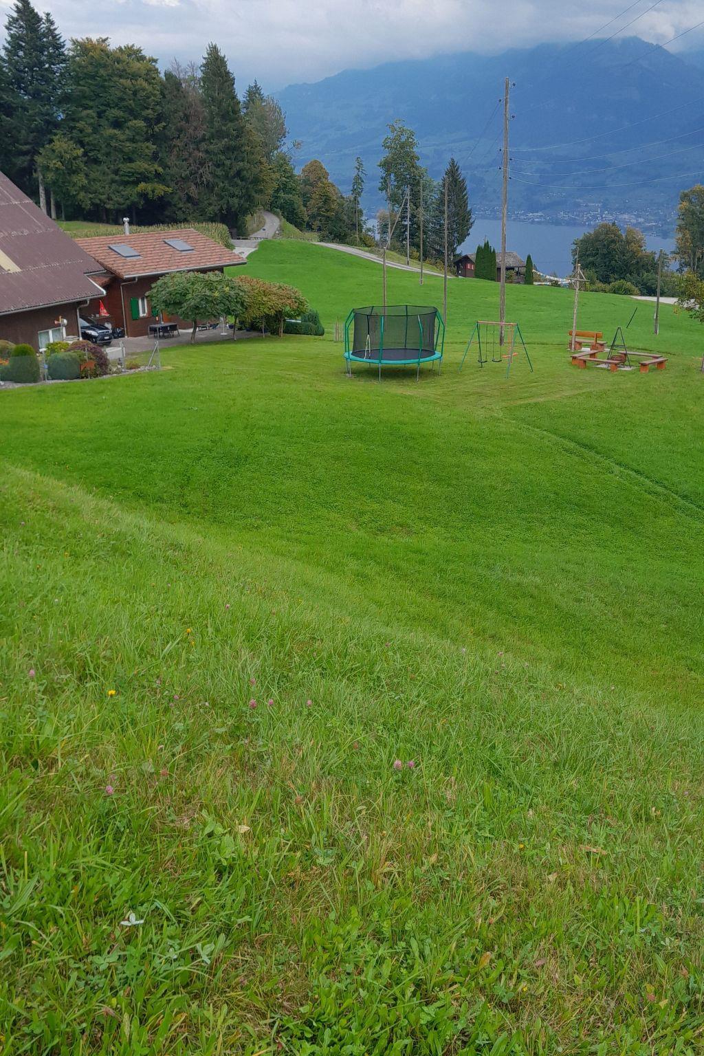 The house is situated at 950 metres above sea level with a view of the fascinating mountain world and Lake Sarnen. The access road leads from the mountain road 120 metres across the meadow to the property. (In spring and autumn with snow from Bergstrasse on foot to the rental property. ) (With NAVI, arrival via Schwezbachstrasse / Steinschladstrasse, but (At the roundabout do not take the first, but the second exit, at the next intersection not right, but straight ahead and in the forest after about 500 m turn right, follow the sign Interhome Steinschladstrasse. The NAVI will then guide you back down the mountain road to your destination on the right-hand side.