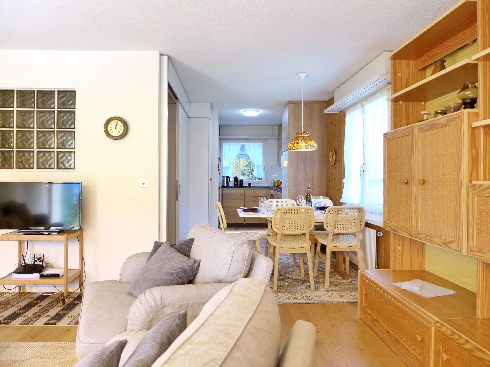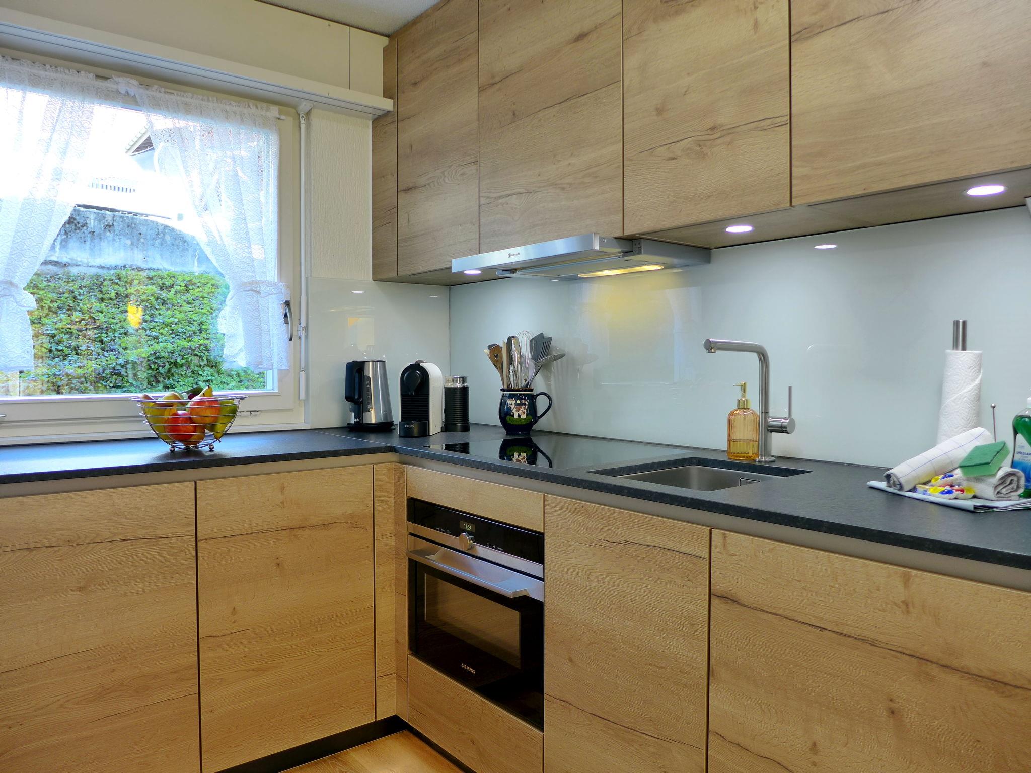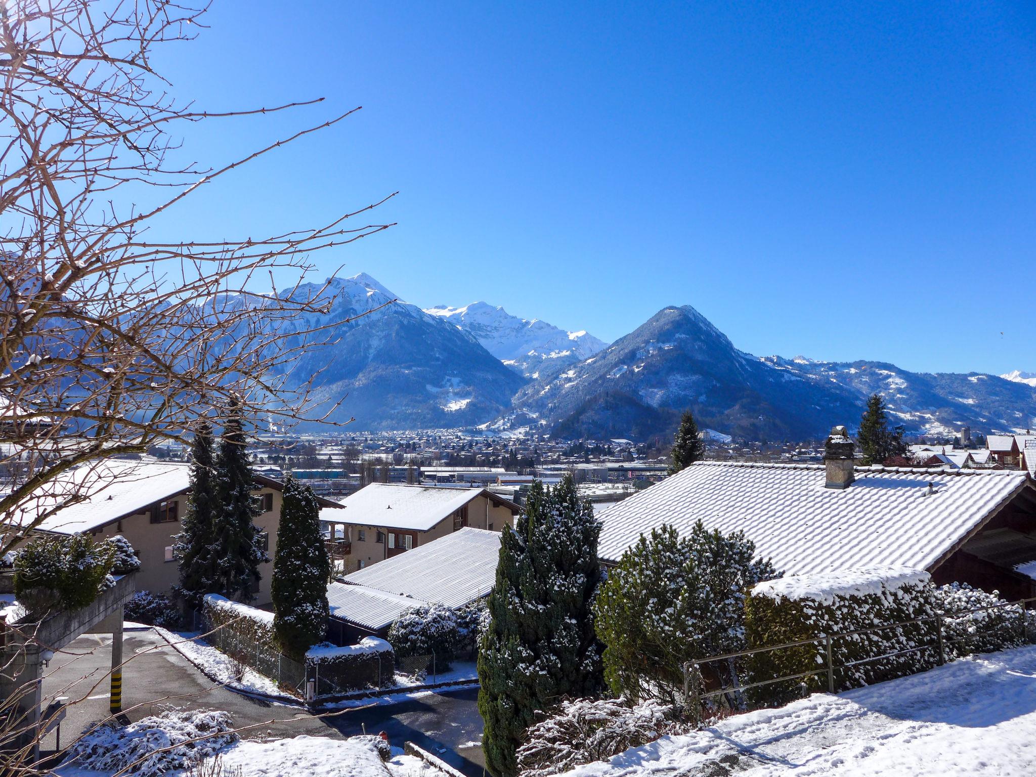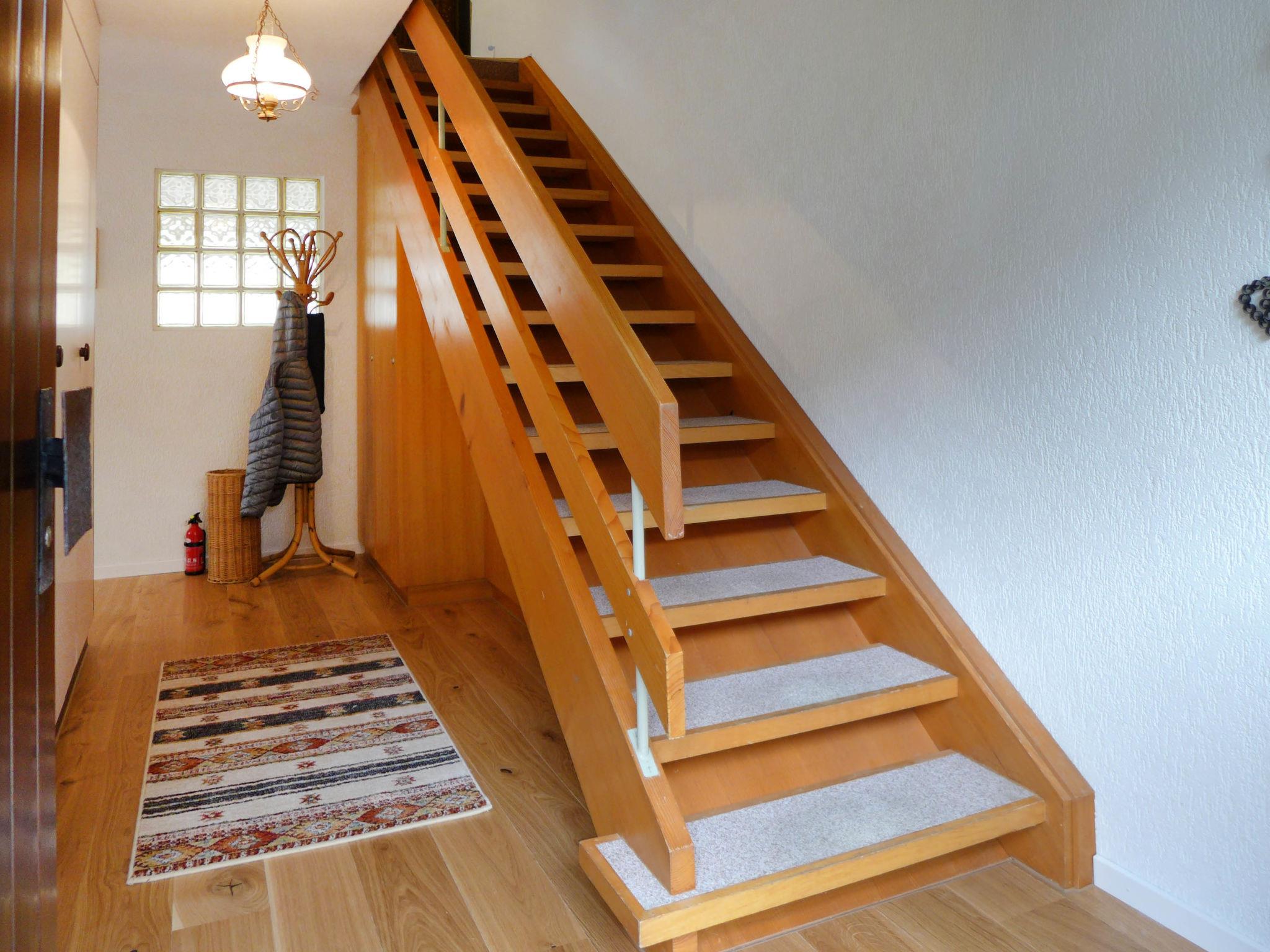 4-room terraced house 102 m2 on 2 levels, south facing position. Spacious and bright, partly renovated in 2024, practical and cosy furnishings: open living/dining room with panoramic window with cable TV, DVD and DVD collection available. Exit to the terrace, south facing position. Open kitchen (oven, dishwasher, 4 induction hot plates, toaster, kettle, microwave, electric coffee machine, Capsules for coffee machine (Nespresso) extra, raclette grill, fondue Set (cheese)) with dining table. Sep. WC. Upper floor: 1 large room with 1 double bed (2 x 90 cm, length 200 cm). 1 room with 1 bed (90 cm, length 200 cm). 1 room with 2 beds (90 cm, length 200 cm). Bath/WC, double hand-basin. Parquet floors, carpet. Terrace 14 m2, south facing position. Terrace furniture. Marvellous panoramic view of the mountains, the countryside and the town. Facilities: iron, children's high chair, baby cot for up to 2 year olds (extra), hair dryer. Internet (WiFi, free). Parking (1 car) at the house. Please note: suitable for families. Non-smokers only. Smoke alarm, fire extinguisher.