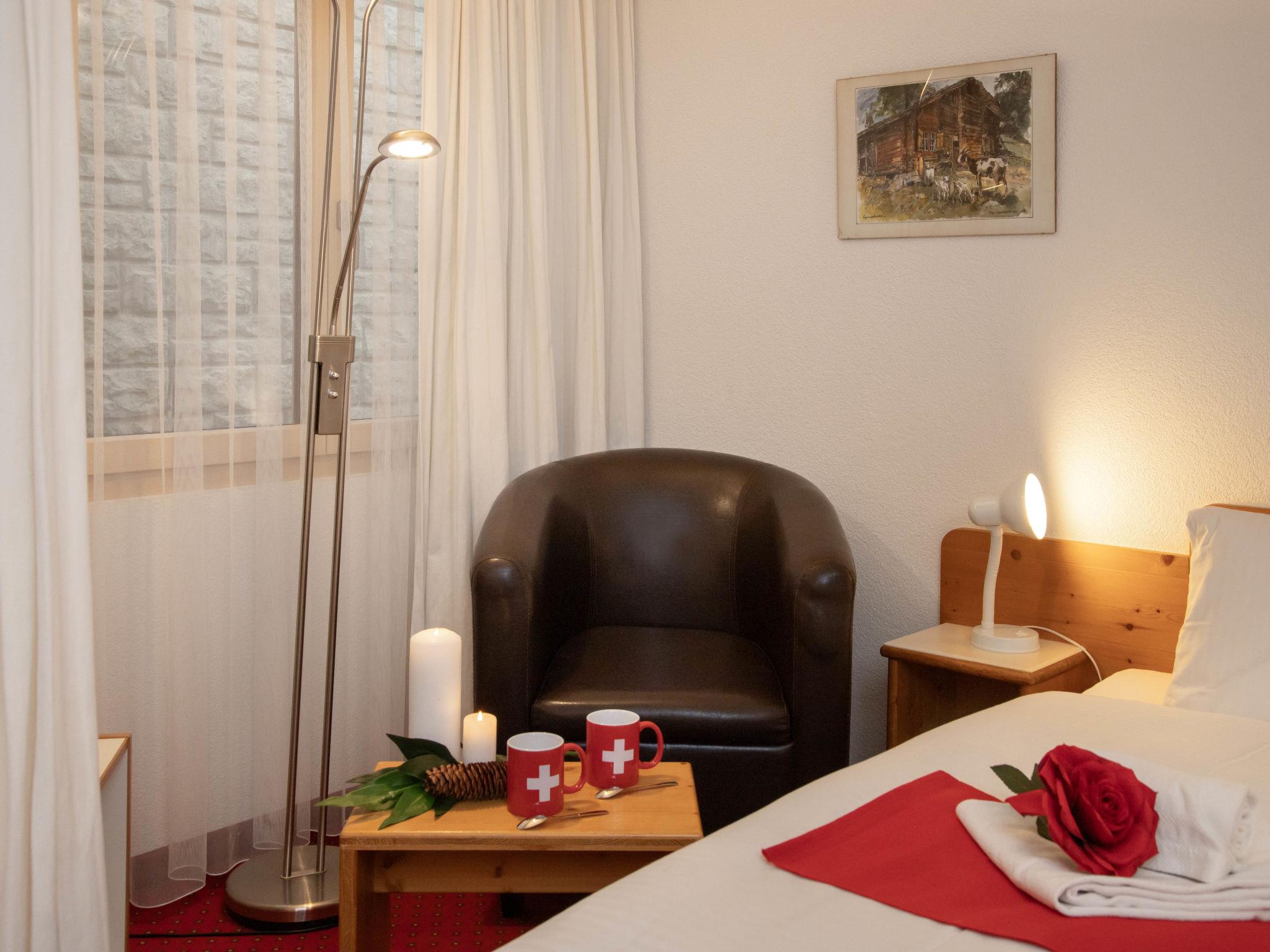 1-room apartment 21 m2 on 2nd floor. Living/sleeping room with 2 beds and cable TV (flat screen). Kitchenette (oven, 4 ceramic glass hob hotplates, toaster, kettle, electric coffee machine). Shower/WC. Floor heating. Carpet. No view. Facilities: hair dryer. Internet (WiFi, free). Please note: non-smokers only. Maximum 1 pet/ dog allowed. A fondue set (meat or cheese) and a raclette oven can be borrowed from reception.