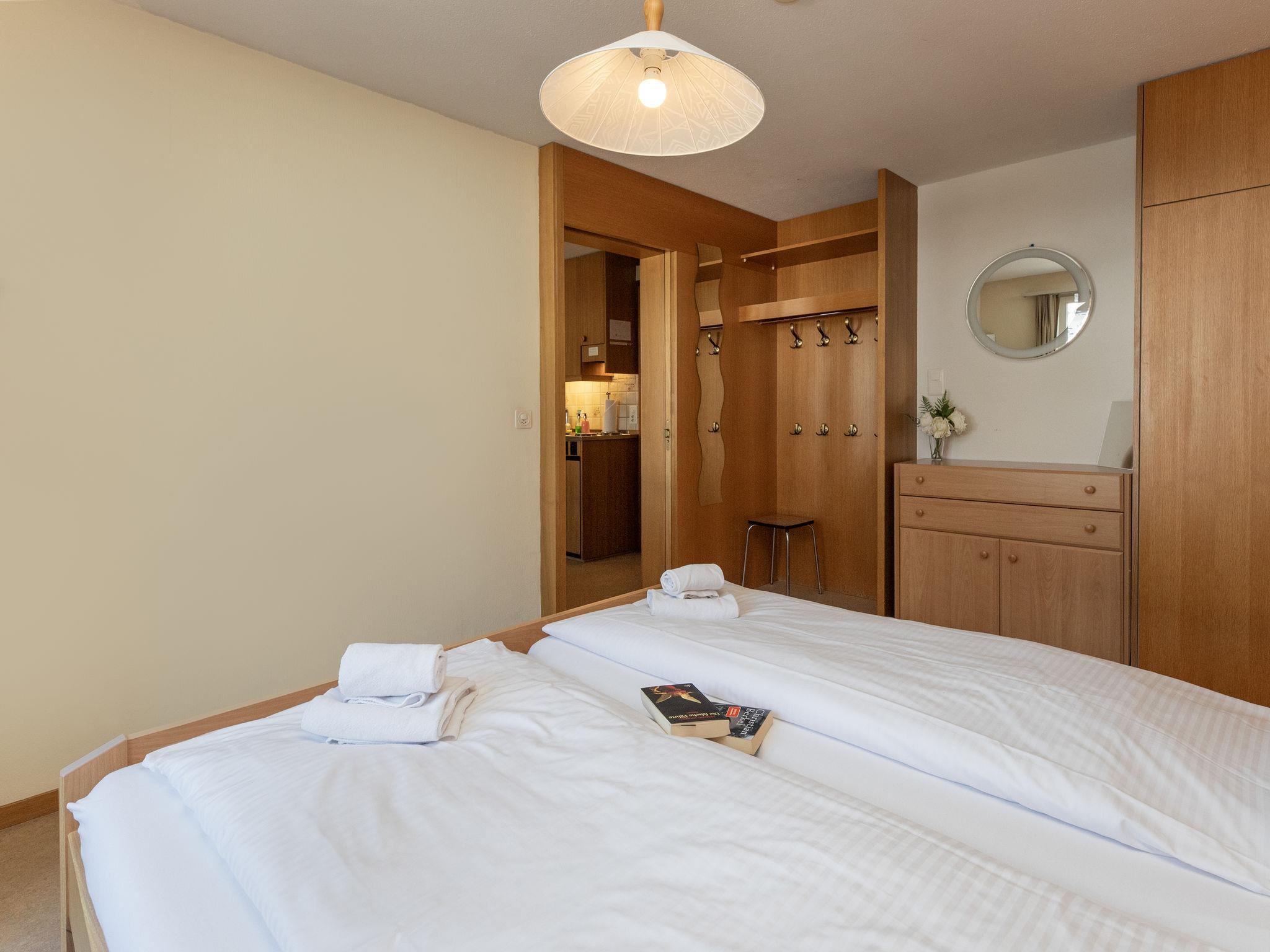 2-room apartment 30 m2 on 4th floor, south facing position. Practical furnishings: living/dining room with satellite TV (flat screen). Exit to the balcony, south facing position and west facing position. 1 room with 1 double bed (2 x 90 cm, length 200 cm). Exit to the balcony, south facing position and west facing position. Kitchenette (2 hot plates, toaster, kettle, microwave, electric coffee machine, raclette grill). Shower/WC. Parquet floors. Balcony 8 m2, south facing position and west facing position. Balcony furniture. Marvellous view of the mountains, the ski run, the resort and Eiger. Facilities: hair dryer. Internet (WiFi, free). Parking at the house. Please note: non-smokers only. Fire extinguisher, no lift. The bathroom is outside the apartment (1m, for private use).