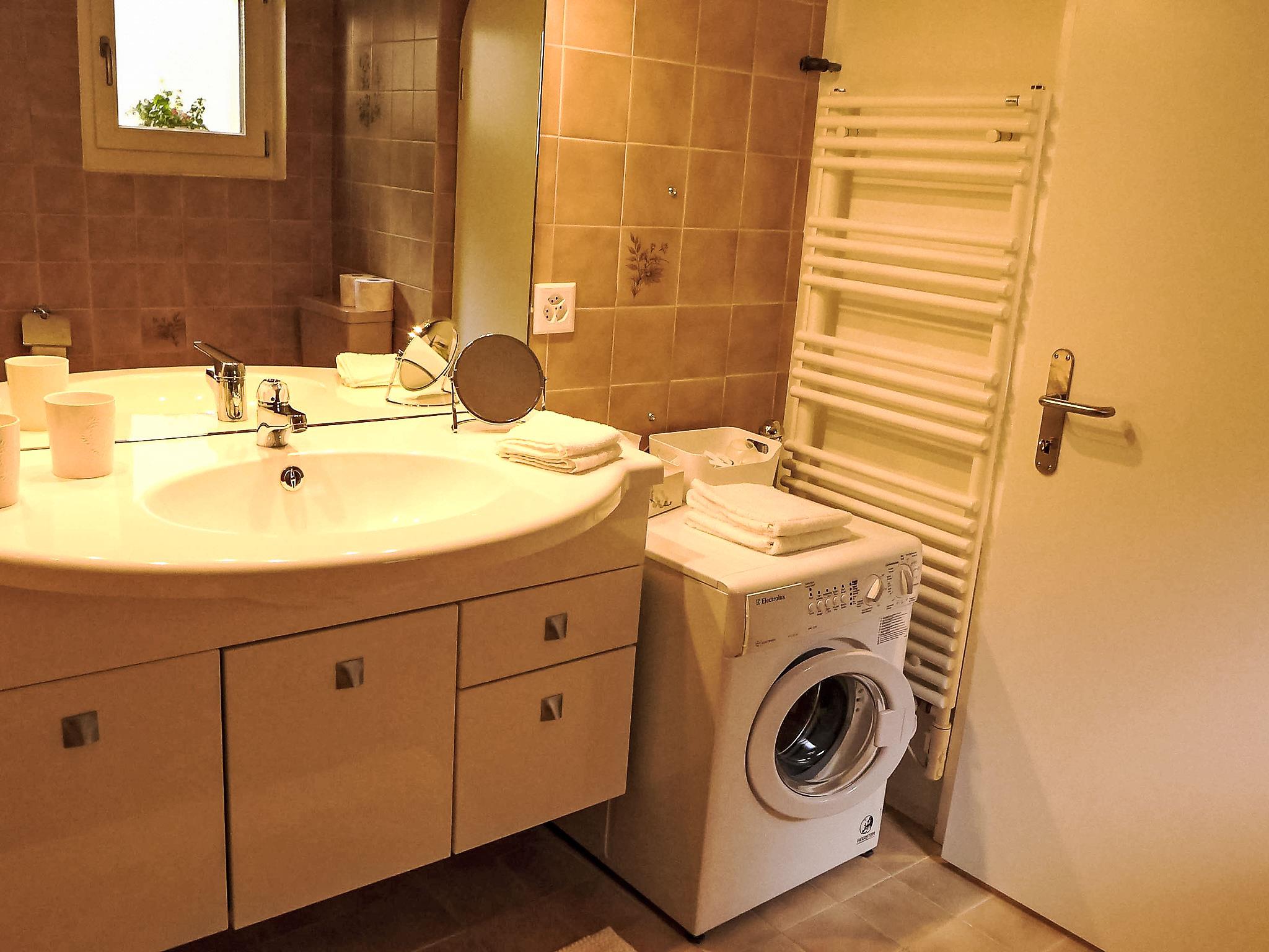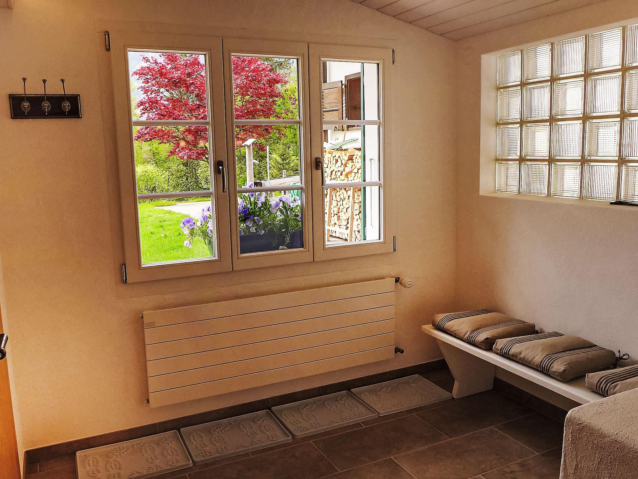 2-room apartment 50 m2, on the ground floor, south facing position. Fully renovated in 2014, beautiful and tasteful furnishings: living room, ceiling height 204 cm with cable TV (flat screen), radio. 1 room, ceiling height 204 cm with 1 double bed (2 x 90 cm, length 200 cm). Exit to the terrace, south facing position. Kitchen-/living room (oven, dishwasher, 4 ceramic glass hob hotplates, microwave, electric coffee machine, Capsules for coffee machine (Nespresso) extra, raclette grill, fondue Set (cheese)), ceiling height 187 cm. Exit to the terrace, south facing position. Bath/WC. Floor heating. Parquet floors, natural stone floors. Large terrace, south facing position. Terrace furniture, barbecue, deck chairs (2). Marvellous view of the mountains. Facilities: washing machine, hair dryer. Internet (WiFi, free). Parking at the house. Please note: non-smokers only. Fire extinguisher.