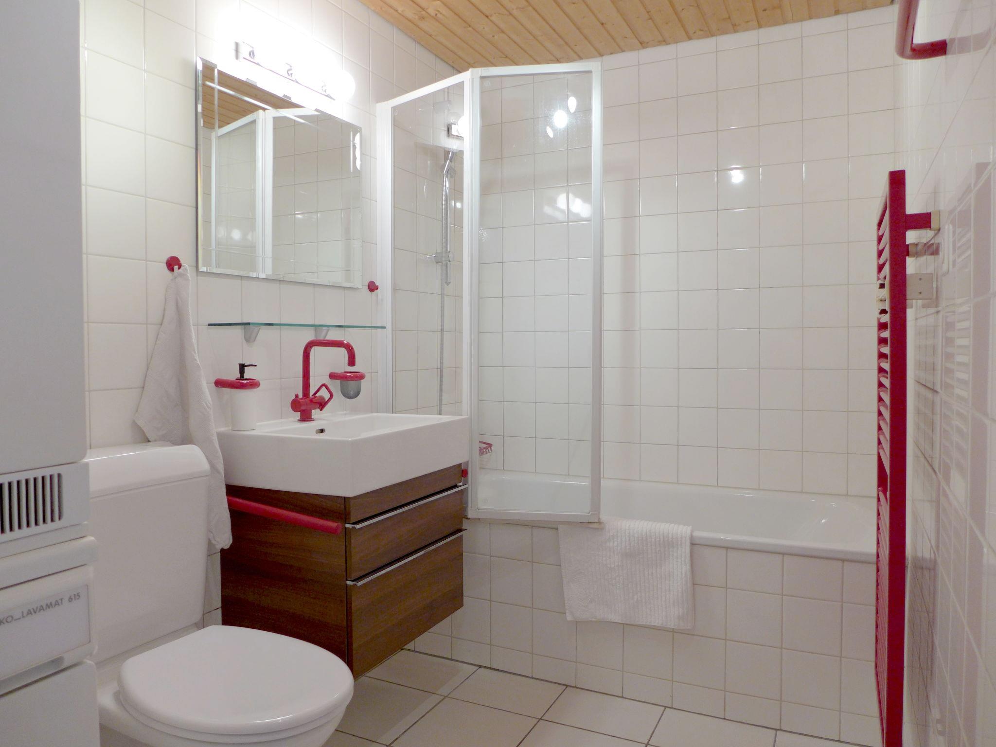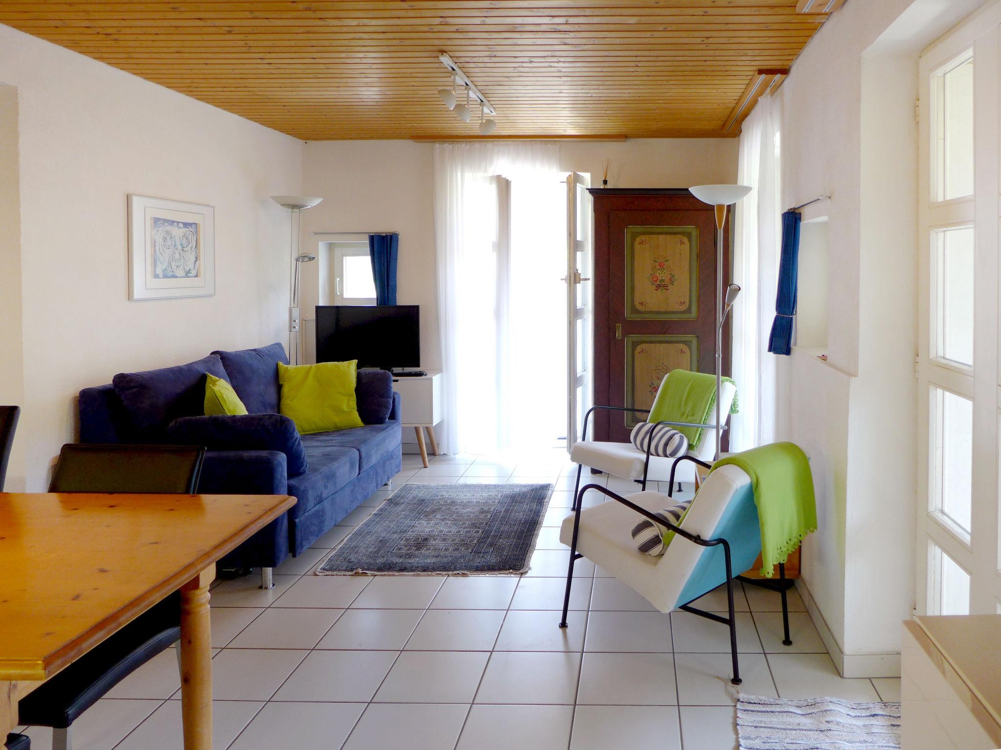 2-room apartment 40 m2, on the ground floor, south facing position. Bright, comfortable and cosy furnishings: open living/dining room with dining table, cable TV, radio, hi-fi system and DVD. Exit to the terrace. 1 room with 1 french bed (160 cm). Exit to the terrace. Open kitchen (oven, 4 ceramic glass hob hotplates, toaster, kettle, microwave, electric coffee machine, Capsules for coffee machine (Nespresso) extra, raclette grill, fondue Set (cheese)). Bath/WC. Underfloor heating. Terrace 20 m2. Terrace furniture, box-room. Marvellous panoramic view of the mountains and the countryside. Facilities: washing machine, dryer, baby cot. Internet (WiFi, free). Parking (roofed, 1 car). Please note: non-smokers only.