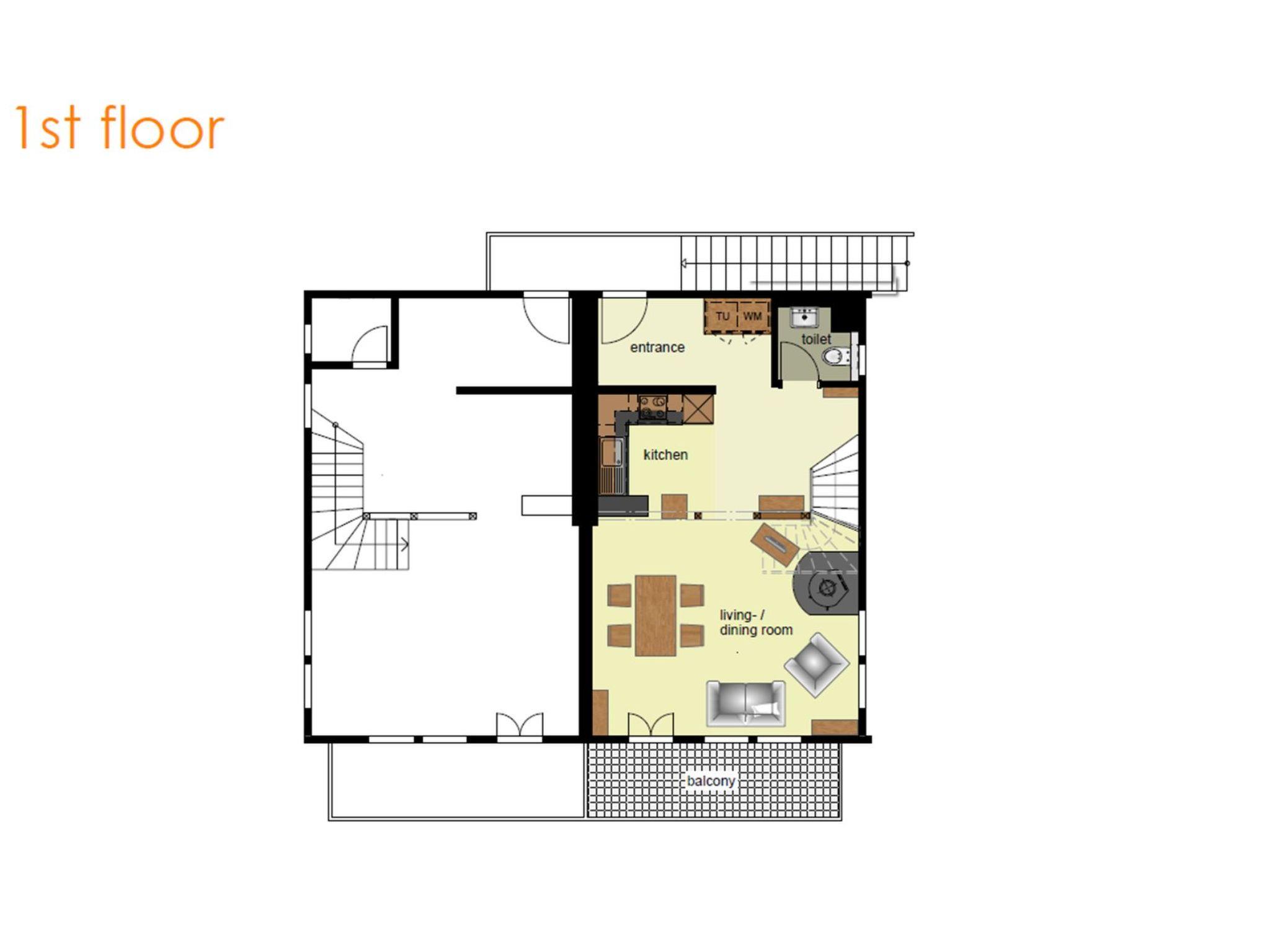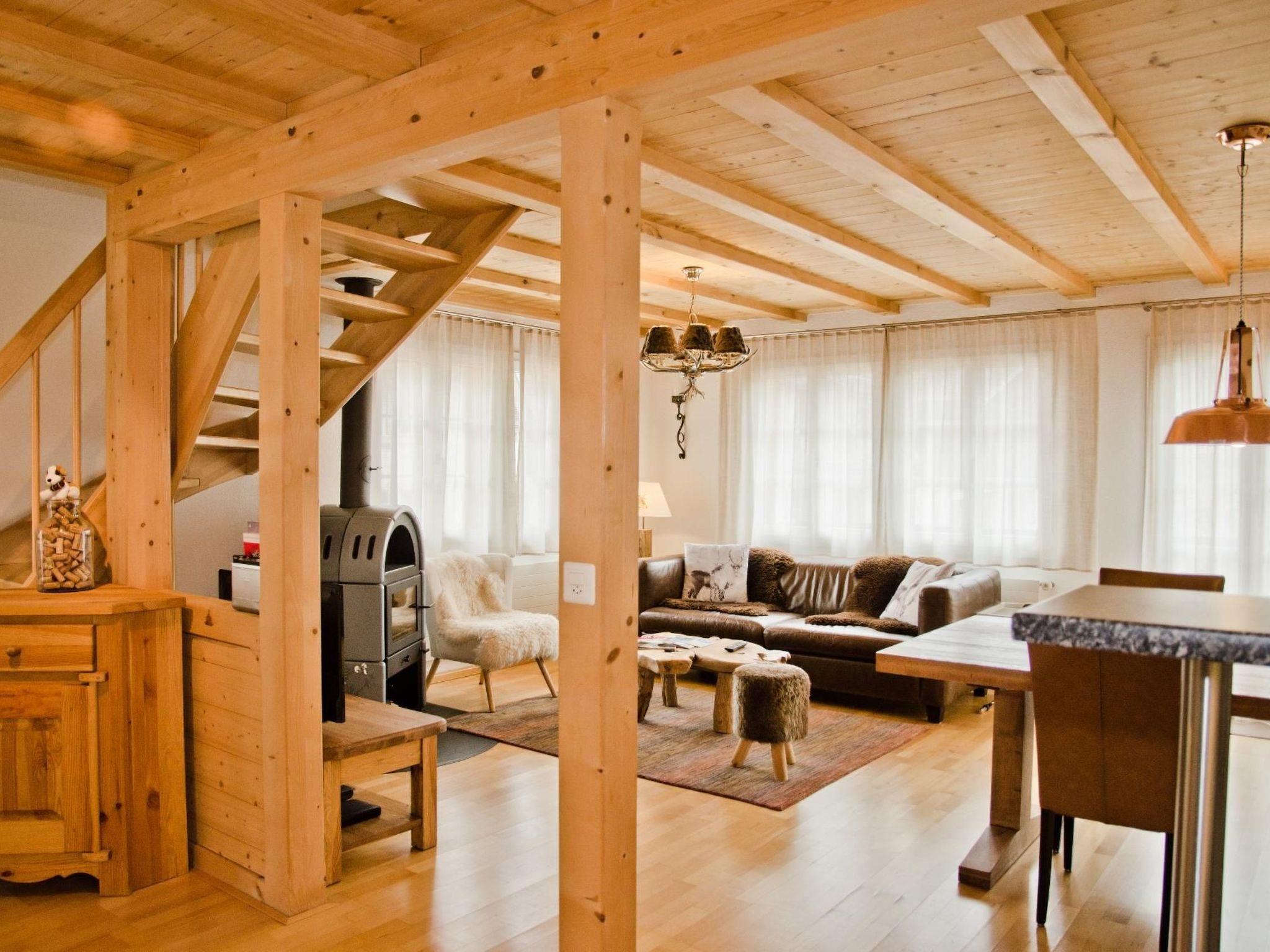 The 91m2 3.5-room maisonette is located on the 1st floor and consists of a bedroom with double bed, a bedroom with two single beds, a bathroom with shower and toilet and a separate toilet. The well-equipped kitchen opens onto a comfortable dining/living area with Scandinavian stove. From the balcony you can enjoy great views of the Eiger North Face.